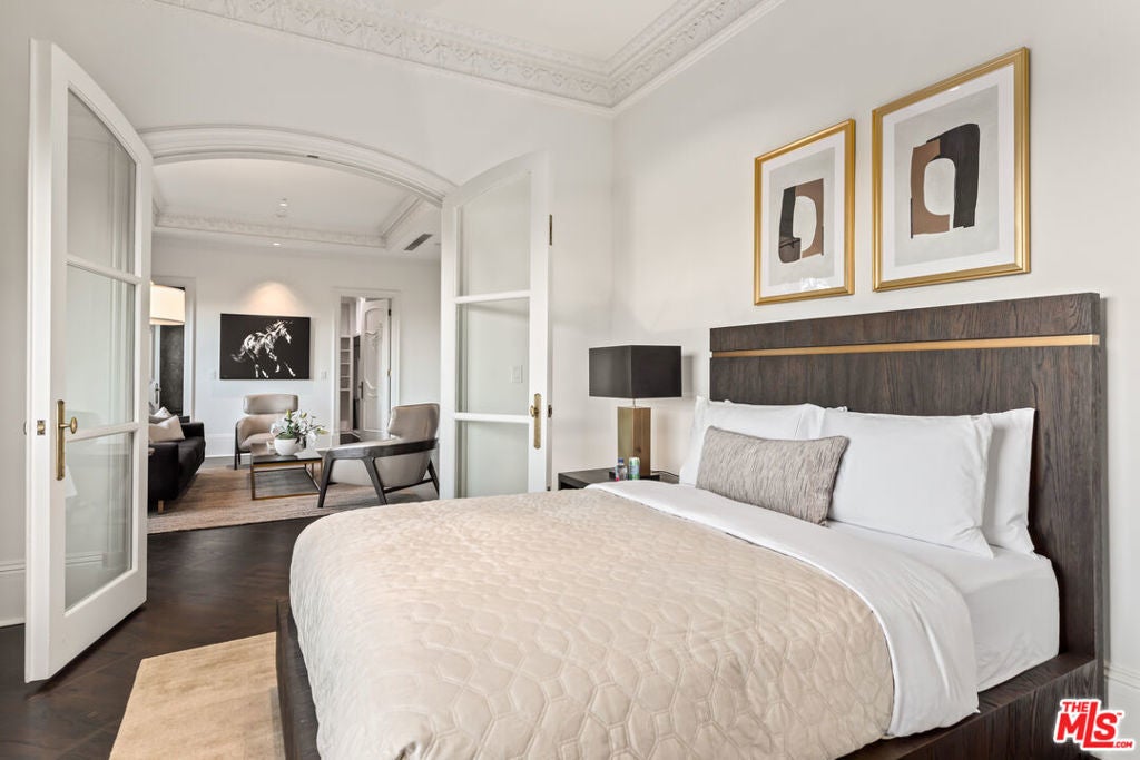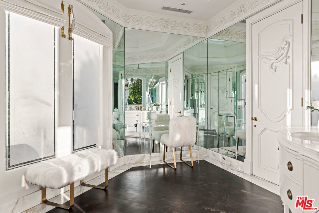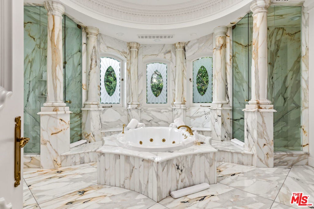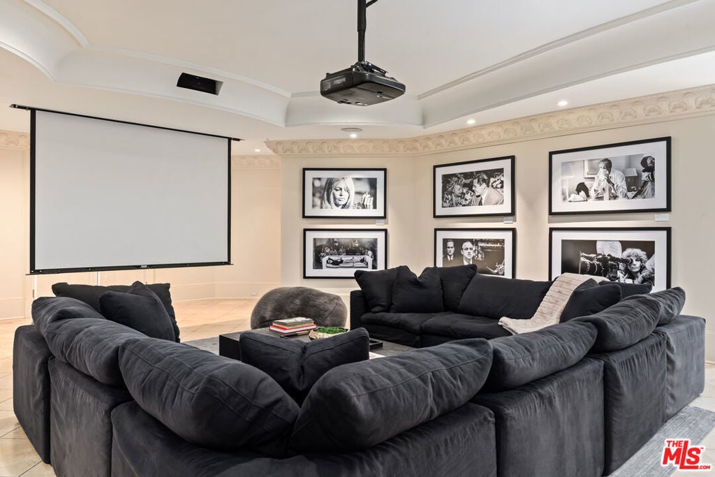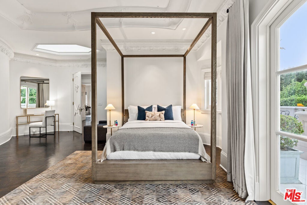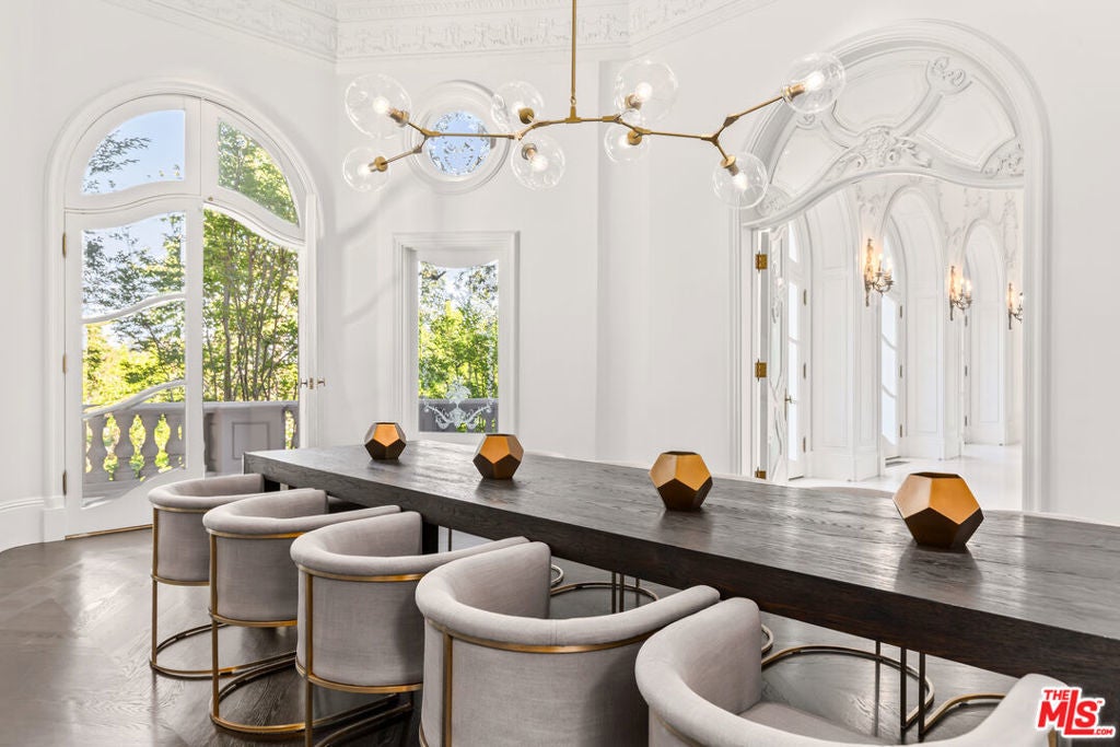 This stunning private estate, located in the prestigious city of Beverly Hills, combines timeless classical architecture with sleek contemporary interior design. Enter through grand double doors into an impressive foyer featuring soaring 30-foot ceilings and a striking bronze dual staircase, leading to a seamless indoor-outdoor layout. The formal rotunda entrance sets a tone of elegance, inspired by the refined style of the Peninsula Hotel in Paris. Blending European architectural elements, this home is a masterpiece of craftsmanship and detail.With 8 bedrooms, 12 bathrooms, and an array of formal spaces including family, living, and dining rooms with fireplaces, along with a library, bar, and media room, the estate is designed for both luxury and comfort. The custom-designed kitchen, created by Martin Pierce, includes a butler's pantry and top-of-the-line appliances. The master suite features dual bathrooms, spacious walk-in closets, and an attached private office.The impeccably landscaped grounds are an oasis, featuring a cascading pool, spa, shaded seating areas, and vibrant gardens. Ideal for hosting large gatherings, the property also offers a warm and welcoming atmosphere for intimate family living.
