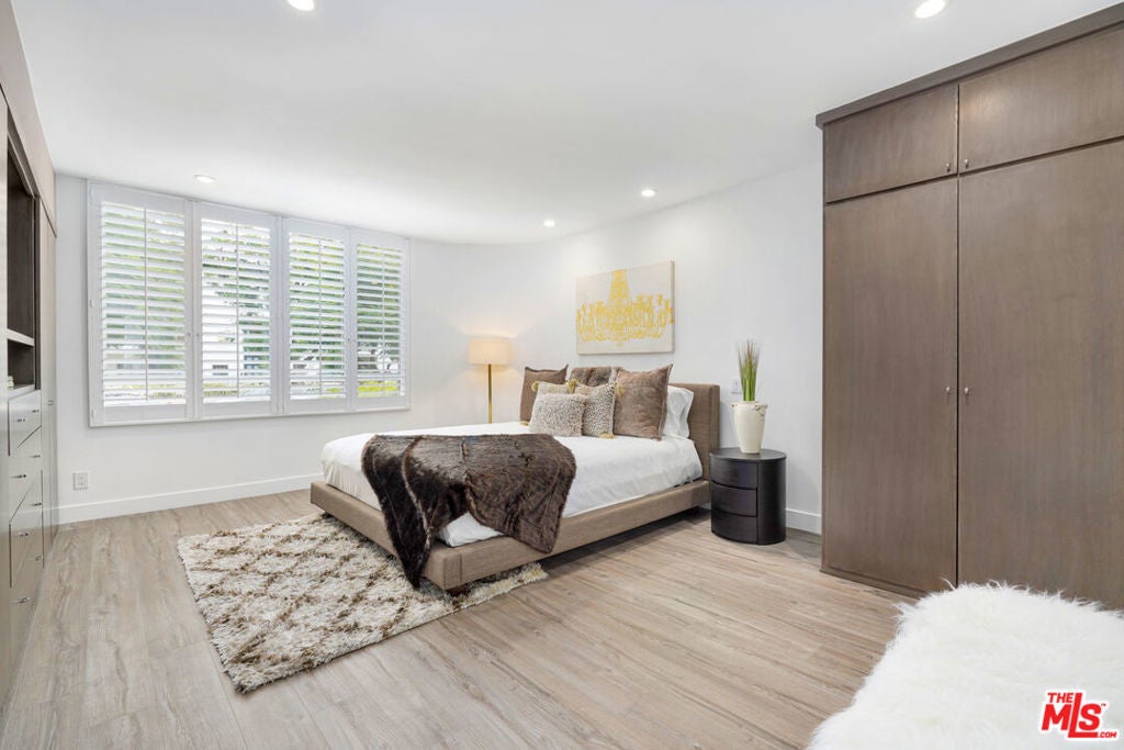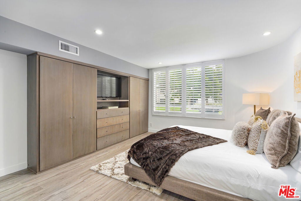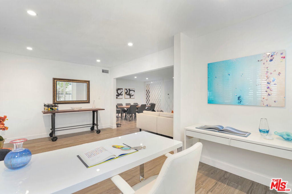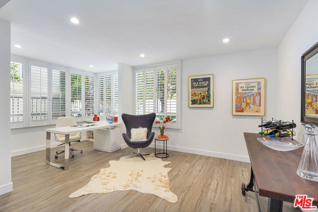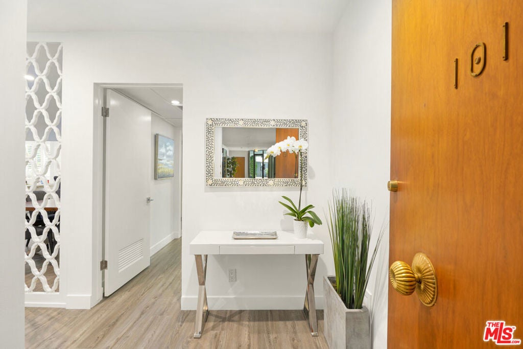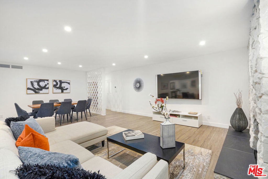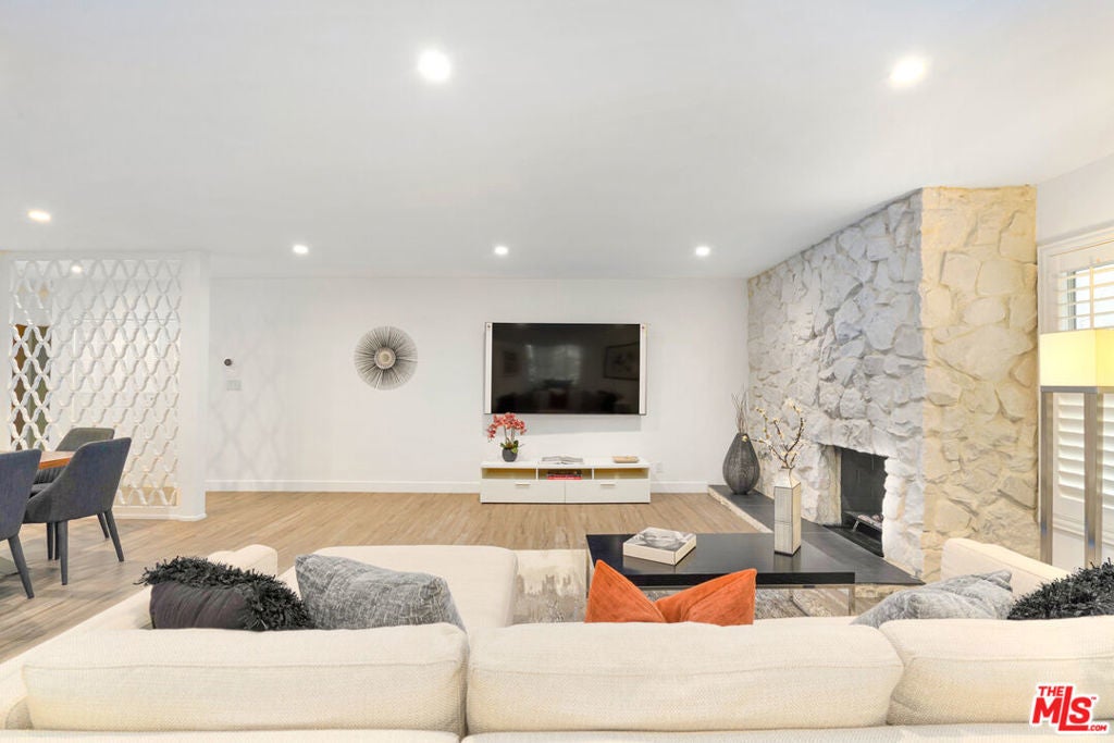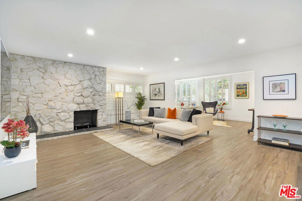 Discover a rare opportunity to reside on one of Beverly Hills' most coveted tree-lined streets within the prestigious Beverly Oakhurst Building, a classic mid-century modern concrete structure. This radiant, renovated corner unit enjoys the convenience of a first-floor location, offering an enriched entry through the elegantly remodeled lobby and sitting area. Upon entering, be greeted by newly installed designer vinyl hardwood plank floors that gracefully flow through the expansive open floor plan. The generously sized living room features a timeless brick fireplace with a gas starter, providing a warm and inviting focal point. Adjacent to the living room, a spacious bonus room/office, enclosed in glass, offers breathtaking views of the lush landscaping and canopies of mature trees that adorn the neighborhood.The chic floor plan is ideal for entertaining, complemented by an upgraded cook's kitchen and an adjoining spacious dining area. A private hallway leads to an exquisite master bedroom, adorned with designer detailed closets and an ensuite bathroom featuring dual sinks, a separate tub, and a shower, all adorned with sparkling tiles. Additionally, the unit boasts a designer detailed powder room (with optional add-ons) and a new in-unit washer & dryer. Further enhancing the lifestyle is the building's array of amenities, including convenient subterranean parking just off the elevator, a pristine heated pool with a surrounding paver-tiled sun deck, and electronic state-of-the-art security access and camera systems to ensure excellent security. The building's prime location provides quick access to upscale grocery stores, restaurants, shops, the post office, and downtown Beverly Hills and West Hollywood. For added convenience, designer furniture is available separately, offering a full turnkey opportunity for the discerning buyer.