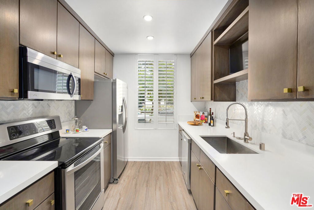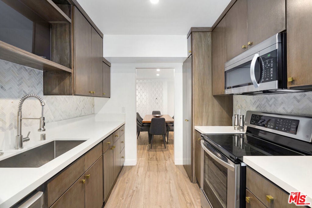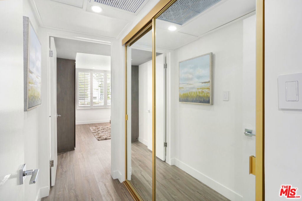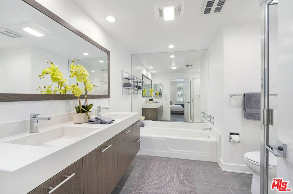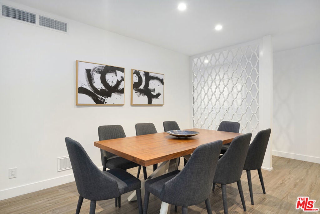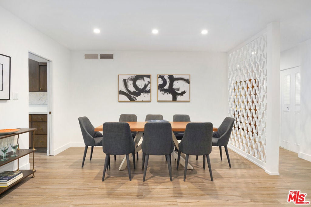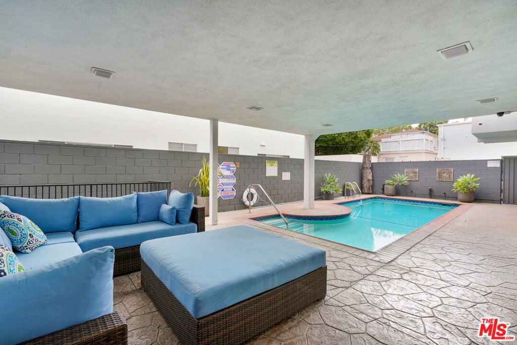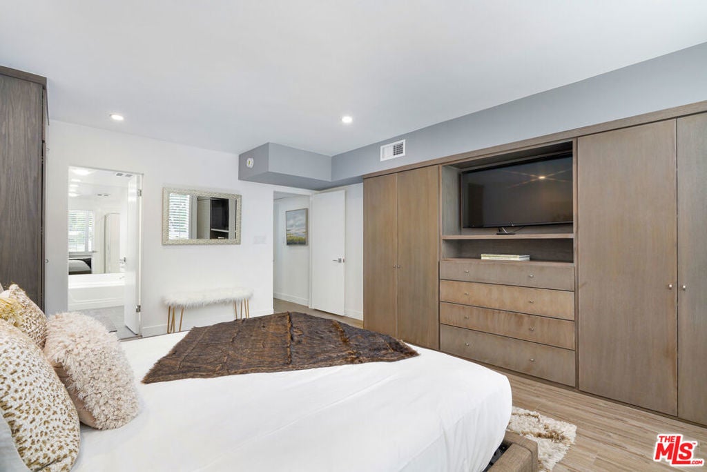 Discover a rare opportunity to reside on one of Beverly Hills' most coveted tree-lined streets within the prestigious Beverly Oakhurst Building, a classic mid-century modern concrete structure. This radiant, renovated corner unit enjoys the convenience of a first-floor location, offering an enriched entry through the elegantly remodeled lobby and sitting area. Upon entering, be greeted by newly installed designer vinyl hardwood plank floors that gracefully flow through the expansive open floor plan. The generously sized living room features a timeless brick fireplace with a gas starter, providing a warm and inviting focal point. Adjacent to the living room, a spacious bonus room/office, enclosed in glass, offers breathtaking views of the lush landscaping and canopies of mature trees that adorn the neighborhood.The chic floor plan is ideal for entertaining, complemented by an upgraded cook's kitchen and an adjoining spacious dining area. A private hallway leads to an exquisite master bedroom, adorned with designer detailed closets and an ensuite bathroom featuring dual sinks, a separate tub, and a shower, all adorned with sparkling tiles. Additionally, the unit boasts a designer detailed powder room (with optional add-ons) and a new in-unit washer & dryer. Further enhancing the lifestyle is the building's array of amenities, including convenient subterranean parking just off the elevator, a pristine heated pool with a surrounding paver-tiled sun deck, and electronic state-of-the-art security access and camera systems to ensure excellent security. The building's prime location provides quick access to upscale grocery stores, restaurants, shops, the post office, and downtown Beverly Hills and West Hollywood. For added convenience, designer furniture is available separately, offering a full turnkey opportunity for the discerning buyer.