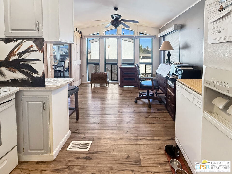 Discover Your Ideal Desert Retreat Move-In Ready! Step into this beautifully furnished manufactured home, complete with a versatile bonus room currently used as a cozy den, but easily transformed into a second bedroom with its stylish barn door. Enter through the sliding door, where you'll be greeted by a spacious, covered carport and a charming outdoor sitting area with a tiled floor: perfect for relaxing. Inside, the open-concept kitchen comes fully equipped with modern appliances: stove, microwave, dishwasher, refrigerator, and even a washer and dryer. The electric fireplace adds warmth and ambiance, while the laminate wood flooring and tall windows fill the home with natural light. The spacious bedroom features mirrored closet doors and a built-in dresser, offering plenty of storage. The bathroom is designed for ease and comfort with a convenient walk-in tub. Nestled at the base of the stunning desert mountains, this home is located in Sungate, a secure, 55+ Park Model/RV community. Just minutes from the airport, shopping, restaurants, casinos, and scenic hiking trails, convenience is at your doorstep. The community offers resort-style amenities, including two swimming pools, hot tubs, a fitness center, library, laundry facilities, and a community center that hosts year-round events.Don't miss out on this opportunity to embrace the desert lifestyle. Schedule your tour today and make this beautiful home yours! HOA is $232/mo and land lease is approx $96/mo.