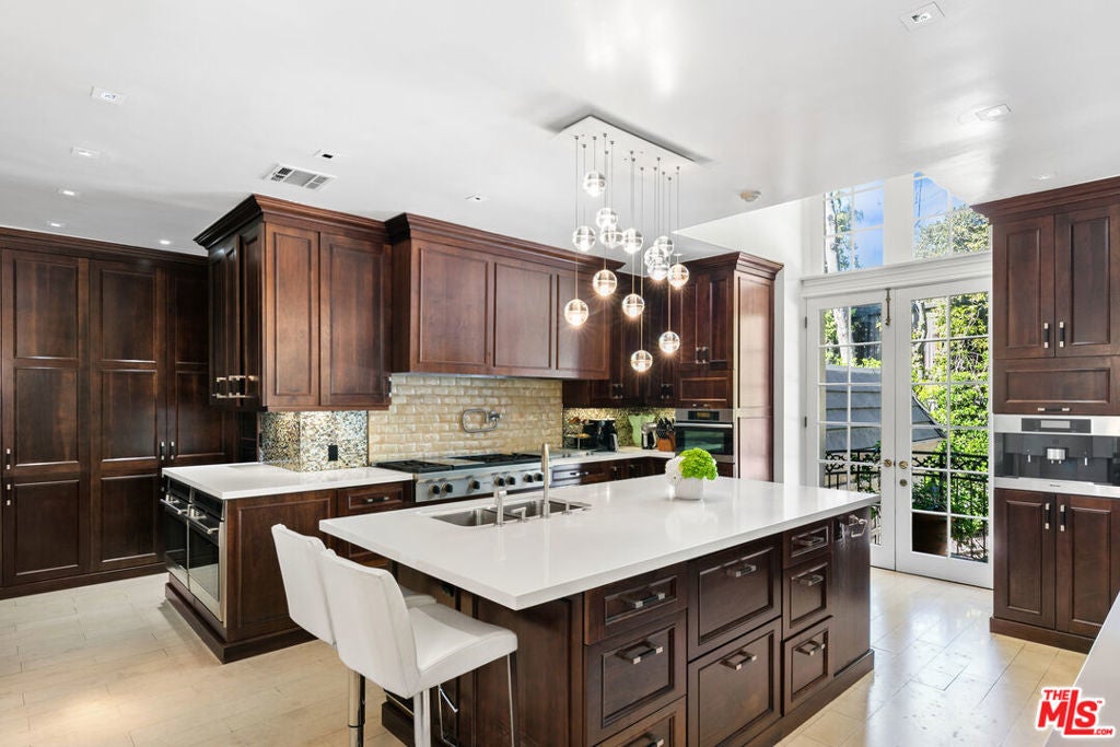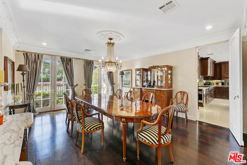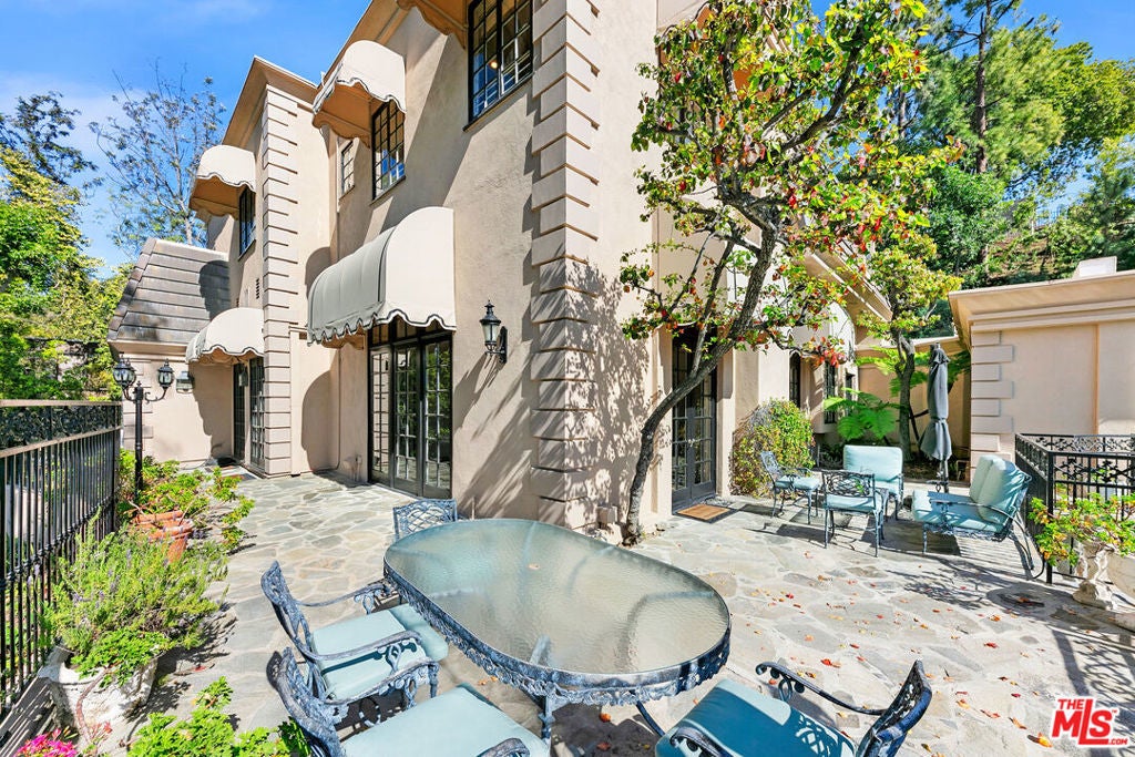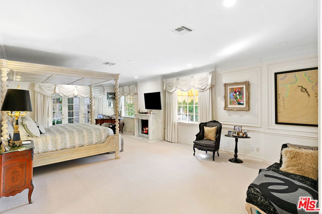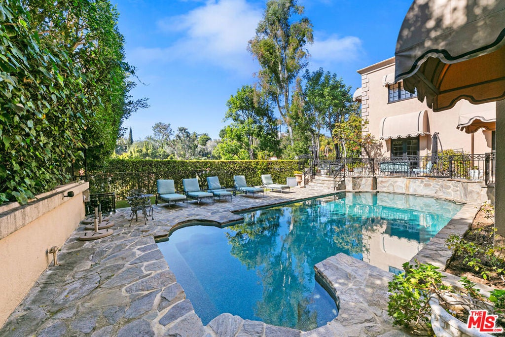 This timeless Regency-style residence seamlessly combines classic elegance with modern luxury, set in one of Beverly Hills' most coveted locations. The grand entrance, soaring ceilings, and intricate moldings create a refined atmosphere that flows effortlessly throughout the home. The expansive living room extends to the outdoor spaces, offering an ideal setting for both entertaining and relaxation. Adjacent to the living room, you'll find a cozy library and bar with a fireplace, the perfect retreat for an evening drink or a quiet movie night. The gourmet kitchen is a chef's dream, featuring top-tier Wolfe and Miele appliances, double ovens, and a warming drawer. French doors from the kitchen open to a private balcony, providing a tranquil escape. Multiple fireplaces throughout the home infuse each room with warmth and charm. The luxurious primary suite is a true sanctuary, complete with dual bathrooms, a vanity, and generous walk-in closets, along with French doors that open to the outdoors for extra privacy and serenity. The home offers six bedrooms, each with its own en-suite bathroom, ensuring comfort and privacy for family and guests. For wellness enthusiasts, there is a fully equipped gym with air conditioning, and an electric car charger adds an extra layer of convenience. Outside, the beautifully landscaped grounds include a pool, a lawn area, and various seating and dining spaces, perfect for both relaxation and entertaining. This exceptional Beverly Hills property provides unparalleled luxury living and offers a rare opportunity to lease and possibly own a home of this caliber in one of the most desirable locations.