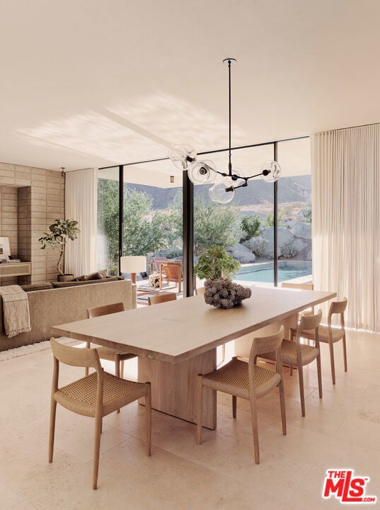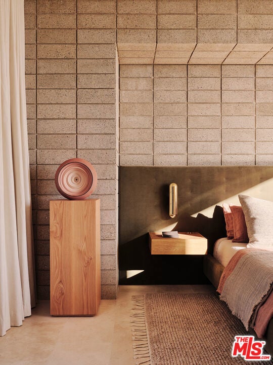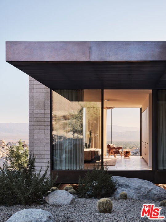 The Woods House, 2021, Woods + Dangaran. From siting to floor plan to finishes, this residence is deeply connected to the desert environment and its context in the hills above Palm Springs. Surrounded by boulders and spanning a natural arroyo, the home is lifted above existing site features, yet still retains a powerful connection to the earth. The architecture emphasizing horizontal lines, natural materials, and visual and physical linkages between indoors and out celebrates and elevates the tenets of desert modernism. Exterior walls of earth-toned plaster and textured concrete masonry units tie the slab-on-grade structure to the site. Deep roof overhangs are wrapped in brass paneling. Strategically-placed floor-to-ceiling glazing frames stunning views of the desert in all directions. A glass-enclosed bridge connects two wings of the home and creates a central atrium that can be viewed from nearly every room. Large sliding glass doors run the length of the great room and provide an uninterrupted transition to an outdoor dining area, deck, pool, spa, fireplace, and lounge. Lot 2 APN 504-390-002 to be included in sale. Renderings for the second parcel by Woods + Dangaran available by request.
