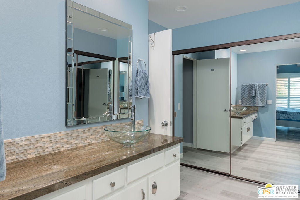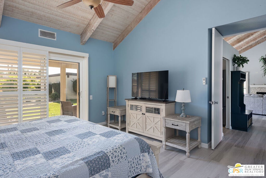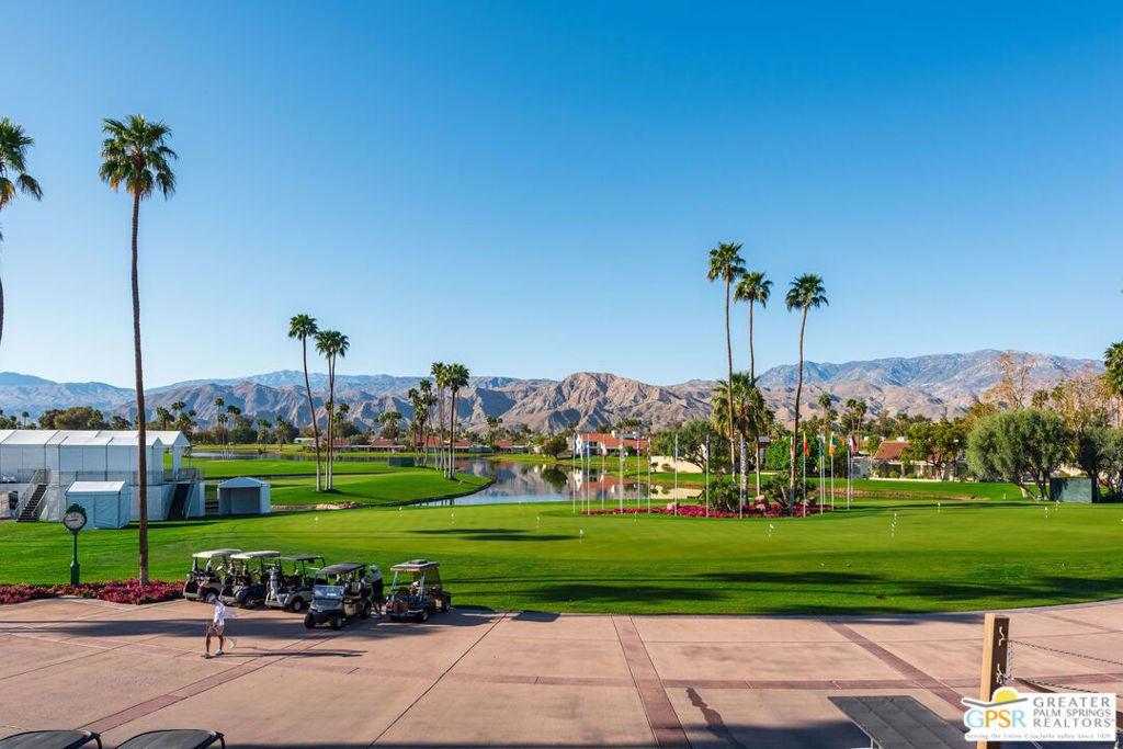 Experience the ultimate country club lifestyle in this beautifully upgraded 1,049 SqFt single-level end-unit with only one shared wall for added privacy within the prestigious Mission Hills Country Club. Situated in a quiet location, just steps from 3 community pools, this residence offers exceptional privacy and two inviting covered patios, complete with pergolas, perfect for entertaining and relaxation. Inside, discover a light and airy open floor plan featuring vaulted beamed ceilings, creating a warm and spacious ambiance. Recent renovations include new flooring, stainless steel appliances, double-pane sliding doors and windows, custom plantation shutters throughout, upgraded lighting, a stylish fireplace tile surround, and a luxurious walk-in shower. A high-capacity washer/dryer adds to the convenience. The well-appointed kitchen seamlessly flows into the great room, ideal for open concept living. A large, detached two-car garage, located just steps away, provides ample storage. Mission Hills Country Club, a guard-gated community in desirable Rancho Mirage, is renowned for its rich history and world-class amenities. Members enjoy access to three championship golf courses, 30 tennis courts (grass, clay, and hard), pickleball courts, croquet, a state-of-the-art fitness center, spa services, and multiple dining and social venues. Located minutes from Palm Springs International Airport, El Paseo Shopping, and major entertainment, this is your opportunity to embrace the coveted Mission Hills lifestyle.