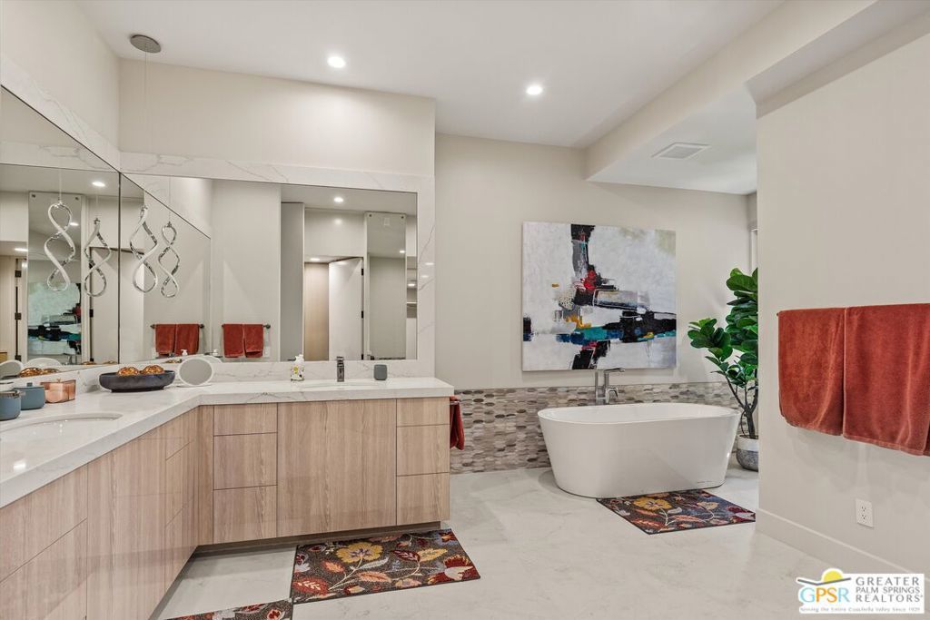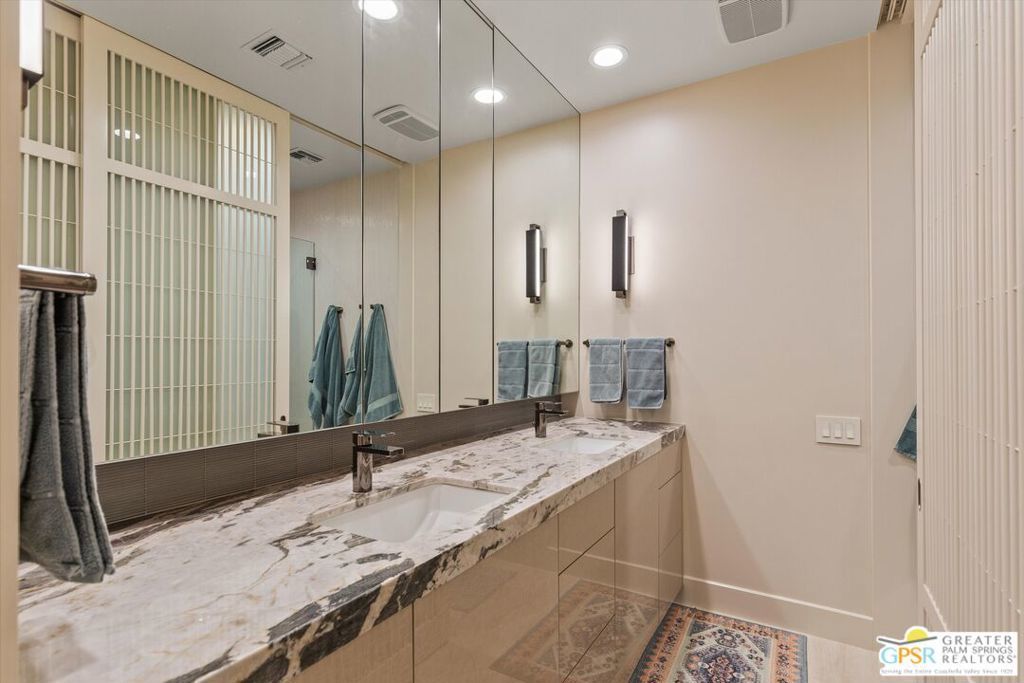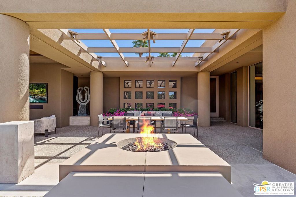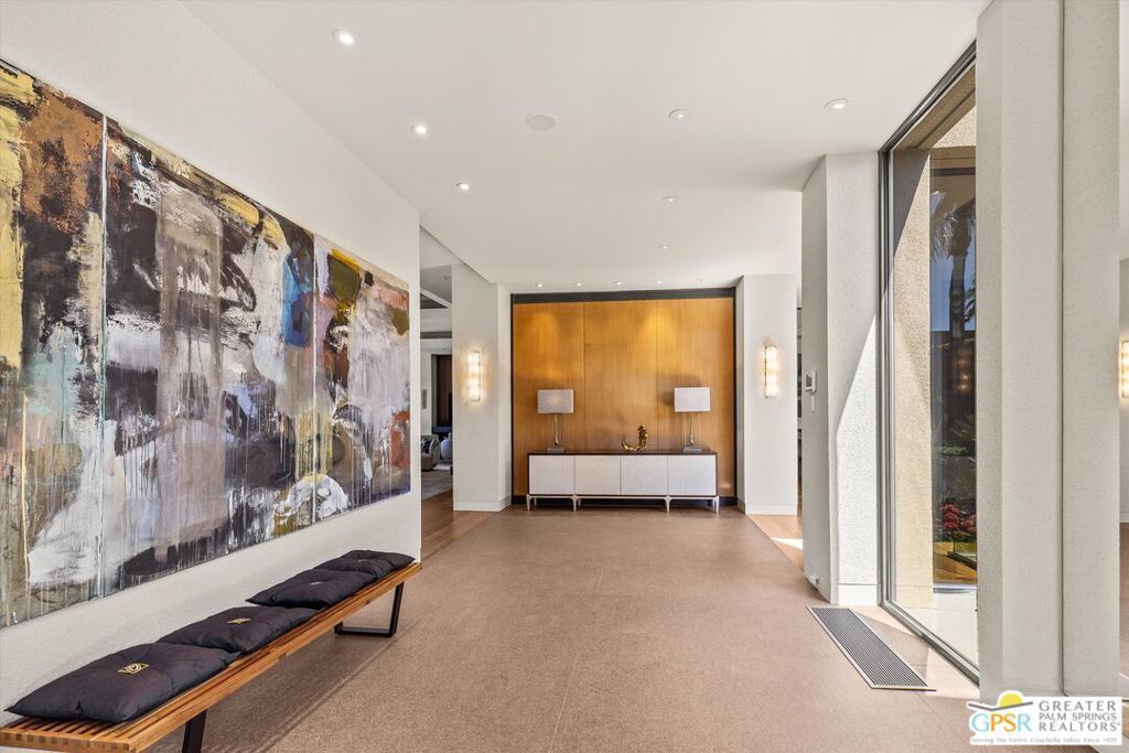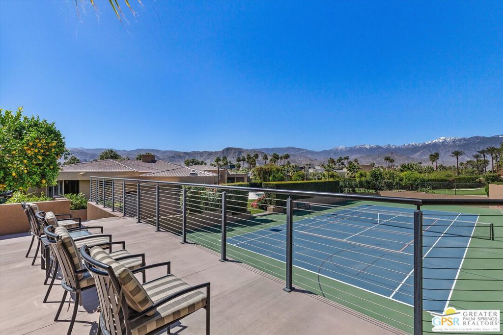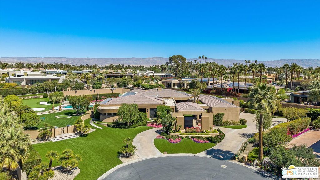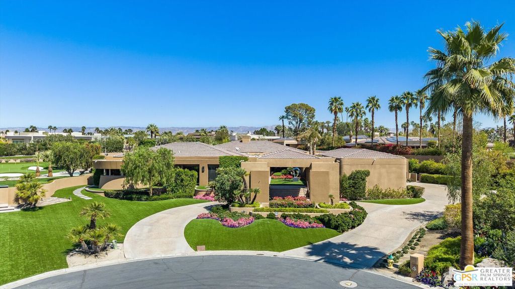 HUGE price reduction and immediate occupancy to personalize in time for this Holiday season. The gourmet Spectrum kitchen, designed for both culinary artistry and grand entertaining, boasts meticulous detailing, including dual islands, double ovens/cooktops, and a thoughtfully integrated coffee and beverage bar, creating a focal point for family gatherings. This ultimate hide and reveal retreat perched like a well-earned trophy inside this exclusively gated "lucky seven" residences of Big Sioux. A masterpiece of design and privacy, this sanctuary is strategically positioned between the iconic Annenberg Sunnyland's estate and Tamarisk Country Club in Rancho Mirage. The expansive single-story zoned layout, encompassing 8,145 sq. ft. residence epitomizes luxury living while its thoughtful design offers an abundance of space and high-end amenities including six bedrooms and nine bathrooms. This Custom-designed residence is well suited for showcasing the finest collections of art, sculpture and automobiles. Meticulously designed for both grand entertaining and intimate living, while providing a stunning backdrop for creating lasting memories. An open-plan design creates a harmonious flow between indoor and outdoor living areas, defining this exceptional residence. The main living space is a showcase of architectural detail, featuring a magnificent, coffered ceiling with soft, ambient lighting. Expansive floor-to-ceiling windows maximize natural light and offer breathtaking panoramic views of the tranquil 1.39-acre estate. This private oasis includes a golf practice area with massive green with 2 hit pads and 3 sand traps, night-lit tennis court with a VIP viewing deck, a play area, and a shimmering pool/spa sundeck framed by dramatic mountain views. A sophisticated traditional contemporary aesthetic defines the home's decor, highlighted by a calming neutral color palette. The adjacent media and game room offers a versatile space for entertainment and relaxation, further emphasizing the home's seamless blend of style and functionality. An impressive circular drive, featuring a pyramid-topped porte-cochere, welcomes guests with a dazzling approach, transitioning to a covered gallery walkway that leads past manicured sculpture gardens to the grand entry hall and dining room. The dining room, equipped with built-in service facilities, is enhanced by a dramatic fireplace, creating a captivating focal point for entertaining. Thoughtfully hidden directional doors provide the option to discreetly isolate the private bedroom suites wing during larger events, balancing public and private spaces. The great room, a symphony of space and light, serves as the home's central gathering area, featuring a wet bar with seating for six, a game table area, a media lounge with a warm fireplace, and a lit display wall, offering the perfect setting for a grand piano. A haven of tranquility, the delightfully detailed home office overlooks the sculpture garden and double-door entry leads to the dual primary suites, creating a private retreat. These luxurious quarters include an owner's lounge with a kitchenette, a flexible space for a nursery or wellness studio, a secondary laundry, a walk-in wardrobe, and private facilities. The property unfolds into a series of enchanting outdoor living spaces, where a family room with a large-screen television, a built-in barbecue, and a large fire pit invite gatherings and quiet moments alike. These spaces offer sweeping panoramic views of the verdant landscape, crafting a picturesque haven for morning coffee or tranquil contemplation. The property features an impressive, oversized four-car tiled garage, complemented by two additional stalls and a motor court. An adjacent service and/or catering entrance provides convenient access, while a deluxe staff suite, complete with a fireplace, offers comfortable accommodation. Designed by Holden and Johnson Built by Van Fleet and features Owned Solar too!