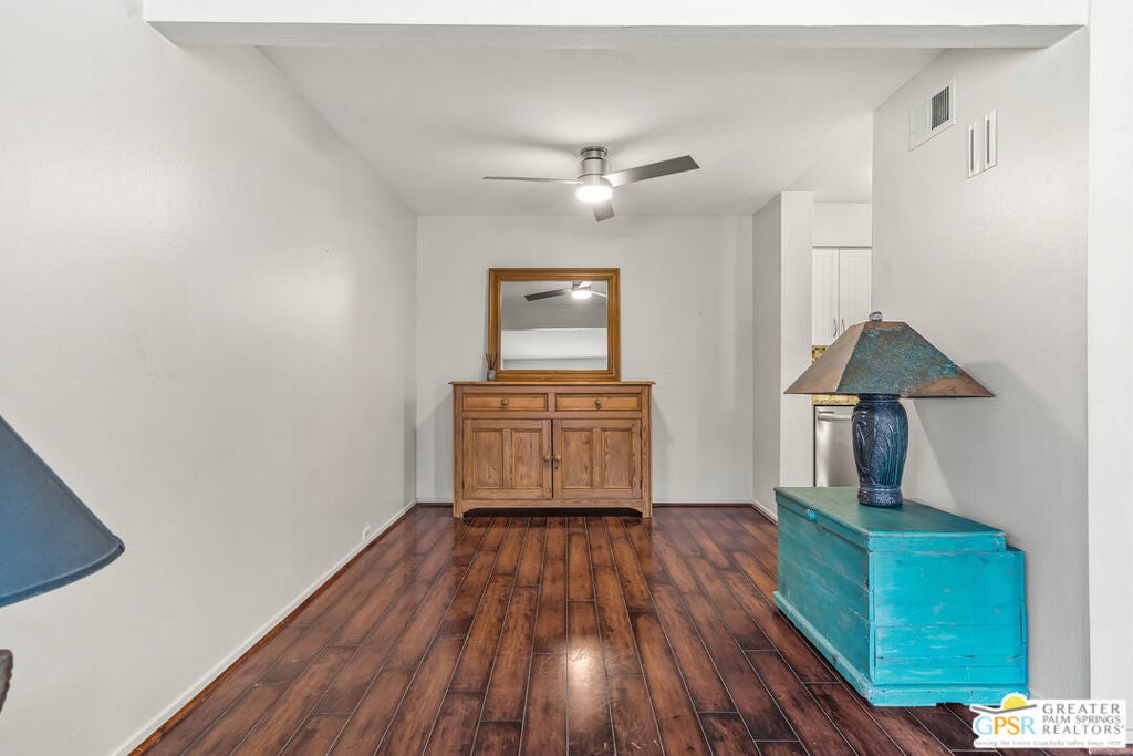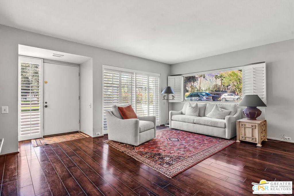 Welcome to Palm Springs Country Club Phase One, a hidden gem designed by William Cody AIA, one of Palm Springs' best-kept secrets. This architectural townhouse-style condo features 2 bedrooms, 1.5 baths, an updated kitchen, and an updated powder room downstairs. It offers laminate flooring throughout, except for the staircase, and stunning views of the San Jacinto mountains from both the living room and bedrooms. The HOA fees include basic cable and internet. The property is conveniently located near unassigned, uncovered parking. Fee simple land.