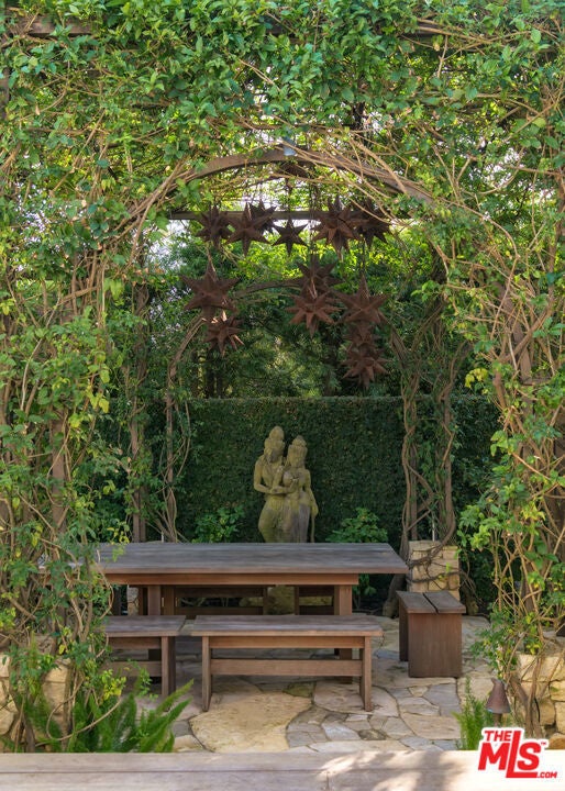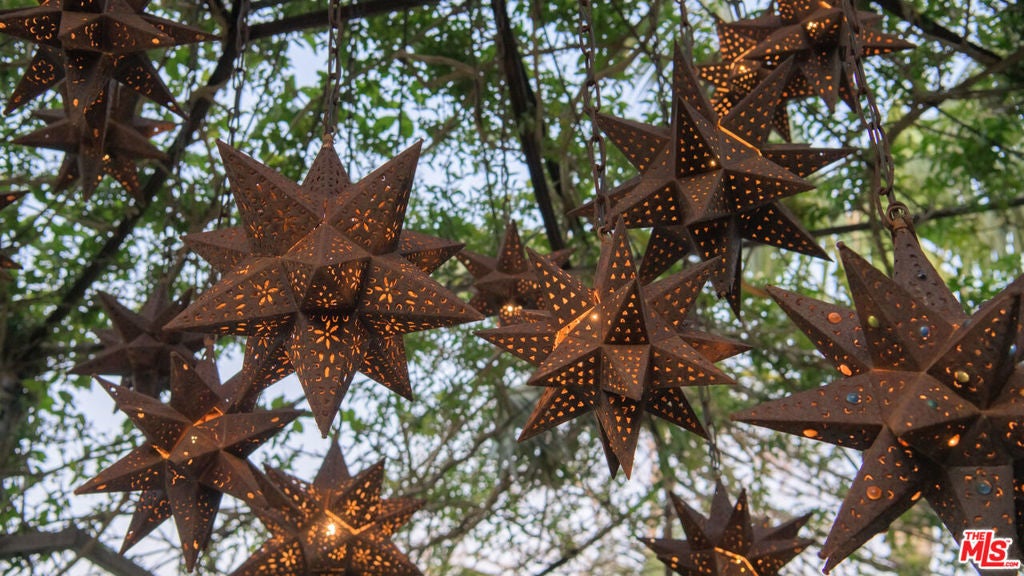 Nestled behind a private gated entrance, this stunning estate blends luxury, tranquility, and architectural charm. An intercom system grants entry into the expansive front yard, where stone gravel pathways lead through lush, curated landscaping. The property's Balinese and jungle-inspired aesthetic transports you to a serene oasis and offers rare Beach rights to Riviera 3. The main home sits amid a verdant front yard with a vast stone and gravel parking area. Winding pathways create a mesmerizing journey through tropical foliage. The grand Baldy woodwork front door opens to a foyer with rich wood flooring and built-in bookshelves. To the left, the living room features soaring ceilings, skylights, French windows, and a grand fireplace with a beautifully crafted mantle.Adjacent to the entryway, a charming bedroom features built-in bunk beds and wood floors, along with two closet areas. The primary suite captivates with high ceilings, a ceiling fan, and sliding glass doors that open to a private deck. The en-suite bathroom includes stone tile flooring, a double-sink vanity, a large shower stall with multiple showerheads, and a freestanding tub. A door leads to the backyard, allowing for an indoor-outdoor shower experience. A sliding barn door leads to an expansive walk-in closet with a center island. There is also a well-appointed laundry area with stainless steel counters and accordion doors provides ample functionality.A stone pathway connects to a secondary living space featuring wood floors, a cozy breakfast nook, and a thoughtfully designed kitchen. The kitchen offers marble countertops, a skylight, a vaulted ceiling, a four-burner Wolf range, a Wolf oven, and a Miele dishwasher. The living area flows seamlessly into an additional bedroom with a large closet and a private backyard entrance.A full bathroom includes marble counters, a vanity, a freestanding tub, and a shower stall with elegant tilework. The backyard is a true masterpiece, featuring an outdoor kitchen and bar area with wood counters, bar seating, a sink, a pizza oven, and a Lynx BBQ. A Perlick mini fridge ensures refreshments are always within reach. Steps lead into a Bali-inspired jungle retreat with a fire pit seating area, a vine-covered jungle gym, and a meticulously maintained landscape.A grand stone fireplace with outdoor seating, an expansive wood deck, and a tile-lined Jacuzzi surrounded by palm trees creates a luxurious atmosphere. The stunning pool, adorned with a turtle mosaic, serves as the centerpiece. A classic diving board adds nostalgic charm. Steps lead to a serene Bali-style gazebo with an outdoor seating area. A separate structure with high wood-beamed ceilings serves as a guest bedroom or private office.To the left of the entrance, the guest house features French doors, skylights, vaulted ceilings, and an open floor plan. The kitchen boasts marble countertops, a sink, a five-burner range, and a convection oven. Built-in cabinetry, an LG refrigerator with a water line, and freezer drawers enhance modern convenience. The living area seamlessly merges with the bedroom space, offering versatility and comfort. A large closet provides ample storage, while the en suite bathroom features marble counters, a vanity, and a freestanding tub. A spacious shower stall with dual showerheads is enveloped in stone tile, creating a spa-like experience.A gated garden area offers space for cultivating herbs and fresh produce. A charming shed provides additional storage, while citrus trees dot the landscape. A state-of-the-art sprinkler system maintains the lush greenery. A vine-covered dining area, centered around a grand wooden table and illuminated by a metal star light fixture, provides the perfect setting for alfresco dining under the stars.This estate seamlessly blends elegance, modern conveniences, and natural beauty, offering an unparalleled living experience.