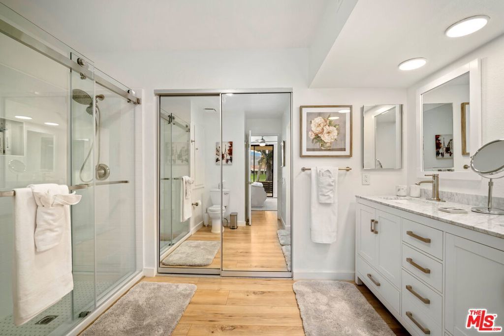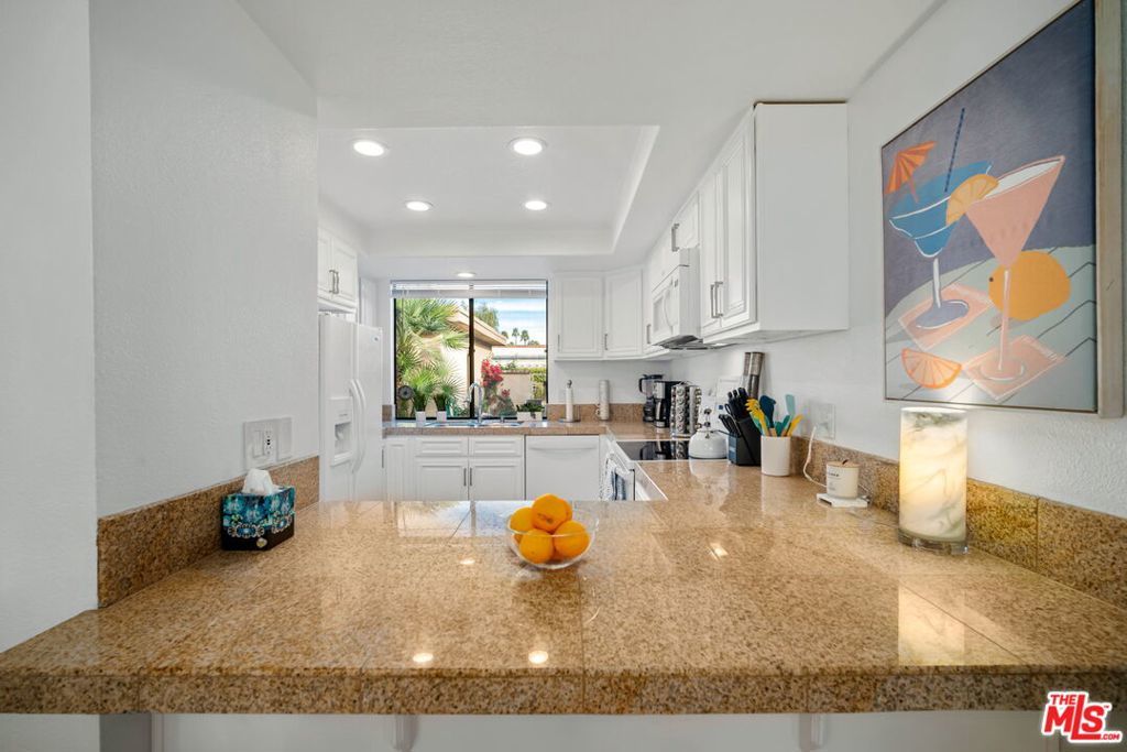 Updated and curated and ready to enjoy! No steps and no elevators with private garage. Living on the golf course in Rancho Mirage is true California style! The primary bedroom looks out onto the golf course and picturesque desert mountains and palm trees. Lay in bed and wait for the world to go by. The main living room overlooks the golf course as well. Enjoy the scenic views while watching a 65 inch tv. Bathrooms have been updated in the last two years and the kitchen is stocked with every gadget you need. Including a Kitchenaid stand mixer! 24 hour guard gated, 21 pools and spas, remodeled gym, pickle ball, bocce ball, tennis, and plenty of space to walk or ride bikes. Steps to route 111 and 2 blocks from Eisenhower Medical Center. May, June, July, August, September, October : $3,500 a month.