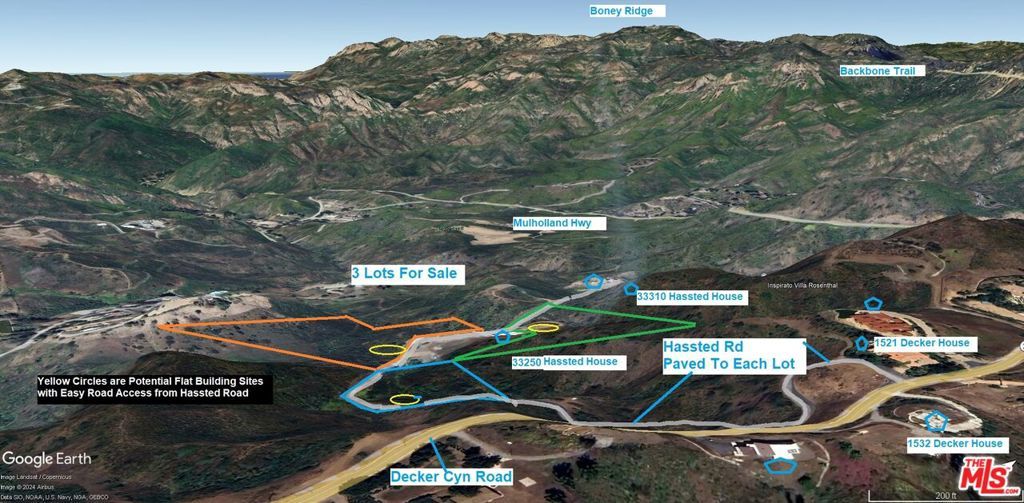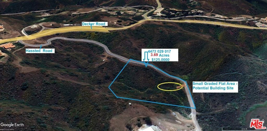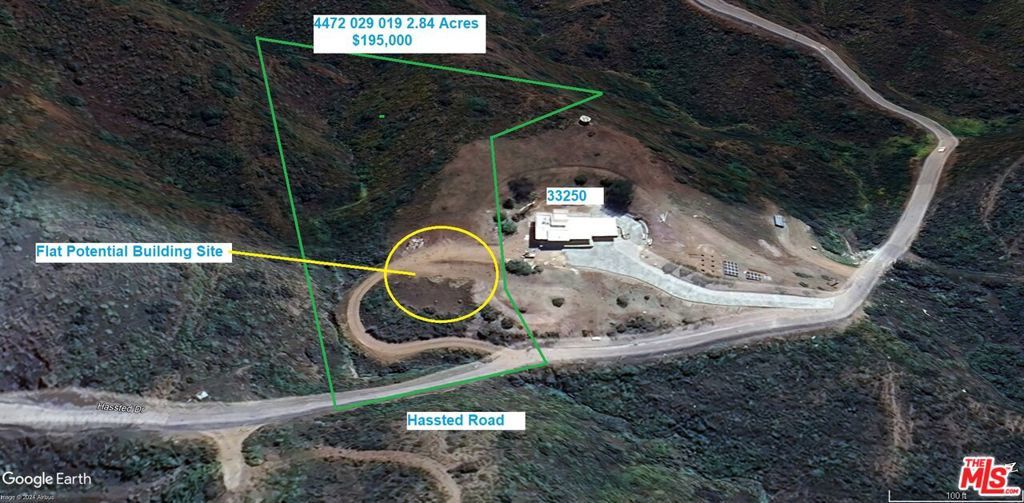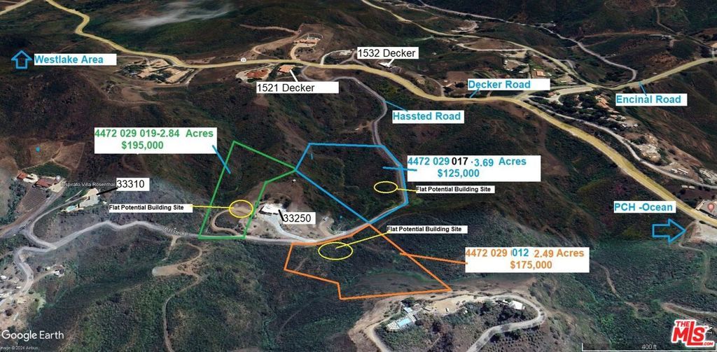 2.8 Malibu Acres with large flat building site with great access off Hassted Road. Beautiful Views of Boney Ridge Mountain and green meadows. Property will need a water well and private septic system like all homes and lots on this street. There is tremendous potential to build with tremendous profit with homes on this street and within 1/8 mile all selling from $3m to $5m or just build your Malibu Country Home. 3 Lots for sale - buy one or all three Malibu Lots - 9 Acres Total For Sale for $450,000 or buy individual lots from $125k to $195k. Parcel Numbers - 4472 029 019 - 2.84 acres , 4472 029 012 - 2.49 acres , 4472 029 017 -3.69 acres . See detailed aerial maps in photo section to find properties . Best Lower Priced Land Buy in Malibu!