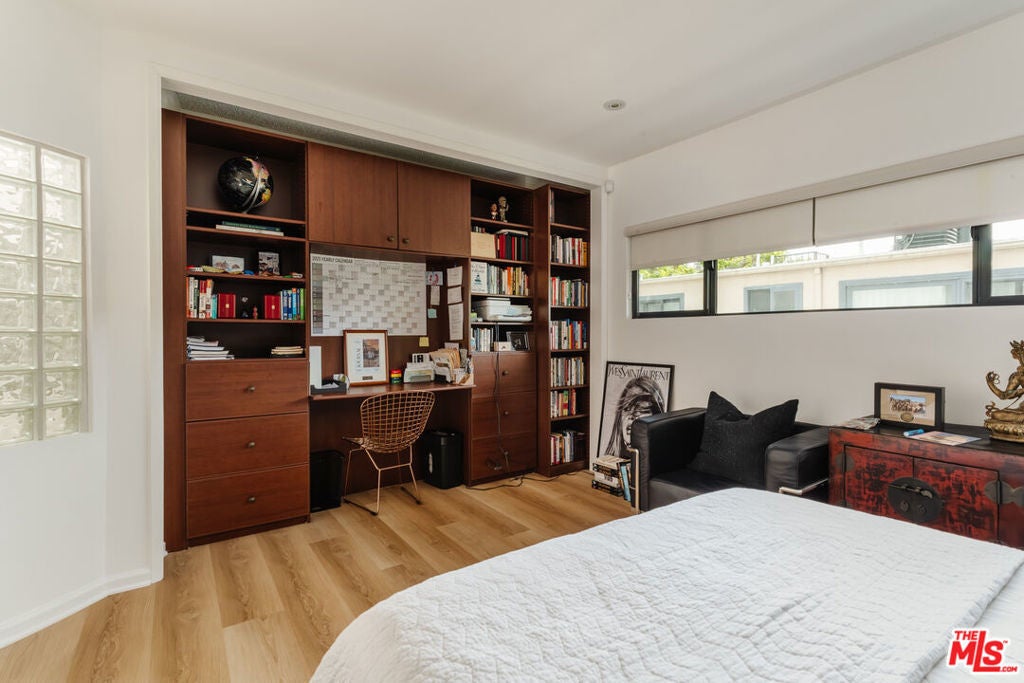 Tucked within one of the few condominium enclaves in the prestigious Bel Air neighborhood, this rare two-level townhome blends architectural style, modern comfort, and serene indoor-outdoor living. One of just seven residences and only sharing one wall with neighbors, the home offers a refined retreat amid a setting typically reserved for grand estates. Upon entry, a light-filled living space welcomes with floor-to-ceiling windows, a sleek gas fireplace, and seamless access to a covered balcony framed by leafy treetops--an idyllic perch for morning coffee or evening repose. The adjacent kitchen makes a striking statement with matte black cabinetry, brushed brass hardware, and quartz countertops, punctuated by Viking double ovens and a dedicated wine fridge. A stylish dining area and a built-in wet bar enhance the lower level, ideal for everything from quiet mornings to lively entertaining. Upstairs, a skylight above the spiral staircase allows radiant natural light to fill the space. A private wood-clad courtyard offers a rare al fresco moment--an intimate outdoor escape just outside the bedroom suites. Both bedrooms are generously scaled and feature en suite baths, providing comfort and privacy. The primary suite is graced with oversized windows and ample storage, while its recently updated bathroom includes a tiled soaking tub beneath a skylight and glass-enclosed shower, creating a spa-like sanctuary. Glass block detailing adds a retro-chic flourish to the upper hall, and a stacked laundry closet offers everyday convenience without compromising design. Ideally located for those who seek privacy without isolation, this Bel Air gem is just minutes from The Getty Center, Brentwood Village, Westwood, and the 405 freeway--pairing tranquil living with effortless access to the best of the Westside.