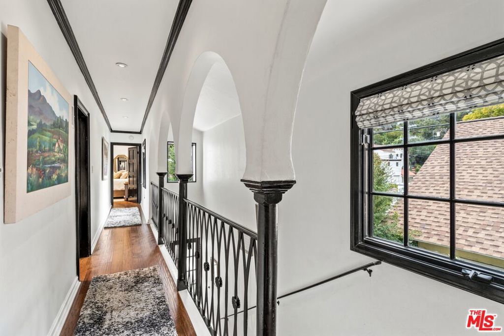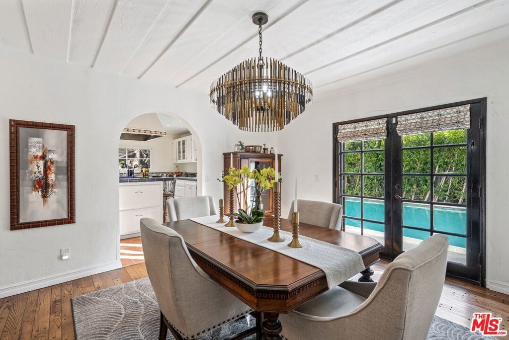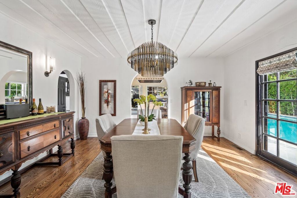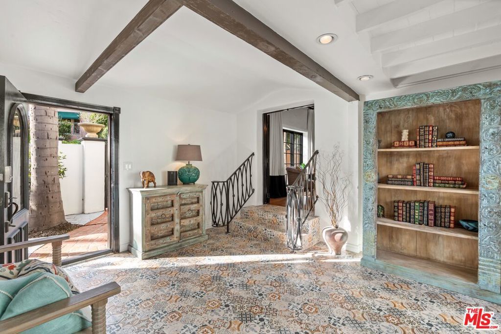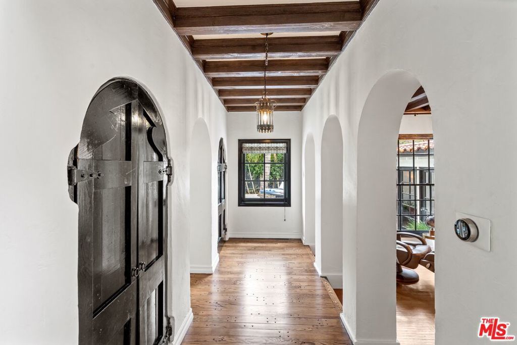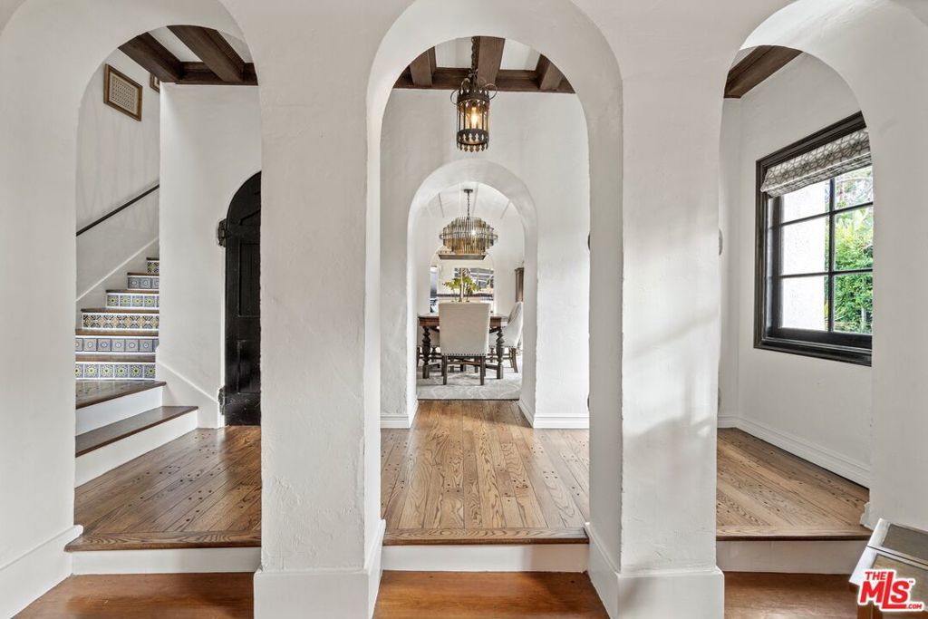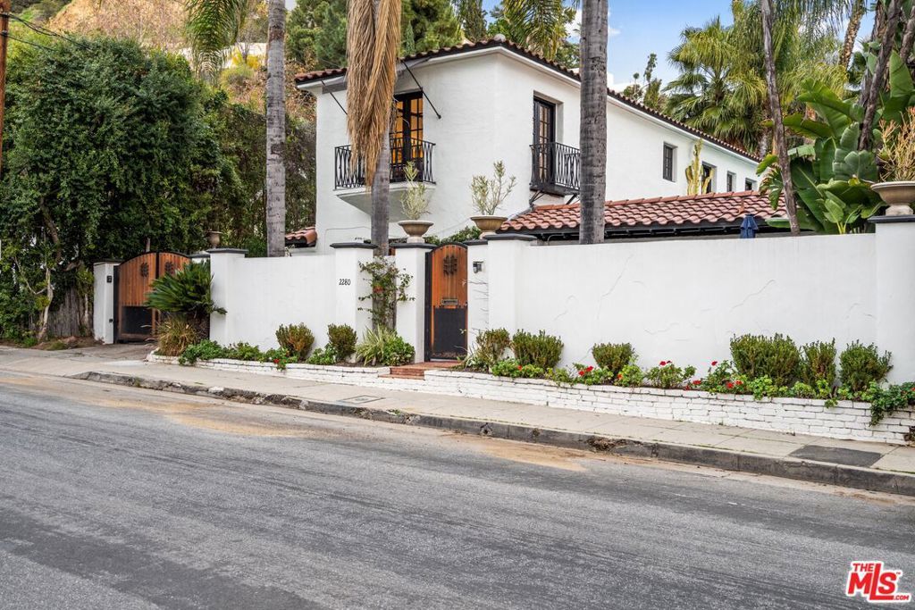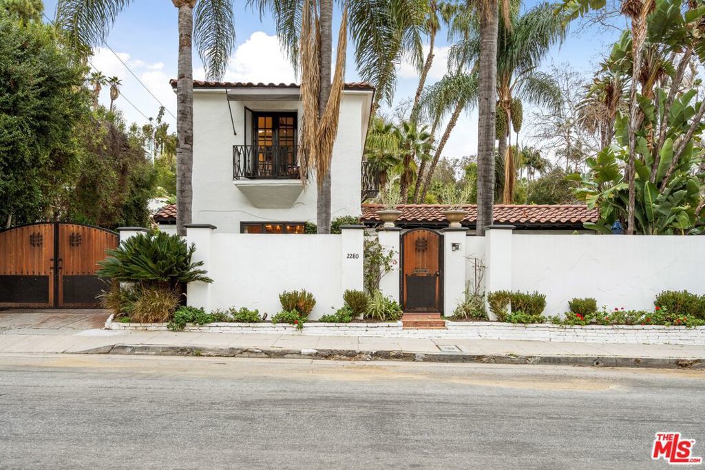 PRICE IMPROVEMENT! Welcome to "Hollywood Oasis" -- a classic Mission Revival gem on a secluded tree-lined street in the heart of the Hollywood Dell. Minutes from hipster Hollywood to the south and Cahuenga Pass to the east, with easy access to popular venues such as Pantages Theater, TAO, Hollywood Bowl ... Step into a private walled courtyard. Turn right to sequestered guest room and en suite with patio access. Straight on through vestibule to oversize rear pool. Or left up to elegant living space, with beamed ceilings and gas fireplace. Attention to detail showcases period lighting, original arched doors and hand-nailed flooring, leading to formal dining room. Gourmet kitchen with festive Spanish tile and new professional range. Dine al fresco on the rear patio with retractable sun awning. Main staircase leads to stunning arched hallway and three additional bedrooms. All with en suite baths; additional guest bath downstairs. Upstairs bedrooms have Juliet balconies. Middle bedroom can be used as office. "California Closets" installed throughout. Gated, secure off-street parking for two tandem cars plus one additional in garage; on-street with permits. Preview by appointment only.