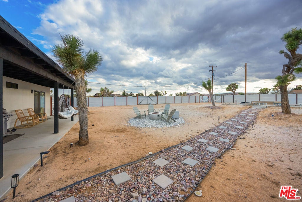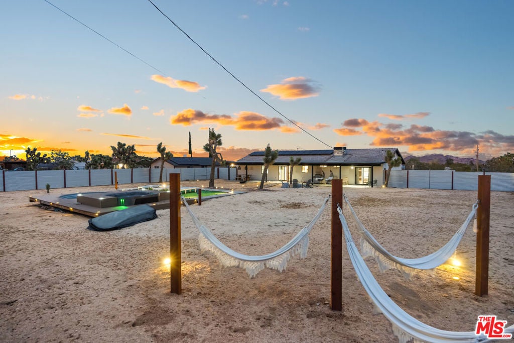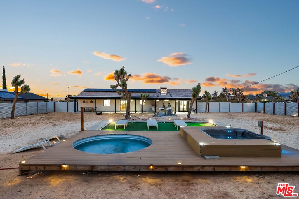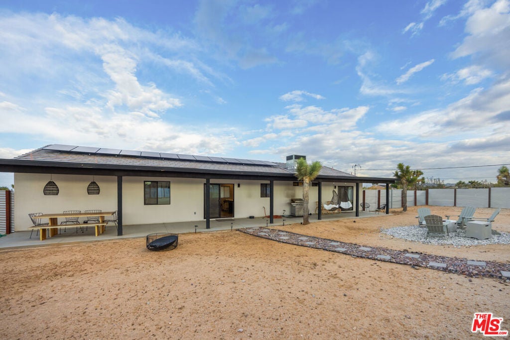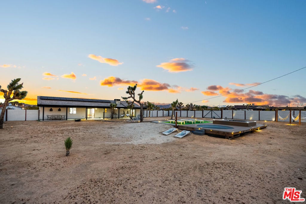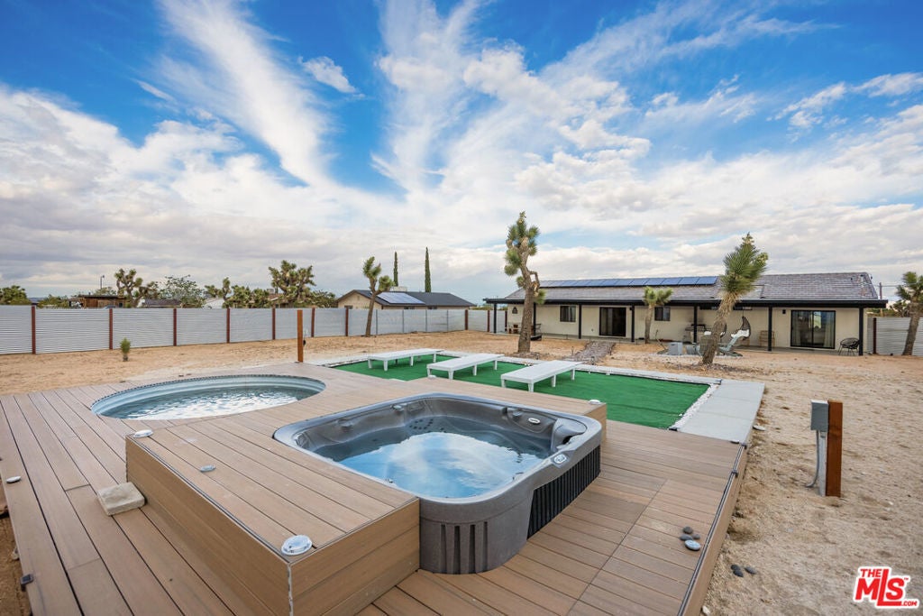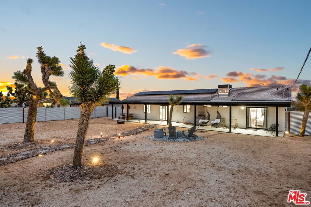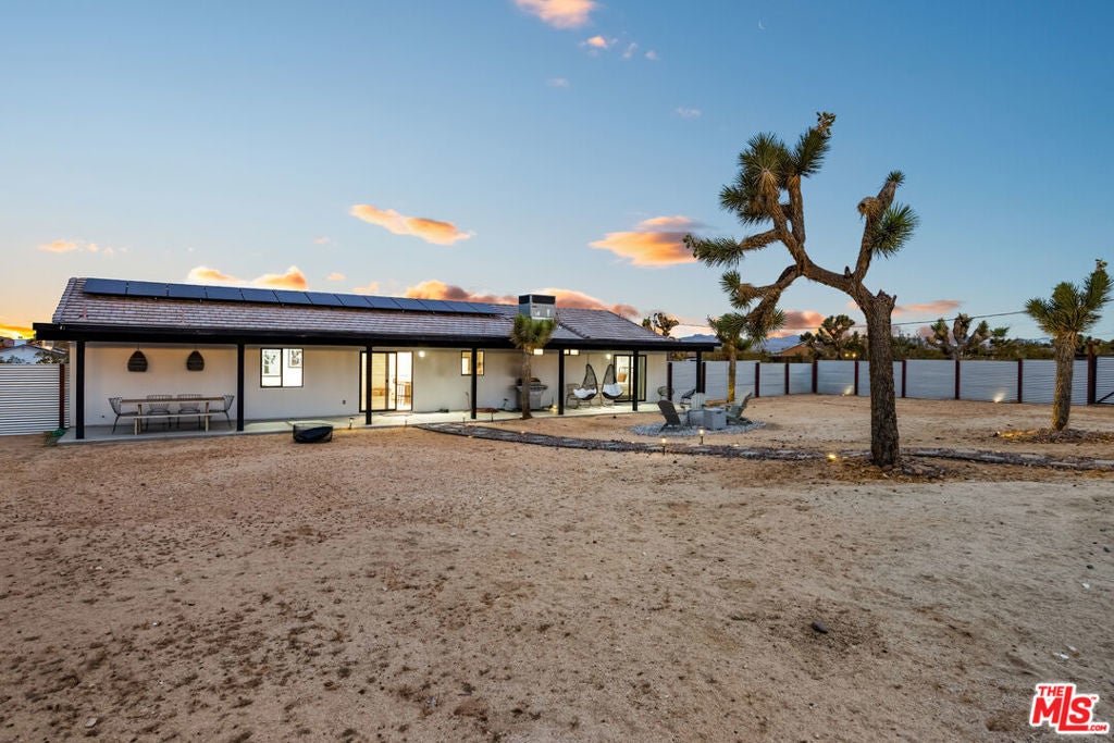 Turn-Key STR Opportunity with Pool, Spa & Owned Solar Fully Furnished Modern Desert Home! Built in 2022, this high-performing 3-bed, 2-bath modern on nearly half an acre delivers everything investors seek: strong nightly rates, low maintenance, and energy efficiency. The open-concept great room features vaulted ceilings, waterproof plank flooring, and a designer kitchen with quartz counters, Samsung stainless appliances, and a large center island. The primary suite opens directly to a covered patio overlooking the pool and spa perfect for a five-star guest experience.Outdoors, guests enjoy a private heated pool and spa, lounge deck, and uninterrupted desert and mountain views under clear night skies. Smart-home upgrades include owned 4.9 kW solar, Tesla EV charger, tankless water heater, and R-21 insulated 2x6 walls for optimized operating costs. Delivered fully furnished and stocked, this home is ready to start producing income from day one.Comparable STRs in this corridor gross between $80K-$100K annually with seasonal rate adjustments and 65-75% occupancy (buyer to verify). Benefit from potential bonus depreciation and favorable STR tax treatment while owning a tangible lifestyle asset minutes from downtown Yucca Valley and Joshua Tree National Park.Neighboring 20,000 SF lot available separately (MLS 25-550109) for expansion, additional unit, or future appreciation play.