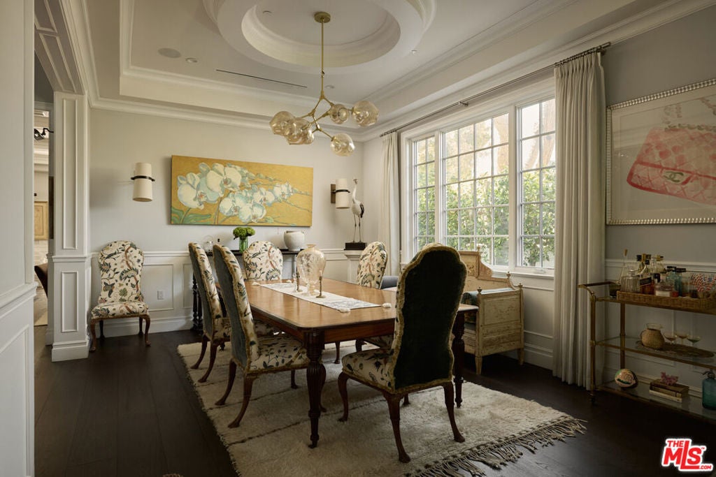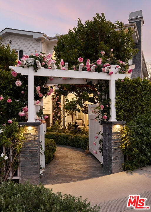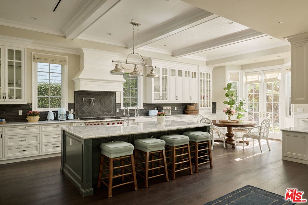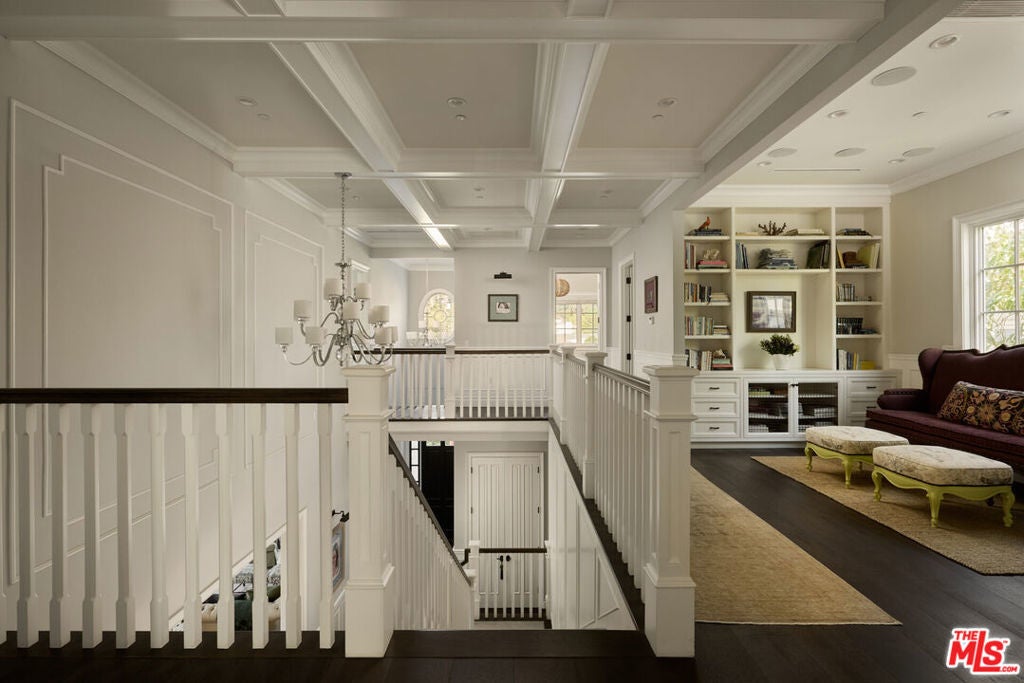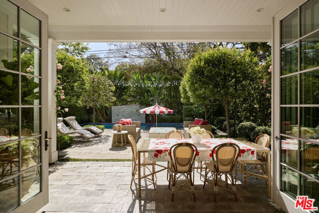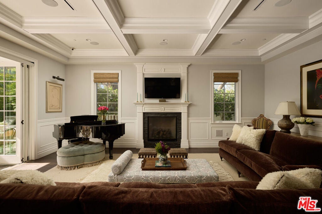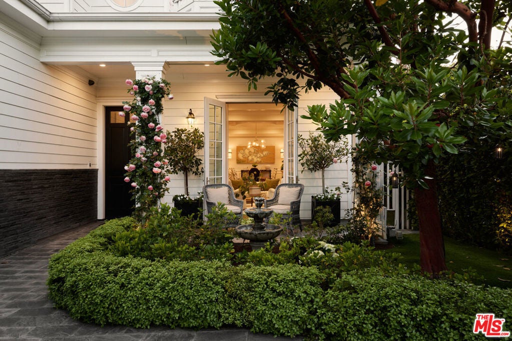 Nestled in the heart of Brentwood, this charming East Coast traditional exudes timeless elegance and serene privacy. A fragrant, rose-covered gate unveils a tranquil setting complete with a glistening fountain reminiscent of a Hamptons retreat. Elegantly designed, the residence features soaring ceilings and a grand staircase that showcases extraordinary craftsmanship. Exquisite coffered ceilings, intricate wainscoting, and custom woodwork harmonize with beautiful oak floors and artisanal tile work throughout, creating a tapestry of sophistication. Culinary enthusiasts will adore the oversized eat-in kitchen a chef's dream equipped with bespoke cabinetry, a substantial center island, luxurious marble countertops, and top-of-the-line appliances. Ideal for entertaining, this inviting space seamlessly transitions into the family room, where folding doors open to reveal a fragrant rose garden and a lushly landscaped backyard complete with an outdoor barbecue kitchen and a sparkling pool and spa. Generously proportioned living areas are bathed in natural light, enhancing the home's warm and sophisticated ambiance. The primary suite offers a spacious walk-in closet, a double-sided fireplace, and a luxurious bath, providing an intimate sanctuary for relaxation. This special property is a true haven, perfectly positioned in an idyllic location that seamlessly balances luxury, tranquility, and convenience.