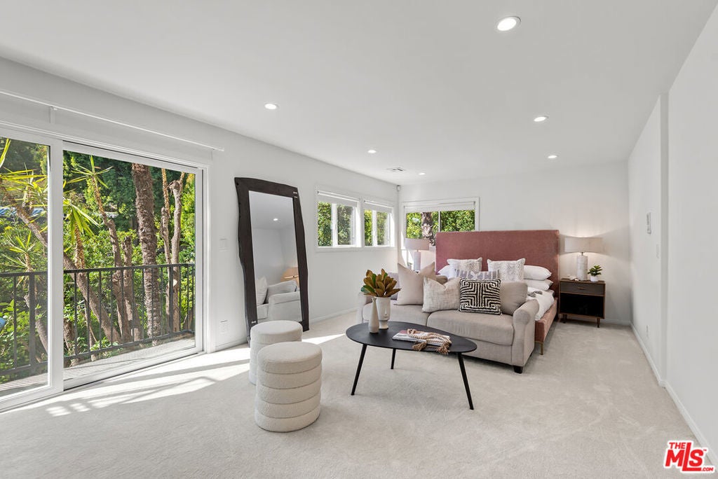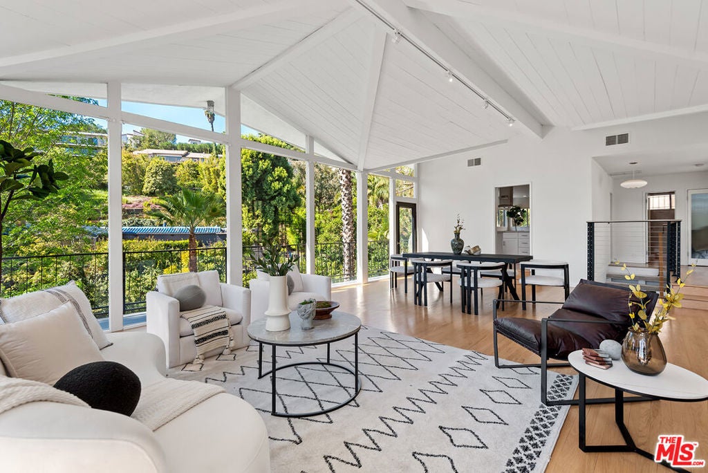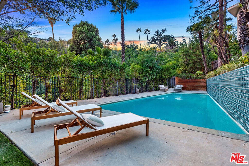 Tucked away on a private road in coveted Outpost Estates, this stylish and chic mid-century home offers the perfect blend of architectural brilliance and modern luxury. Boasting tree-top views and the downtown skyline coupled with the effortless indoor-outdoor flow, this 3-bedroom, 3-bathroom retreat is a rare find. The heart of the home is the living room, defined by a striking butterfly roofline and floor-to-ceiling glass panels, flooding the space with natural light and capturing breathtaking vistas. A floating staircase leads to the sleeping quarters below, where two oversized bedrooms and a third bedroom provide comfort and tranquility. The primary suite opens to a private deck, leading down to a spectacular entertainers yard complete with a pool, sun-drenched lounge spaces, and lush surroundings for ultimate relaxation. A remodeled kitchen, sleek finishes, and an effortless open layout make this home both functional and timeless. A memorable residence designed for entertaining, this architectural gem is a true retreat in the hills.