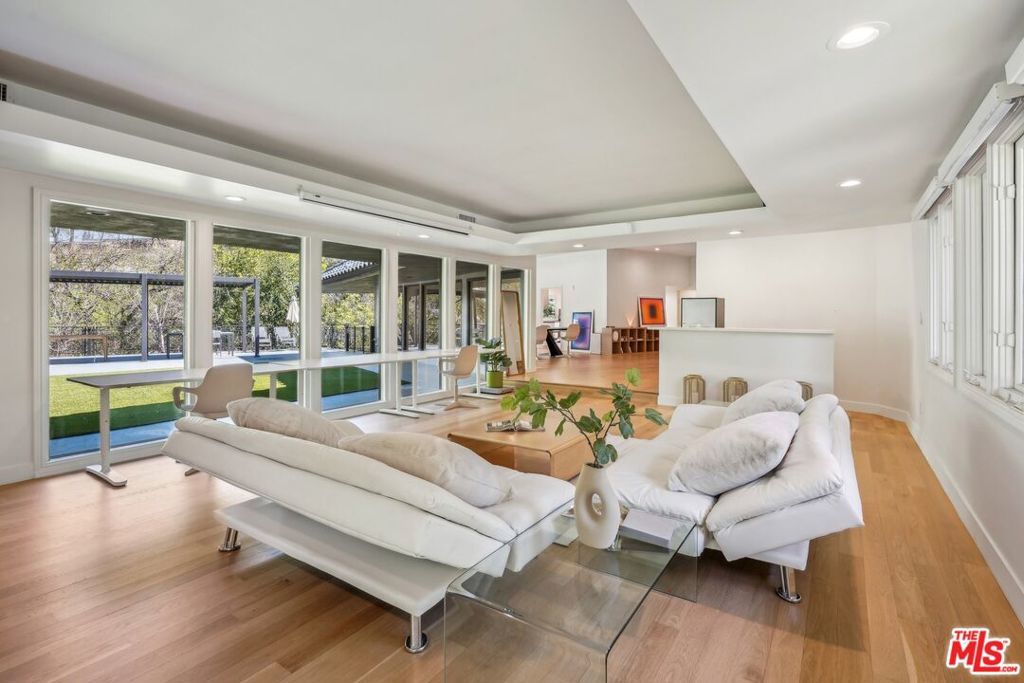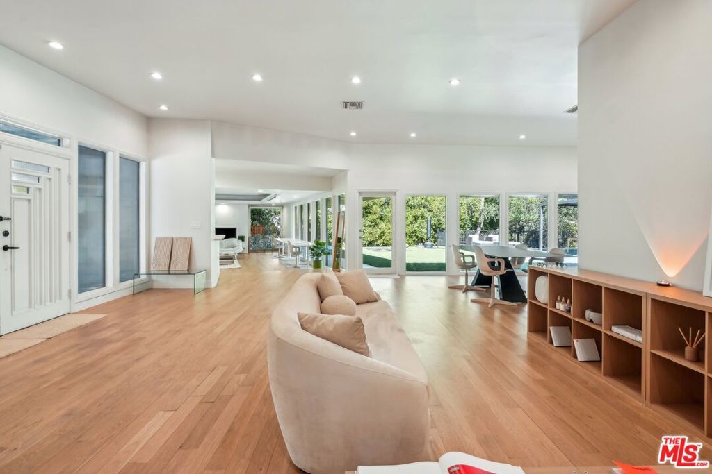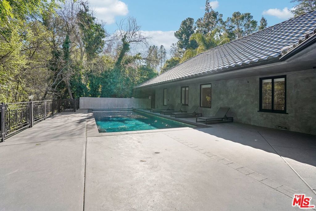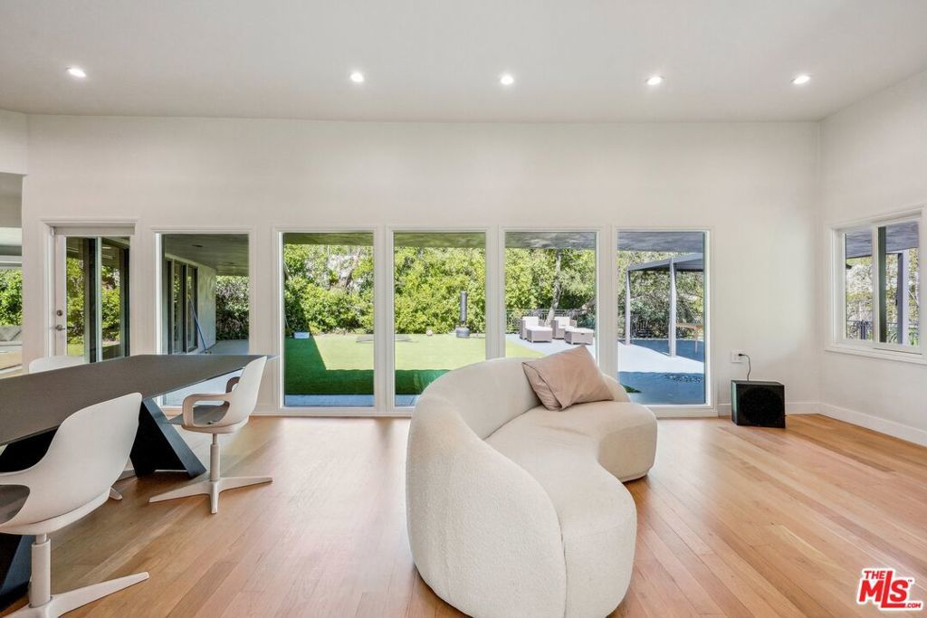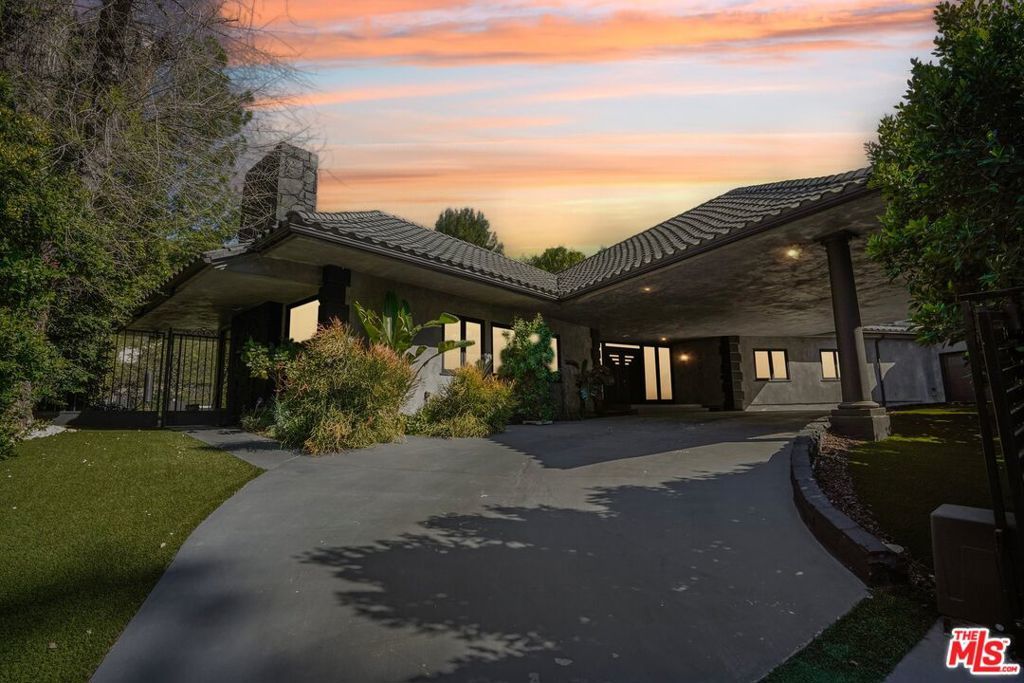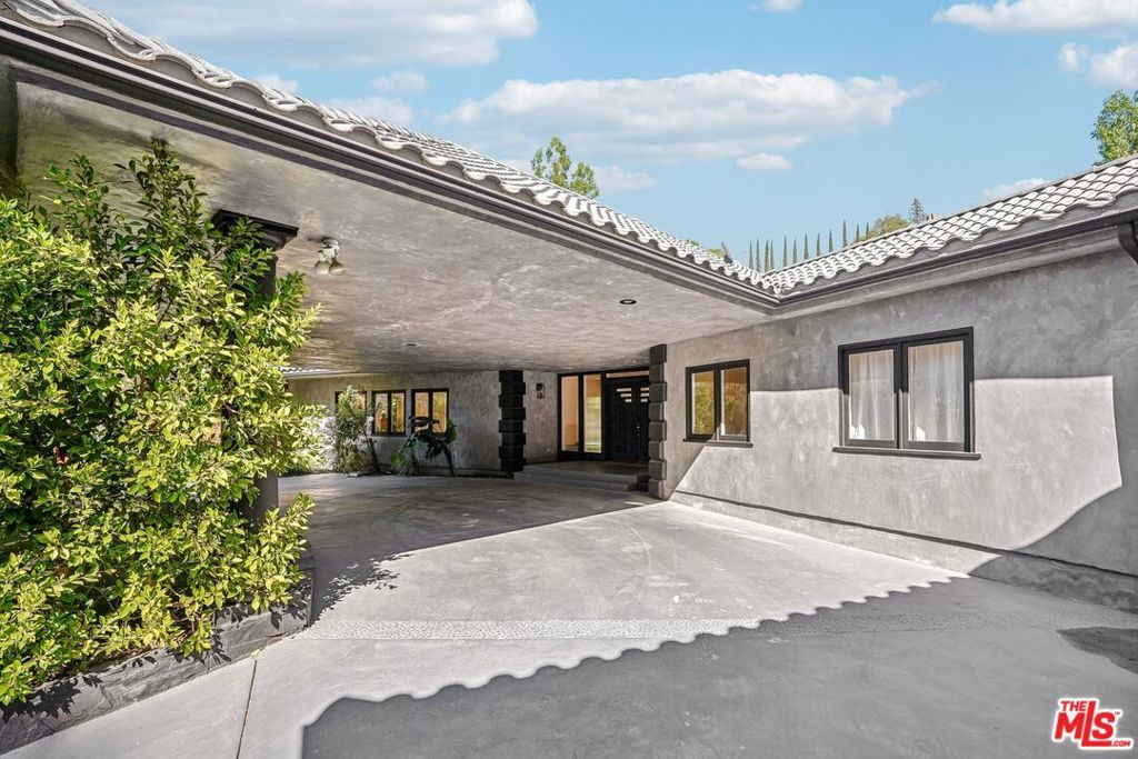 This mid-century modern gem offers the perfect blend of style, comfort, and privacy. A striking circular driveway welcomes you to this beautifully updated single-story home. Step inside to an open, light-filled layout where floor-to-ceiling windows showcase stunning views of the private backyard. Elegant birch wood and white oak flooring flow throughout, enhancing the home's warm and modern aesthetic. A built-in bar area off the living room makes entertaining effortless, while the seamless design allows for easy movement between the kitchen, dining, and lounge spaces. The primary suite is a private retreat, featuring a cozy sitting area, fireplace, dual walk-in closets, and a spa-like en-suite bath. Outside, a true sanctuary awaits. The expansive patio and lush greenery surround a heated pool with a motorized cover, offering year-round relaxation and entertainment. This exceptional home is south of the Boulevard, in the Forest Hills Community, and just minutes from luxury shopping and fine dining at The Commons at Calabasas and Westfield Topanga's Village, and offers the best of Woodland Hills living. Welcome home!.