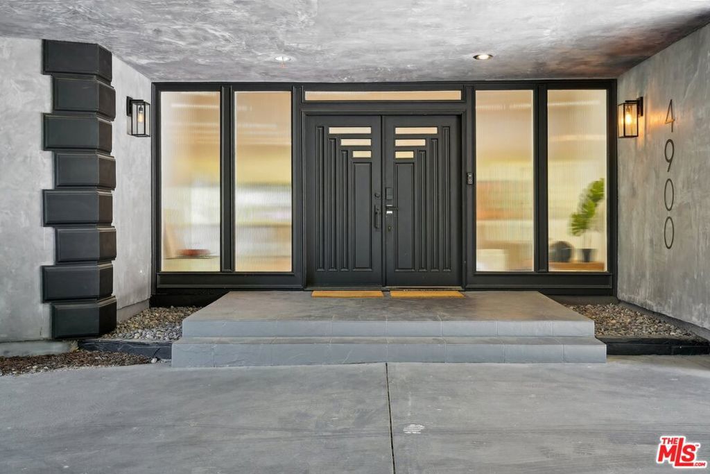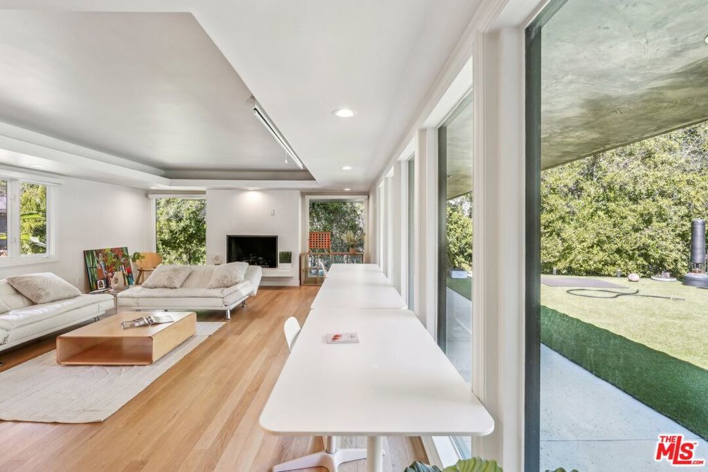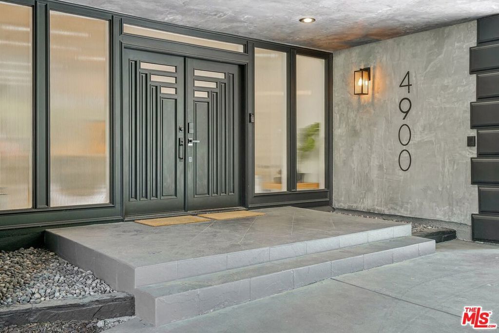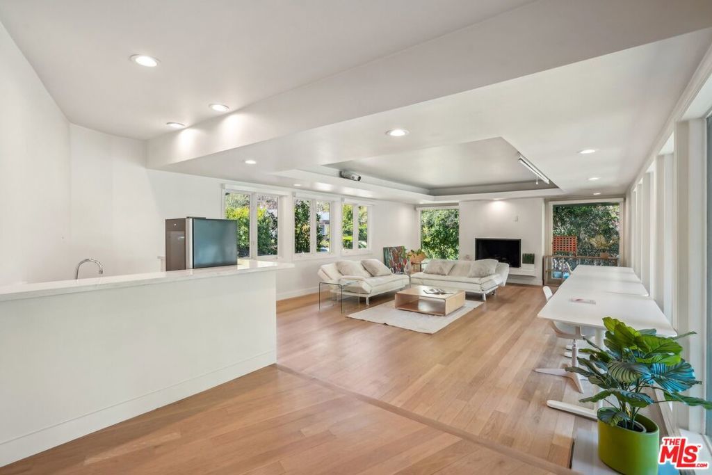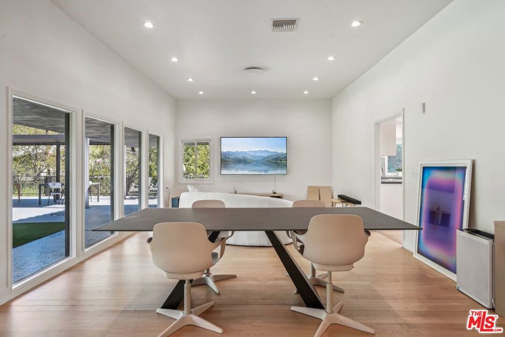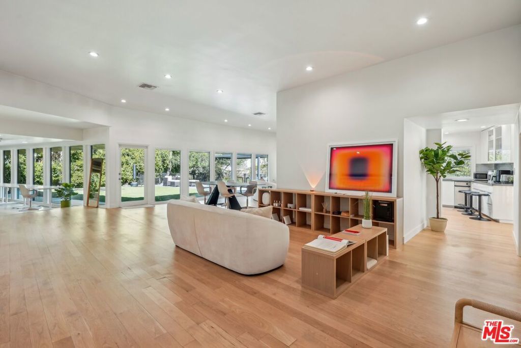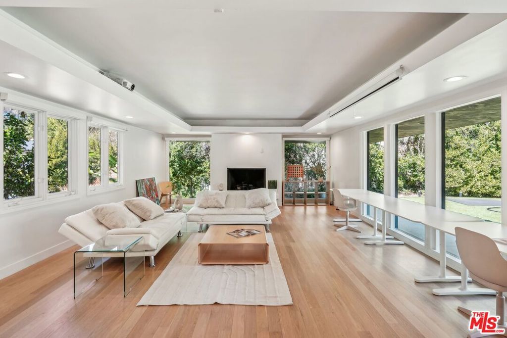 This mid-century modern gem offers the perfect blend of style, comfort, and privacy. A striking circular driveway welcomes you to this beautifully updated single-story home. Step inside to an open, light-filled layout where floor-to-ceiling windows showcase stunning views of the private backyard. Elegant birch wood and white oak flooring flow throughout, enhancing the home's warm and modern aesthetic. A built-in bar area off the living room makes entertaining effortless, while the seamless design allows for easy movement between the kitchen, dining, and lounge spaces. The primary suite is a private retreat, featuring a cozy sitting area, fireplace, dual walk-in closets, and a spa-like en-suite bath. Outside, a true sanctuary awaits. The expansive patio and lush greenery surround a heated pool with a motorized cover, offering year-round relaxation and entertainment. This exceptional home is south of the Boulevard, in the Forest Hills Community, and just minutes from luxury shopping and fine dining at The Commons at Calabasas and Westfield Topanga's Village, and offers the best of Woodland Hills living. Welcome home!.