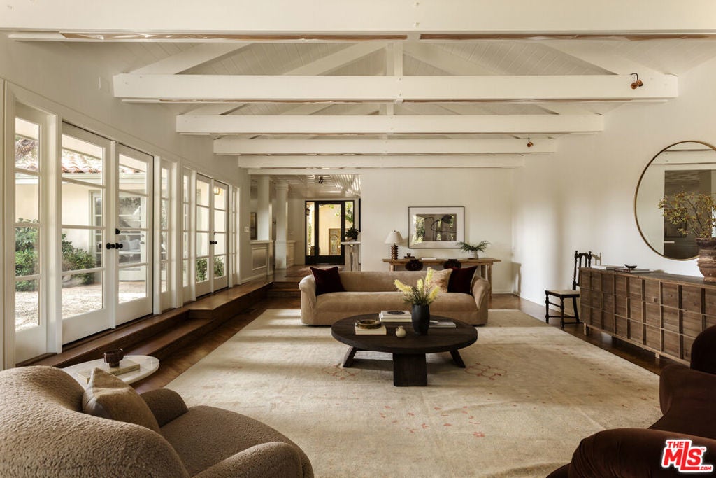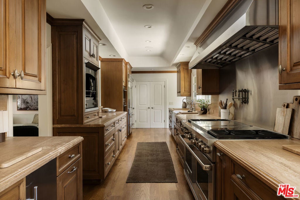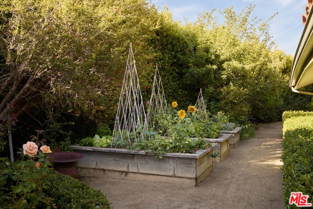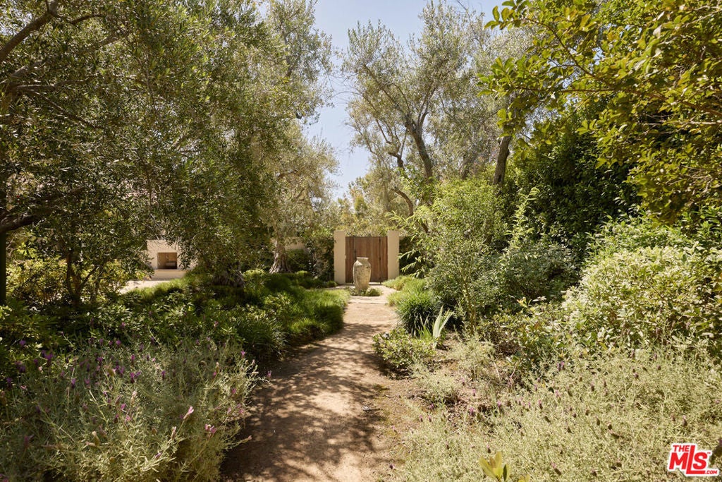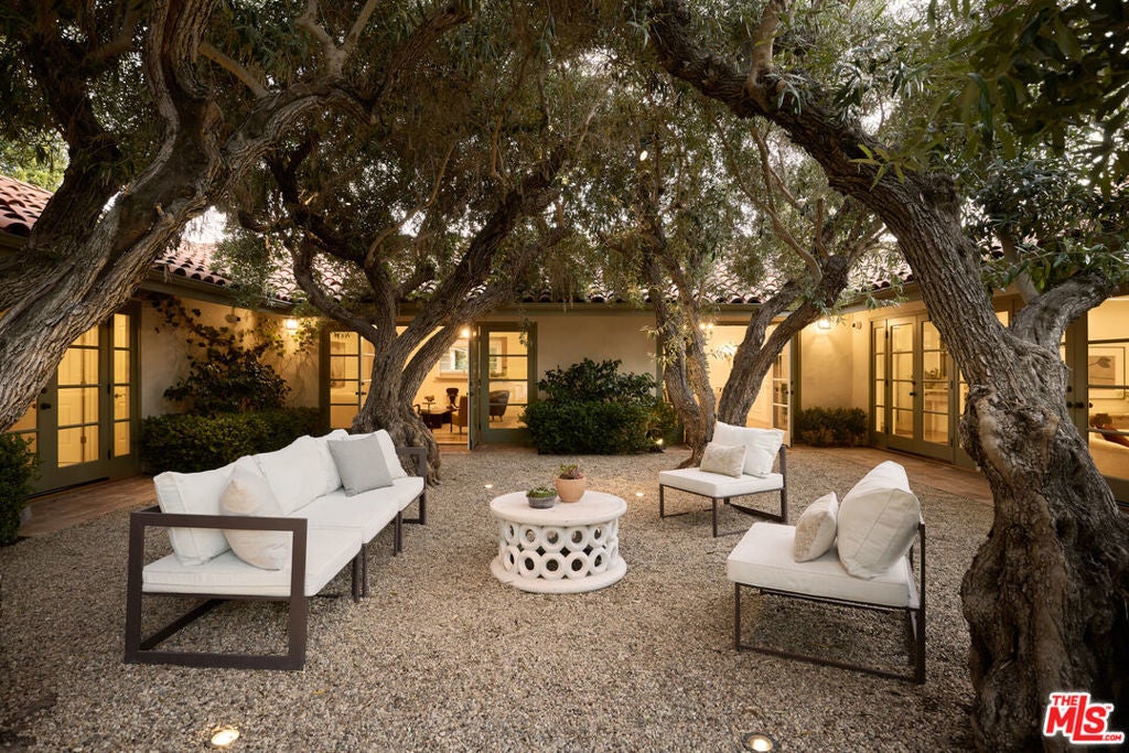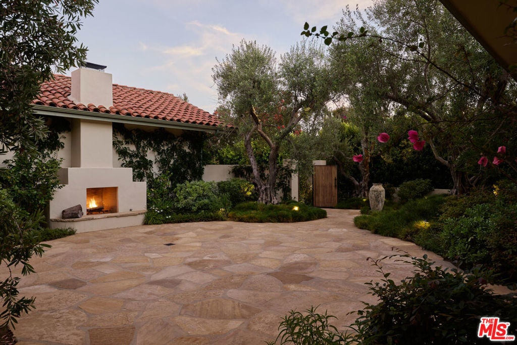 Set on a half-acre lot just moments from the Riviera Country Club, 1296 Capri Drive is a single-story estate that fuses European provenance with a thoughtful, full-scale renovation rooted in craftsmanship, indoor-outdoor flow, and connection to nature. A gated entry opens to a serene front courtyard with an outdoor fireplace, framed by mature plantings. An antique bronze and glass front door opens to expansive interiors where every room connects to the surrounding gardens. Throughout the home, old-world elements include 15th-century Italian doors from Milan, a carved Louis XV marble fireplace, and two antique French stone fountains that define the courtyard and anchor the backyard. The floor plan is organized into two distinct wings. One dedicated to the private living quarters, including the primary suite, which opens to the gardens and features dual bathrooms with a smart toilet, dry sauna, and two walk-in closets. Three additional en-suite bedrooms complete this side of the home. The opposite wing is designed for entertaining, centered around a den with a built-in bar, surround sound, antique terracotta flooring, and a climate-controlled wine wall. The main living room features a carved marble fireplace and vaulted, beamed ceilings that invite natural light throughout the day. A full wall of French doors opens to the gardens, reinforcing the seamless indoor-outdoor connection that defines the property. The kitchen was custom built by Cooper Pacific, centered around Italian feather walnut travertine counters and professional appliances that include a 64-inch Wolf range with French top and grill, two Wolf ovens (one steam), Le Cornue rotisserie, Sub-Zero refrigeration, dual Miele dishwashers, Wolf refrigerator drawers and ice maker, Irinox flash freezer and sous vide, and a built-in Natufia hydroponic grower. A walk-in pantry and separate china closet offer ample utility without compromising design. Outdoors, the landscaping is as functional as it is peaceful. Created by Garett Carlson of Landarc and Stephen Block of Inner Gardens, the grounds include a series of vegetable garden beds with lemon, orange, peach, plum, fig, mulberry, yuzu, Australian finger lime, and avocado trees. The soil and all plantings were organically treated. Additional highlights include a 2,500 bottle refrigerated wine cellar, rose-covered gazebo, built-in outdoor speakers, multiple 100-year-old Olive trees, and an area ideal for a dog run. The home features two new HVAC systems with HEPA filtration, all-new attic ducting and insulation, three water heaters (two of which are tankless), and security cameras.