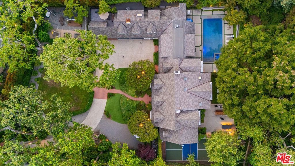 Nestled within the prestigious enclave of Mandeville Canyon, this exceptional gated estate offers an unparalleled 1.2-acre sanctuary beneath a majestic canopy of mature sycamores and oaks. Reimagined with precision and timeless vision, the 8,476-square-foot Hamptons-style residence is a masterclass in quiet luxury, blending heritage charm with contemporary sophistication to create a haven for both elegant entertaining and relaxed everyday living. Comprising eight bedrooms and ten baths, the estate has been thoughtfully curated to exude a refined sensibility. Inside, a luminous interior unfolds with reclaimed wood beams, rich oak hardwood floors, and expansive glass doors that dissolve the boundary between indoors and out, imbuing the home with warmth, texture, and a seamless connection to nature. The heart of the home is a chef's kitchen of rare caliber designed for the culinary aficionado with a 60" Wolf range, triple SubZero refrigeration, dual dishwashers, three sinks, and a generous walk-in pantry. Adjacent informal dining and a cozy TV alcove offer spaces for intimate gathering, while the formal living and dining rooms provide an ideal backdrop for sophisticated soirees. Anchoring the estate is a breathtaking two-story great room, perfectly appointed for entertaining, complete with a full bar, temperature-controlled wine cellar, and bespoke entertainment center. A richly paneled private study with a full bath offers a serene workspace or stately library retreat. Beyond the main residence, a detached one-bedroom guest house with private entrance and secluded patio offers guests a luxurious, autonomous escape. Two en-suite staff or flex bedrooms provide versatility for a home gym, office, or additional accommodations. Upstairs, the primary suite is a sanctuary of serenity, capturing treetop vistas and thoughtfully designed with a beverage bar, a marble-clad spa bath featuring a freestanding soaking tub and indulgent steam shower, and an expansive custom walk-in closet. Each additional bedroom suite offers its own tranquil ambiance, adorned with classic detailing and bathed in natural light. Outside, the grounds evoke a resort-like sensibility: a stunning ozone-purified pool and spa invite restful retreat, while fire tables, heated lounges, and a fully equipped outdoor kitchen create the ultimate stage for al fresco entertaining. A lighted pickle ball court encourages active recreation, while a treehouse and playground provide whimsical charm for all ages. Privately hedged and gated, with motor court parking for over 12 vehicles, including a two-car garage and a two-car carport the property is secured by a cutting-edge security system and offers the rare blend of seclusion and accessibility.Ideally located moments from the Brentwood Country Mart, world-class dining, luxury shopping, and scenic hiking trails, this remarkable estate is not merely a residence, it is a lifestyle defined by grace, privacy, and enduring sophistication.