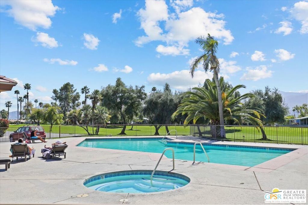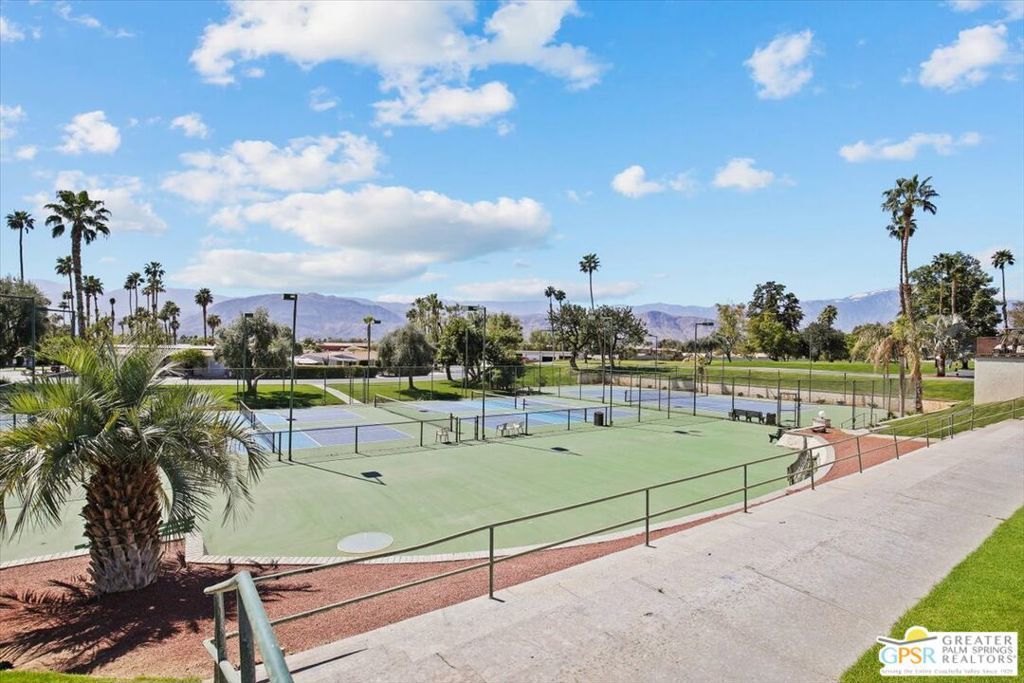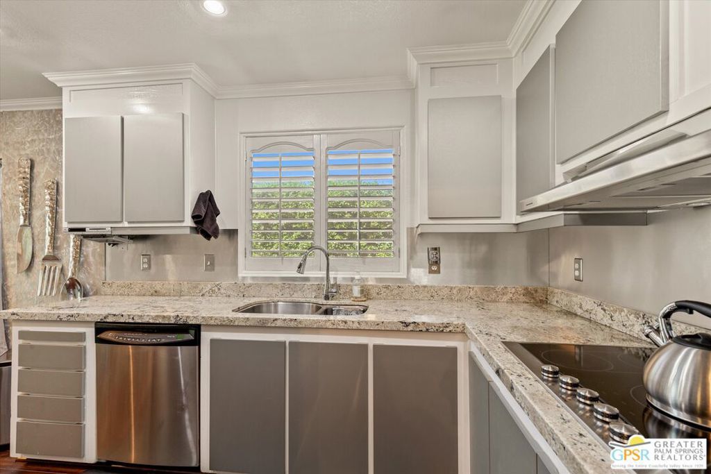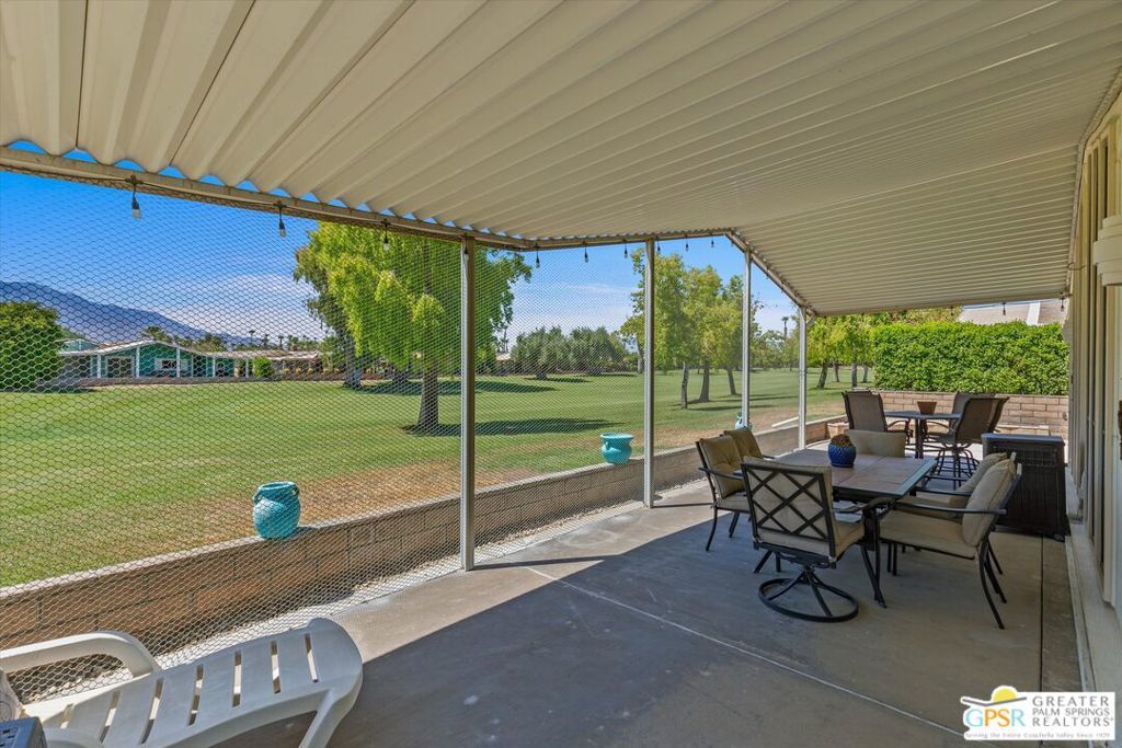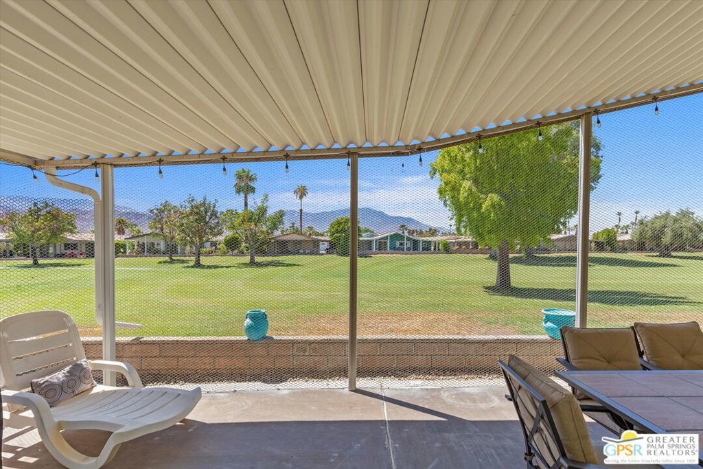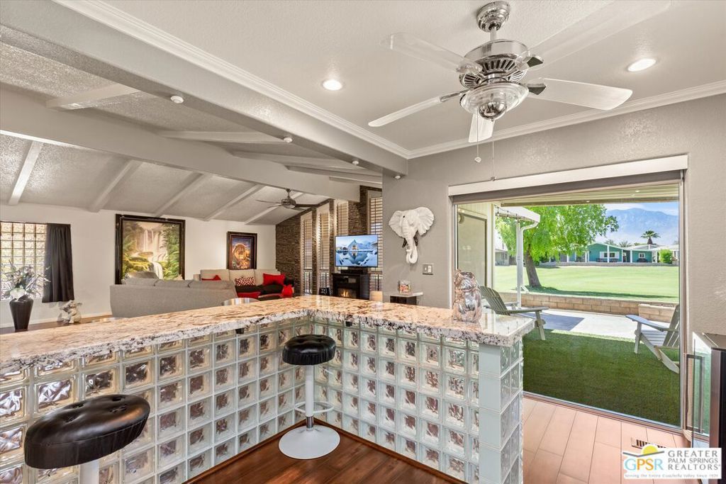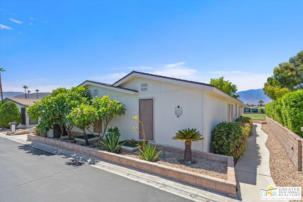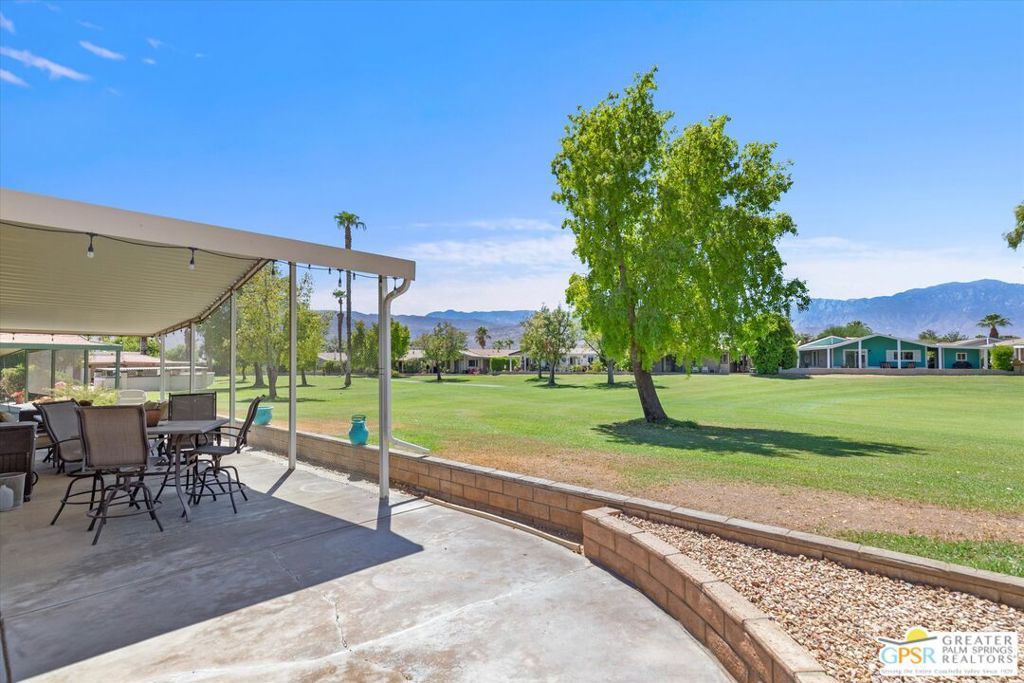 Framed by beautiful golf course views and mountain panoramas, this impressive move-in-ready fairway residence is destined to sell at Palm Desert's gated Suncrest Country Club, which is reserved for those who are 55 and better. The spacious triple-wide design extends approximately 1,920 square feet over one level and impresses with a large living room with fireplace, views and floor-to-ceiling windows. Living areas flow effortlessly to a chic walk-in wet bar and a dining room with built-in buffet and mirrored display shelves. Light and open with a vaulted and beamed ceiling, the interior is enviably private and welcomes fabulous entertaining and simple relaxation. Completely reimagined, the open kitchen is adorned with artistic stainless steel wall panels, granite countertops, mosaic tile, a breakfast bar, access to a covered patio, crown molding, a walk-in pantry and stainless steel appliances. Two bedrooms and two upgraded baths are showcased, with the secondary bedroom currently featured as a massive walk-in closet with furniture-caliber built-ins. This room can easily be transformed back into a bedroom. An opulent sanctuary, the primary suite displays a custom accent wall, custom office with built-in desk and cabinets, and a spacious remodeled bath with soaking tub, walk-in shower and separate sinks. Extras include solar power, a security system, whole house audio, plantation shutters and a newer roof. The backyard is located directly on the edge of the golf course, providing gorgeous unobstructed views from two covered patios. For added convenience, the home's carport accommodates two vehicles. Located in the heart of Palm Desert, Suncrest Country Club presents a luxurious clubhouse with billiards, library, locker rooms, pro shop and cafe. Residents enjoy easy access to a trio of swimming pools, in-ground spas, lighted tennis and pickleball courts, and a gorgeous 9-hole golf course. Premium resorts, abundant shopping, countless restaurants, and Eisenhower Medical Center are moments away, and Rancho Mirage and Palm Springs are nearby.