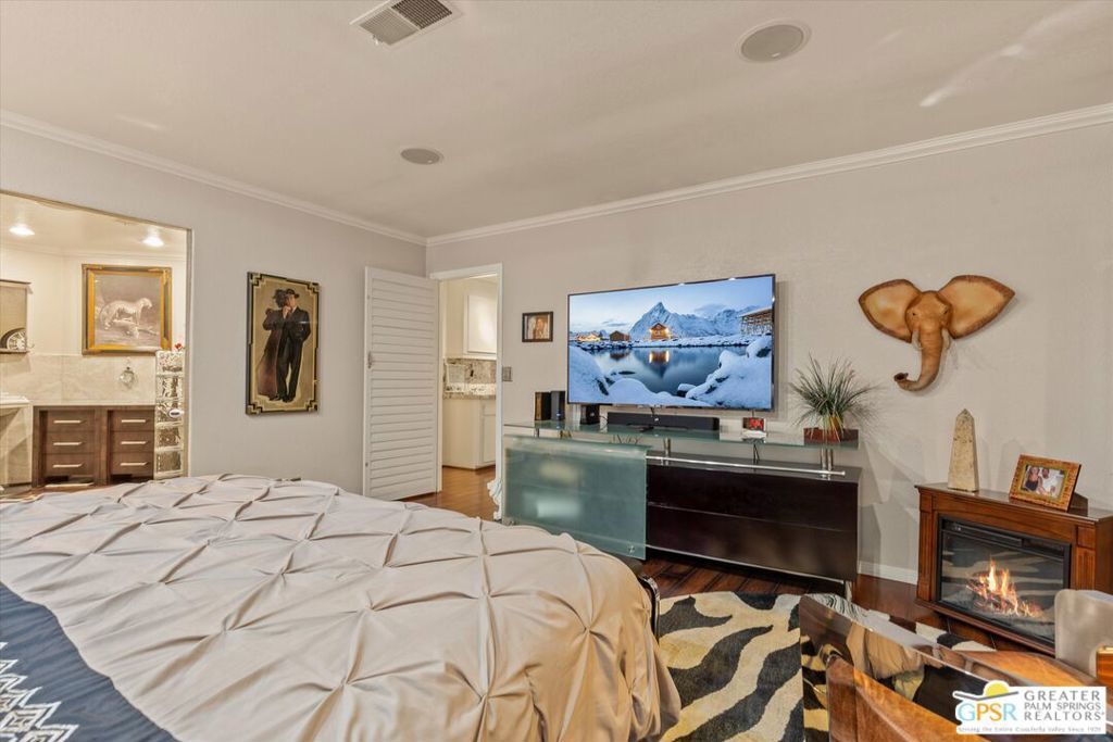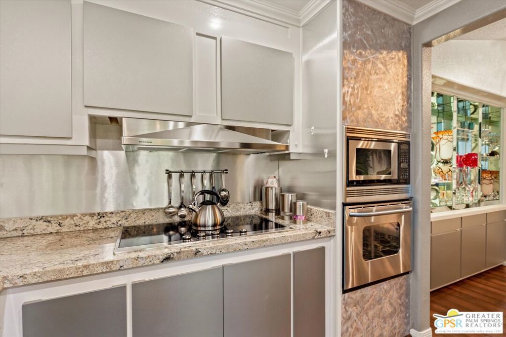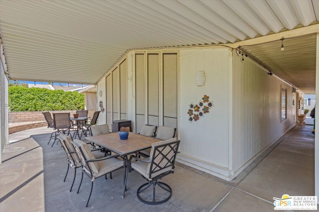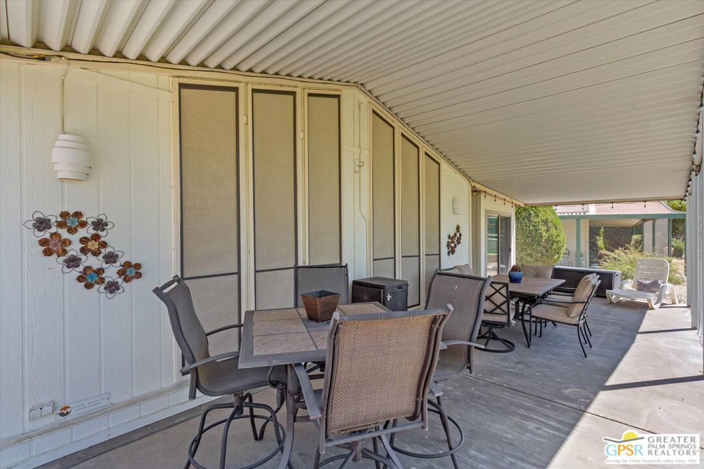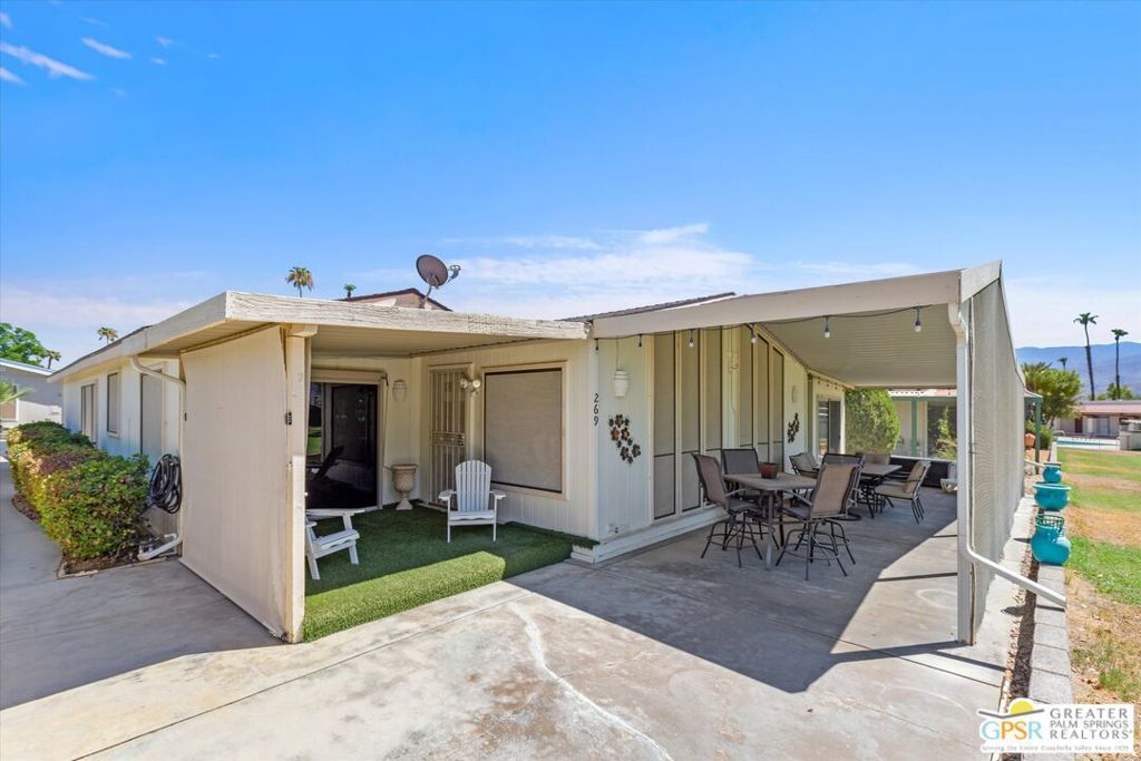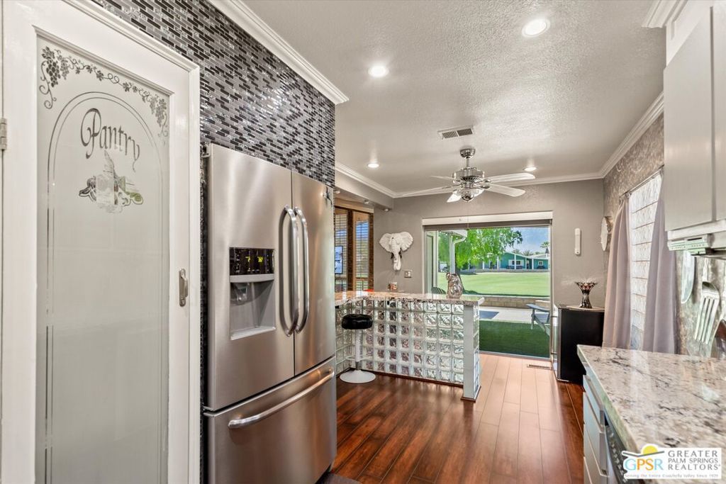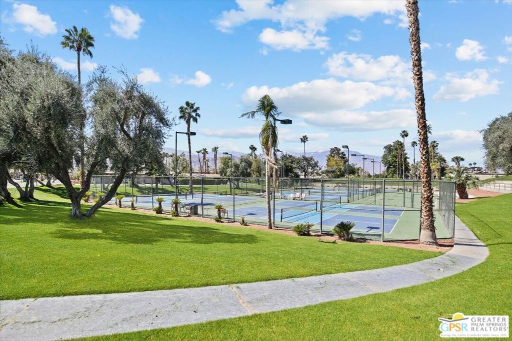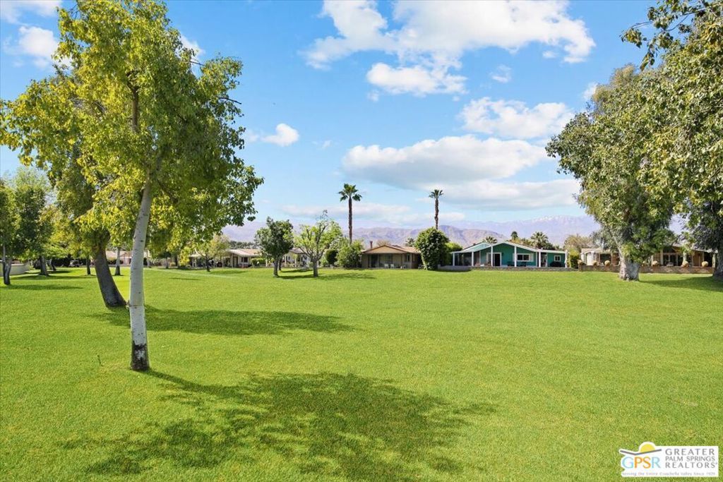 Framed by beautiful golf course views and mountain panoramas, this impressive move-in-ready fairway residence is destined to sell at Palm Desert's gated Suncrest Country Club, which is reserved for those who are 55 and better. The spacious triple-wide design extends approximately 1,920 square feet over one level and impresses with a large living room with fireplace, views and floor-to-ceiling windows. Living areas flow effortlessly to a chic walk-in wet bar and a dining room with built-in buffet and mirrored display shelves. Light and open with a vaulted and beamed ceiling, the interior is enviably private and welcomes fabulous entertaining and simple relaxation. Completely reimagined, the open kitchen is adorned with artistic stainless steel wall panels, granite countertops, mosaic tile, a breakfast bar, access to a covered patio, crown molding, a walk-in pantry and stainless steel appliances. Two bedrooms and two upgraded baths are showcased, with the secondary bedroom currently featured as a massive walk-in closet with furniture-caliber built-ins. This room can easily be transformed back into a bedroom. An opulent sanctuary, the primary suite displays a custom accent wall, custom office with built-in desk and cabinets, and a spacious remodeled bath with soaking tub, walk-in shower and separate sinks. Extras include solar power, a security system, whole house audio, plantation shutters and a newer roof. The backyard is located directly on the edge of the golf course, providing gorgeous unobstructed views from two covered patios. For added convenience, the home's carport accommodates two vehicles. Located in the heart of Palm Desert, Suncrest Country Club presents a luxurious clubhouse with billiards, library, locker rooms, pro shop and cafe. Residents enjoy easy access to a trio of swimming pools, in-ground spas, lighted tennis and pickleball courts, and a gorgeous 9-hole golf course. Premium resorts, abundant shopping, countless restaurants, and Eisenhower Medical Center are moments away, and Rancho Mirage and Palm Springs are nearby.