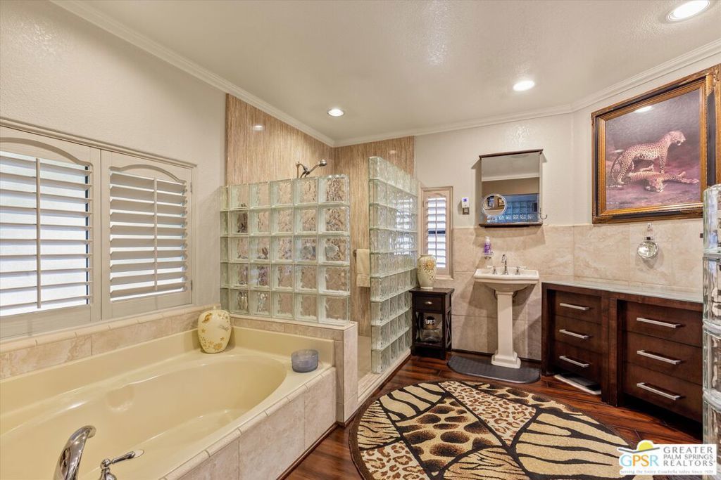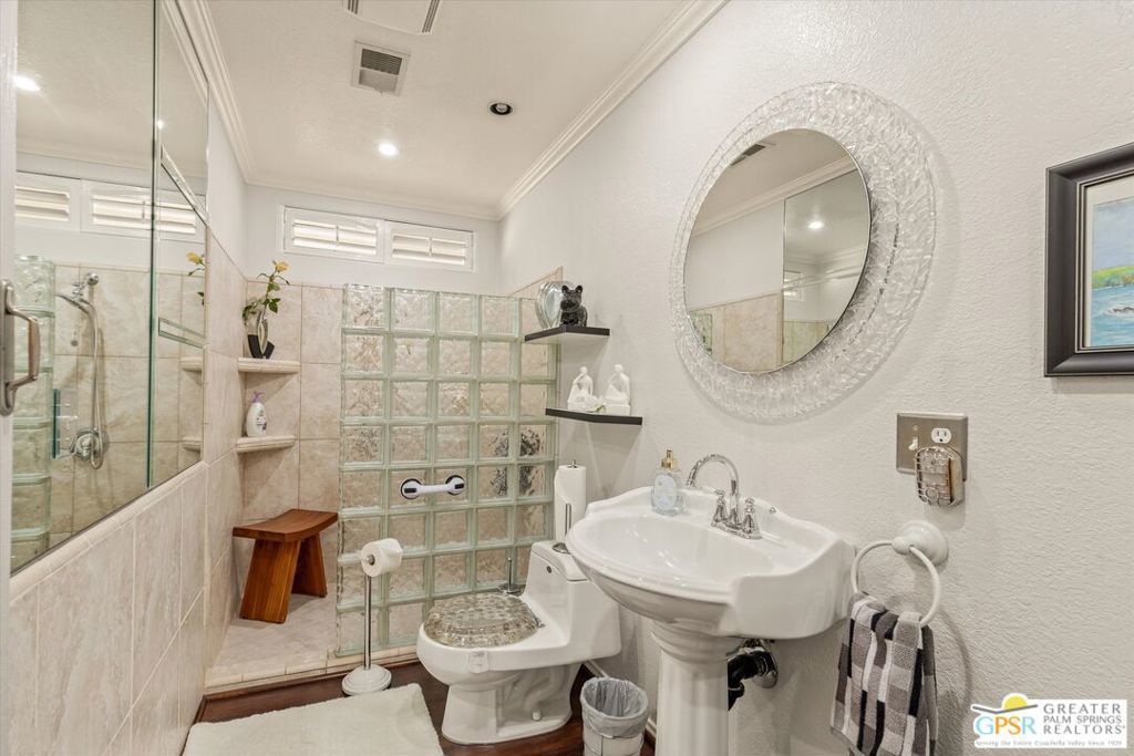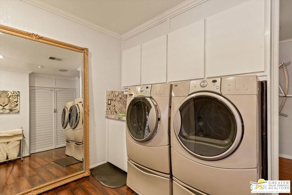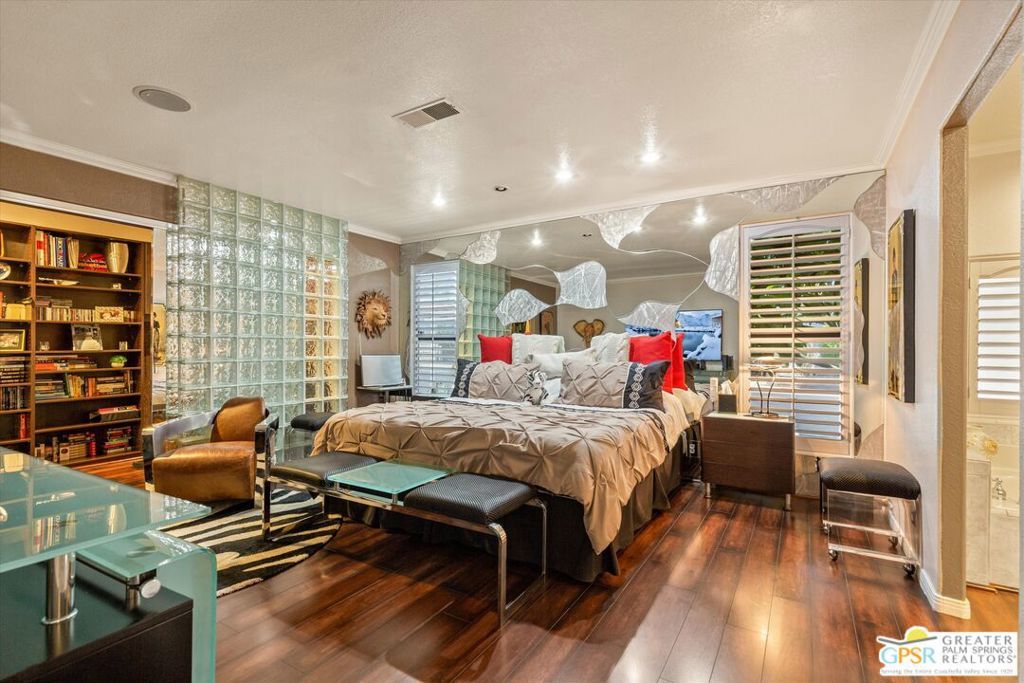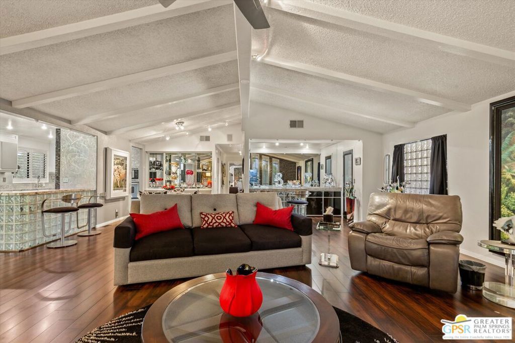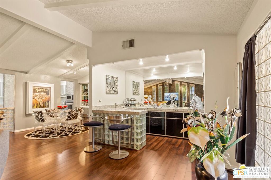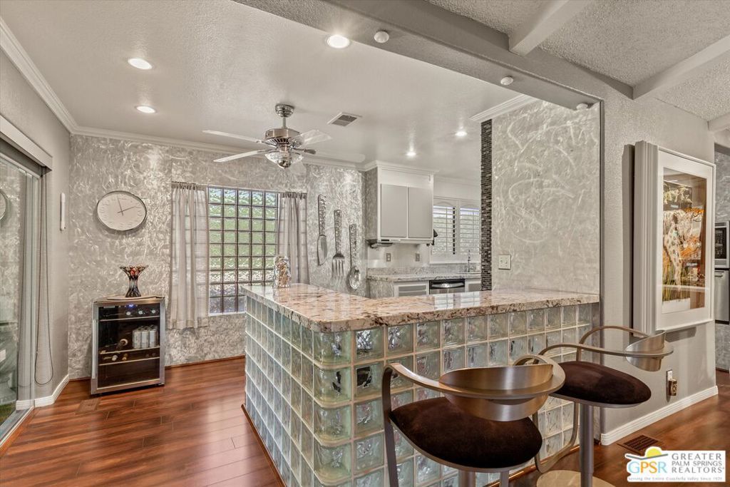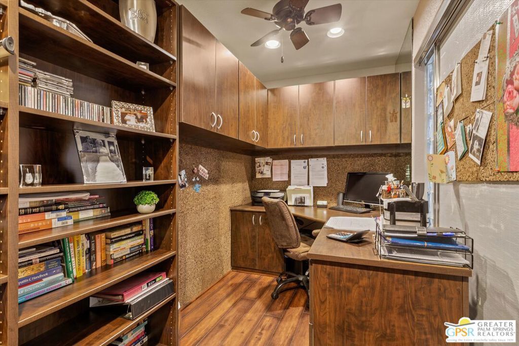 Framed by beautiful golf course views and mountain panoramas, this impressive move-in-ready fairway residence is destined to sell at Palm Desert's gated Suncrest Country Club, which is reserved for those who are 55 and better. The spacious triple-wide design extends approximately 1,920 square feet over one level and impresses with a large living room with fireplace, views and floor-to-ceiling windows. Living areas flow effortlessly to a chic walk-in wet bar and a dining room with built-in buffet and mirrored display shelves. Light and open with a vaulted and beamed ceiling, the interior is enviably private and welcomes fabulous entertaining and simple relaxation. Completely reimagined, the open kitchen is adorned with artistic stainless steel wall panels, granite countertops, mosaic tile, a breakfast bar, access to a covered patio, crown molding, a walk-in pantry and stainless steel appliances. Two bedrooms and two upgraded baths are showcased, with the secondary bedroom currently featured as a massive walk-in closet with furniture-caliber built-ins. This room can easily be transformed back into a bedroom. An opulent sanctuary, the primary suite displays a custom accent wall, custom office with built-in desk and cabinets, and a spacious remodeled bath with soaking tub, walk-in shower and separate sinks. Extras include solar power, a security system, whole house audio, plantation shutters and a newer roof. The backyard is located directly on the edge of the golf course, providing gorgeous unobstructed views from two covered patios. For added convenience, the home's carport accommodates two vehicles. Located in the heart of Palm Desert, Suncrest Country Club presents a luxurious clubhouse with billiards, library, locker rooms, pro shop and cafe. Residents enjoy easy access to a trio of swimming pools, in-ground spas, lighted tennis and pickleball courts, and a gorgeous 9-hole golf course. Premium resorts, abundant shopping, countless restaurants, and Eisenhower Medical Center are moments away, and Rancho Mirage and Palm Springs are nearby.