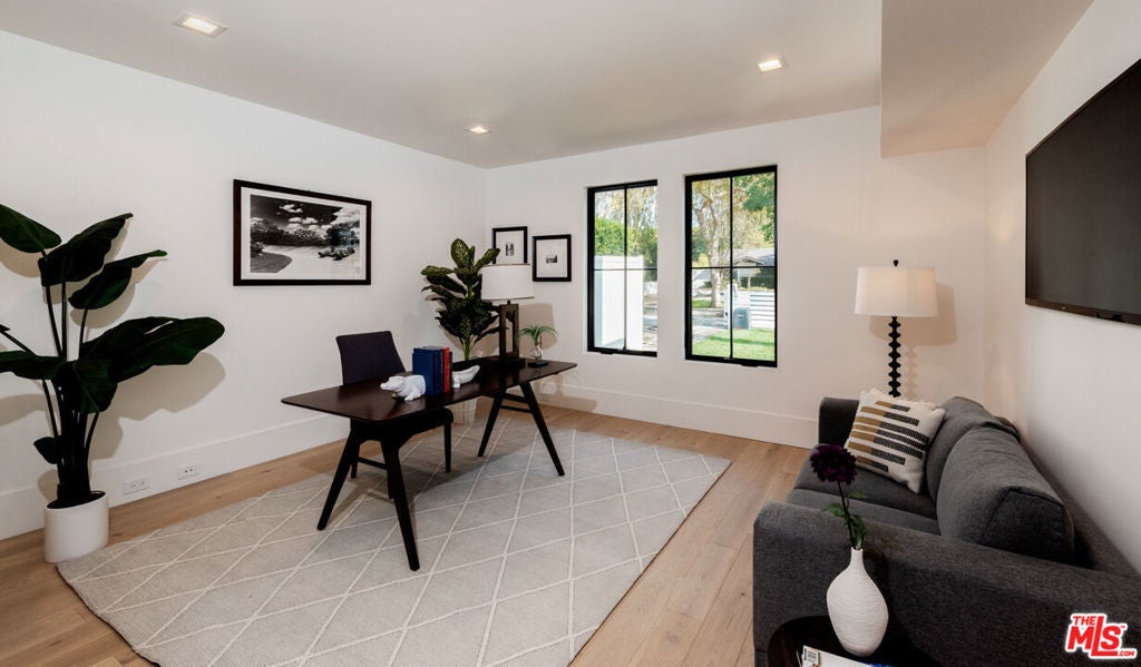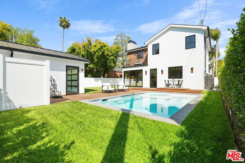 Perfectly located in the Footbridge neighborhood of Studio City and in Carpenter School District is this meticulously crafted 3-level new construction home. The open concept floor plan provides a perfect flow, while wood floors and walnut accents lend sophistication and elegance. Throughout the home are multiple areas to entertain, flowing from the living room with soaring vaulted ceilings through the spacious open dining room and into the family room. The gourmet kitchen boasts Calacutta marble countertops, spacious island with breakfast bar, large SubZero refrigerator, Wolf range & microwave, dual Fisher & Paykel dishwashers, a custom designed wood detailing on the range hood, and a walk-in pantry. Upstairs, the Primary Suite includes a bright and warm bedroom surrounded by windows, spacious walk-in closet, private balcony, and a spa-like ensuite bathroom with soaking tub. Two additional bedrooms, laundry, and a patio round out the upstairs living areas, while one more bedroom with ensuite bathroom and an office are featured on the main level. An expansive basement with a large movie theater further expands the entertaining possibilities, with space for a game room, home gym, and/or additional office. The backyard is a true oasis with a large pool & spa, sundeck, and plenty of space for alfresco dining. The innovative GrassPave driveway ideally serves multiple functions, providing extra yard space and expanding the lush landscaping. Savant smart home technology is fully integrated and triple-zone HVAC adds to the ease of modern living. Located just moments away from all the best shops and restaurants that Studio City has to offer, this property is an opportunity not to be missed.