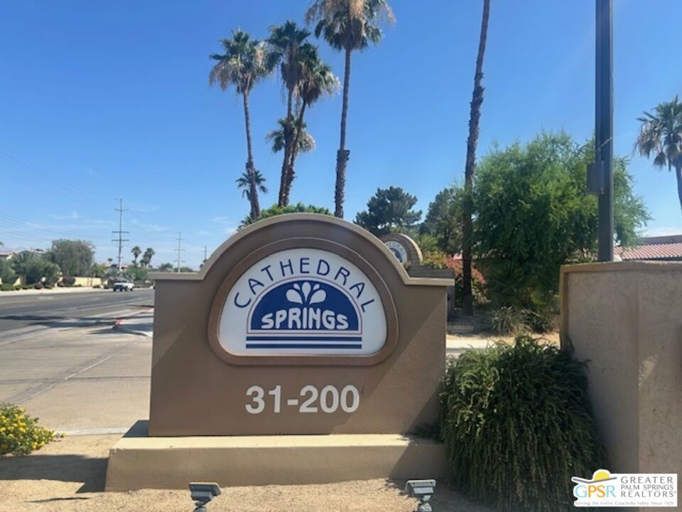 Welcome to Cathedral Springs! A vibrant and well maintained complex of 248 homes in a gated community conveniently located near dining, shopping and local amenities. This two bedroom lower level home is perfect for a homeowner not interested in lugging groceries, etc. up stairs. The kitchen, right off the dining area, boasts an open concept with stainless steel appliances. The master bedroom features its own en-suite bathroom and opens out to a patio that is perfect for enjoying morning or evening beverages while overlooking the tranquil grounds. One closet has hook ups for a stacked washer and dryer. Located just steps from one of four pools, this complex offers well-maintained open spaces, Barbeque area and a fitness center. This is the perfect combination location, serenity and desert lifestyle!