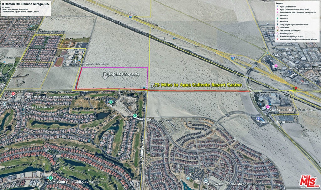 Located in the Rancho Mirage area and under Riverside County jurisdiction, this expansive 80+ acre parcel offers a rare opportunity for large-scale development in one of the Coachella Valley's most strategic corridors. With over 2,600 feet of linear frontage on Ramon Road, the site benefits from exceptional visibility and access along a major route connecting Interstate 10 to Palm Springs.Positioned within walking distance of Agua Caliente Casino Rancho Mirage, and directly west of Mission Hills Country Club, the property is ideally situated near major amenities, making it a strong candidate for future residential, commercial, or mixed-use development.HighlightsSize & Frontage: 80+ acres with over 2,600 feet of frontage on Ramon RoadLocation: High-traffic corridor from I-10 into the Coachella ValleyJurisdiction: Unincorporated Riverside CountyAdjacent to: Mission Hills Country ClubNearby: Agua Caliente Casino Rancho MirageDevelopment Potential: Residential, mixed-use, or hospitality (subject to approvals)Regional Rarity: Among the largest undeveloped parcels currently available in the areaDevelopment PotentialThis offering presents a significant opportunity to bring a visionary project to one of the most sought-after growth areas in Riverside County. The site's location, size, and proximity to resort and residential communities position it well for a range of development paths, subject to appropriate entitlements and planning.