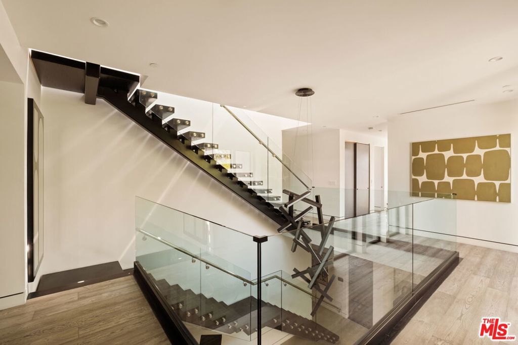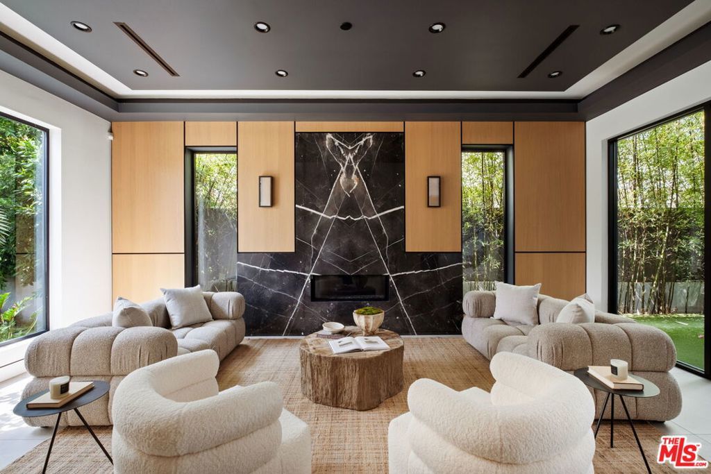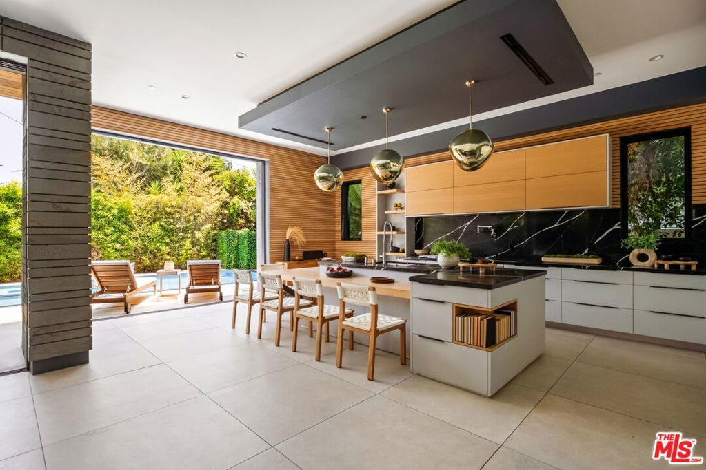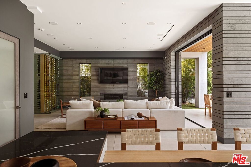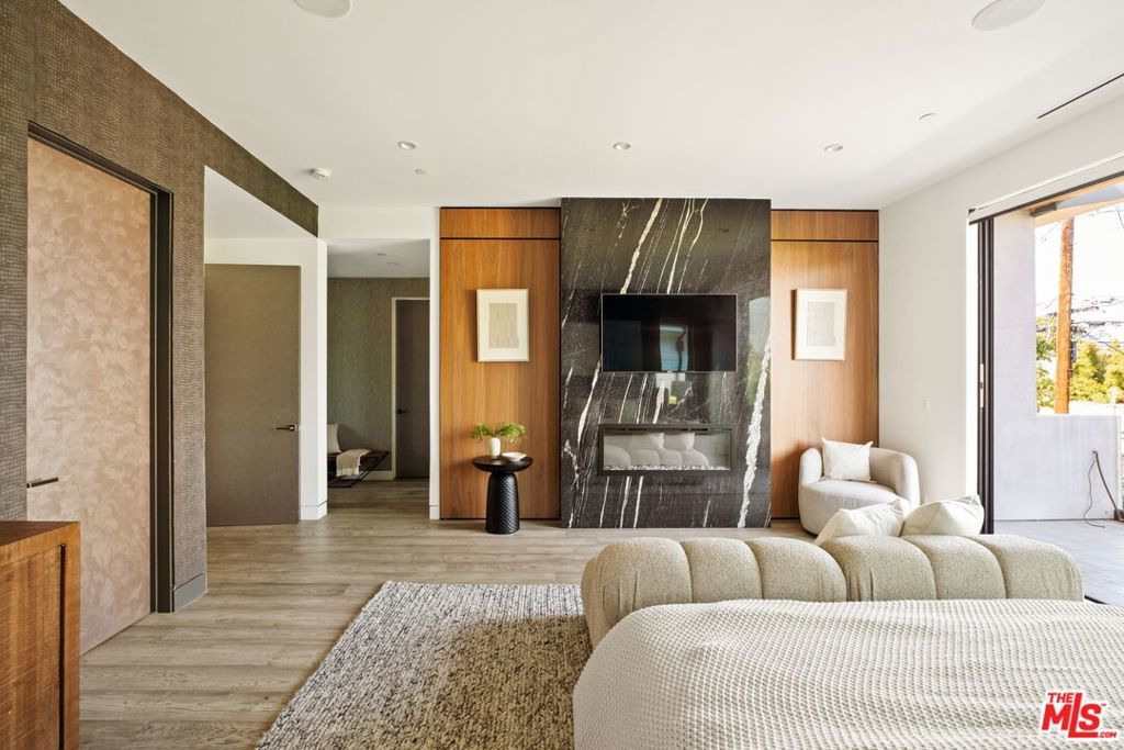 Step into this striking architectural residence, boasting a large rooftop with views of the Hollywood sign, Griffith Observatory, downtown LA, Century City and beyond! A private sanctuary set in one of Los Angeles' most coveted neighborhoods. Designed for luxurious living and effortless entertaining, this home offers a seamless blend of sophistication, comfort, and cutting-edge innovation. A grand open-concept layout welcomes you with soaring ceilings, expansive walls of glass, and an abundance of natural light. The chef-inspired kitchen is a centerpiece, featuring a full suite of premium Miele appliances, sleek cabinetry, and an oversized island perfect for casual dining or social gatherings. A stylish family room and formal living area flow into a lush courtyard, anchored by a dramatic indoor-outdoor connection through disappearing pocket doors. From intimate dinners to large-scale events, the main level offers a full bar, a glass-enclosed wine wall, a media room, and a private guest suite. A floating glass staircase leads to the upper level, where you'll find four generous ensuite bedrooms. The primary retreat is a serene escape with dual walk-in closets, a private balcony, and a spa-quality bath outfitted with a soaking tub, rainfall shower, double vanity, and high-tech amenities including a smart toilet and heated towel rack. For those who appreciate California's signature indoor-outdoor lifestyle, the rooftop deck offers expansive panoramic views, a built-in outdoor kitchen, fire pit, and plenty of lounge space to take in the sunset. Down below, the backyard is a resort-style oasis with a zero-edge pool and spa, custom outdoor shower, and beautifully landscaped grounds surrounded by privacy hedges. This smart home is equipped with Crestron automation, integrated speakers, dual-zone climate control, solar power with Tesla wall batteries, EV charging, and a whole-house water filtration and softener system. Additional features include an executive office, fitness room, marble-accented fireplaces, and a secure two-car garage with gated driveway access. Tucked away in a premier location just steps from The Grove, boutique shopping, and top-tier dining, this home is a rare opportunity to own a modern masterpiece in the cultural heart of L.A.
