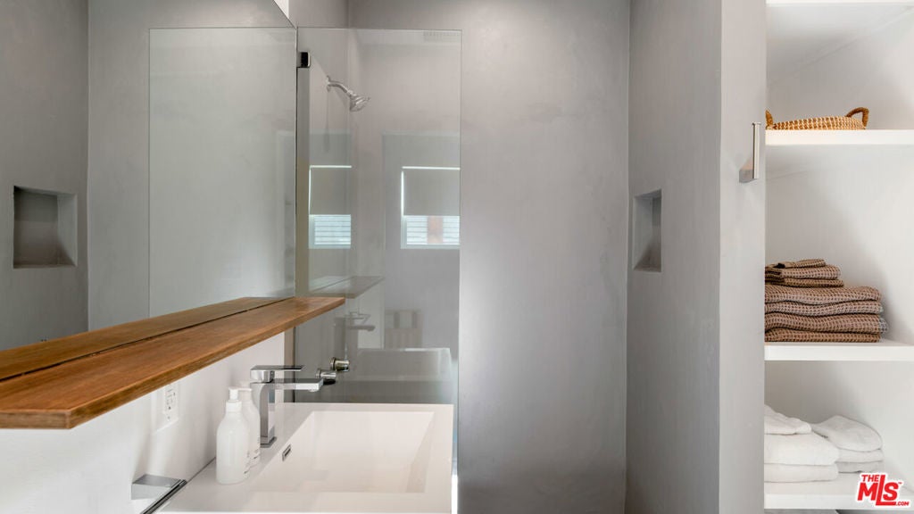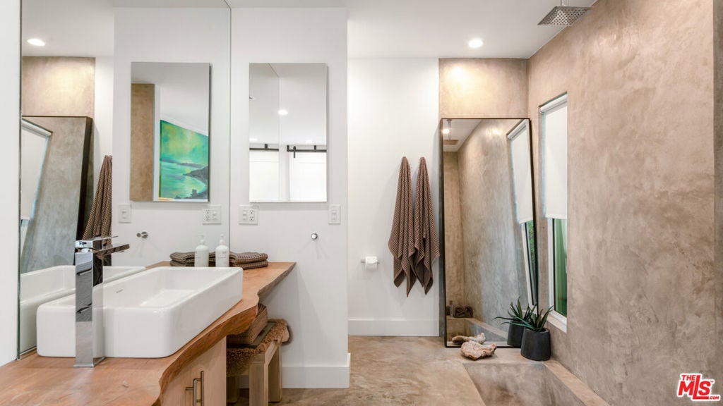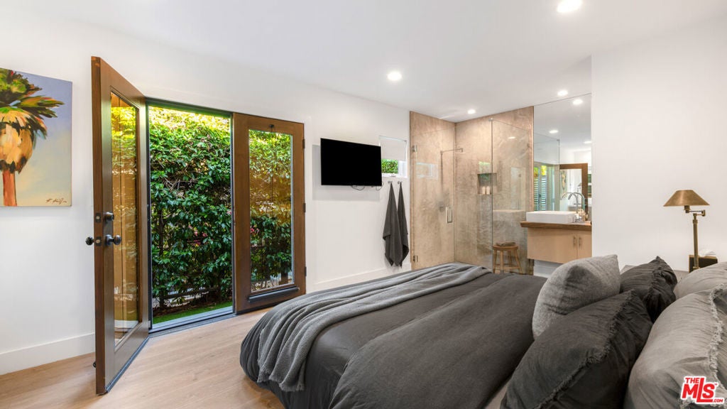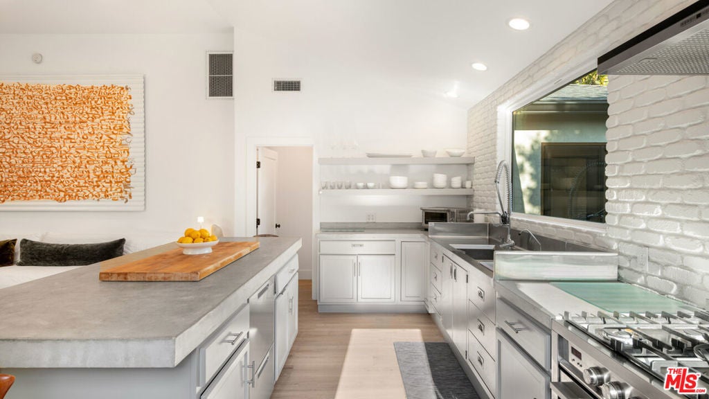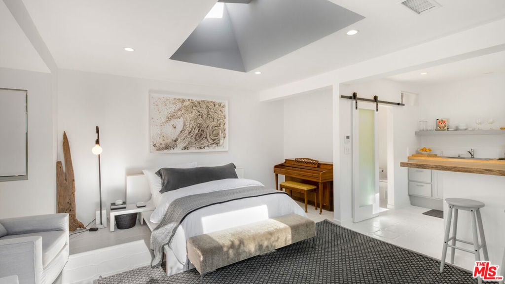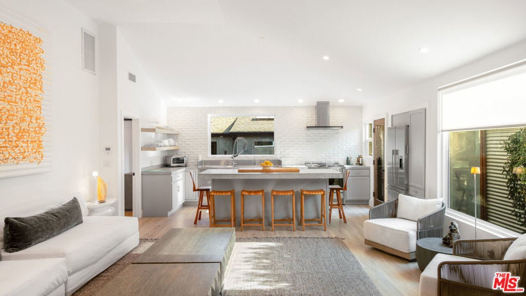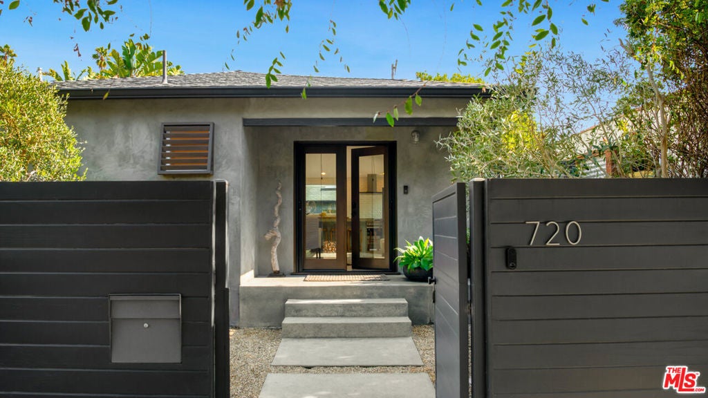 Welcome to this stunning, gated estate where timeless elegance meets modern convenience. The front yard greets you with a serene combination of pebble gravel pathways, stately olive trees, and a meticulously designed stone paver pathway. Cement steps lead to the covered front entry, highlighted by a sleek glass-and-wood front door equipped with a Ring camera for added security. The professionally landscaped grounds feature a drip irrigation system, ensuring effortless upkeep of the lush greenery.Step inside to an expansive main living area with soaring ceilings, recessed lighting, and warm wood floors that flow throughout. This bright, open space offers a seamless connection to the home's other key areas, creating a perfect setting for relaxation and entertaining. Just off the living room is a stylish powder room with a modern vanity and wood flooring. Adjacent to the living space is a thoughtfully designed bedroom featuring French doors to a spacious closet, a built-in desk space, and an en-suite bathroom. The en-suite offers a shower stall, wood counters, and a private water closet, all illuminated by recessed lighting.The chef's kitchen is a true masterpiece, boasting wood floors, abundant natural light, and a blend of functional and aesthetic elements. A large cement-topped island with bar seating anchors the space, complemented by built-in shelving, commercial-grade stainless steel counters with a drying rack area, and premium Fisher & Paykel appliances, including a 5-burner range with hood fan, convection oven, and fridge with a freezer drawer and water line. The exposed white brick wall adds character and charm, while the integrated water filter and generous pantry space enhance practicality.The primary suite, located just off the kitchen, is a tranquil retreat featuring high ceilings, recessed lighting, and wood floors. French doors open to the backyard, while sliding barn doors reveal a spacious closet. The primary bathroom is a spa-like sanctuary with cement floors, a built-in soaking tub with a rainfall showerhead above, wood counters, and a vanity with an additional makeup station.The backyard is an entertainer's dream, thoughtfully designed for both relaxation and recreation. Cement steps lead down to a central gathering area with a built-in fire pit surrounded by a cozy built-in couch. Box gardens, lemon trees, and a turf lawn provide lush, low-maintenance landscaping, while a separate dining area with a mirrored accent wall offers a chic outdoor dining experience. The gated yard also includes palm trees, a storage cabinet, and a side yard with a charming children's swing and additional turf landscaping.A detached structure adds versatility to the property. The 2-car garage features a tankless water heater, Tesla charger, LG washer and dryer, and ample storage space. Beyond the garage, a private guest suite offers a luxurious escape with tile floors, vaulted ceilings, a skylight, and recessed lighting. The guest suite includes a cozy seating area, sliding wood doors, a kitchenette equipped with butcher block counters, built-ins, a Whirlpool mini fridge, and a 2-burner range. A sliding barn door leads to the guest bathroom, which includes built-in shelving, a sink vanity, and a shower stall.With AC/heat throughout and negotiable furnishings, this home combines luxury, comfort, and modern convenience in one exceptional package. Perfectly designed for multi-generational living, entertaining, and serene everyday life, this property truly has it all.