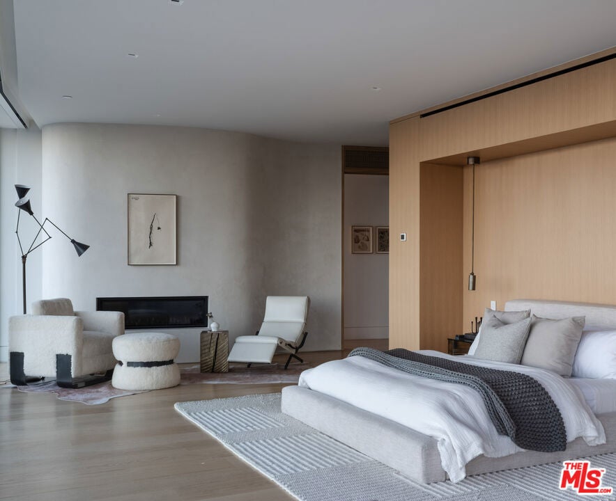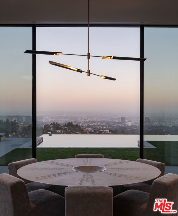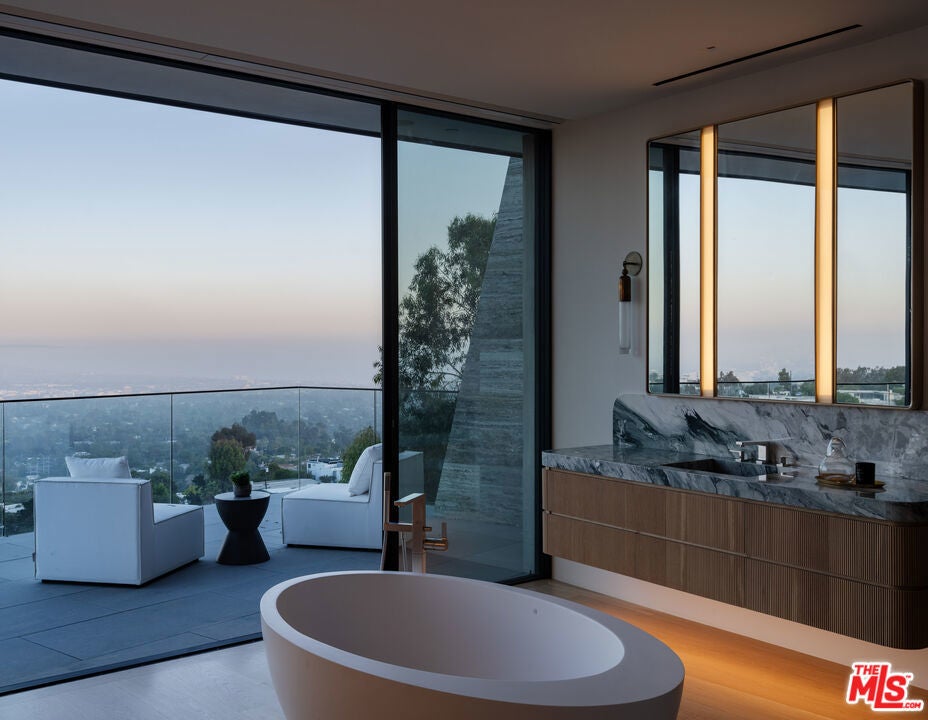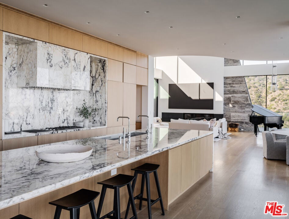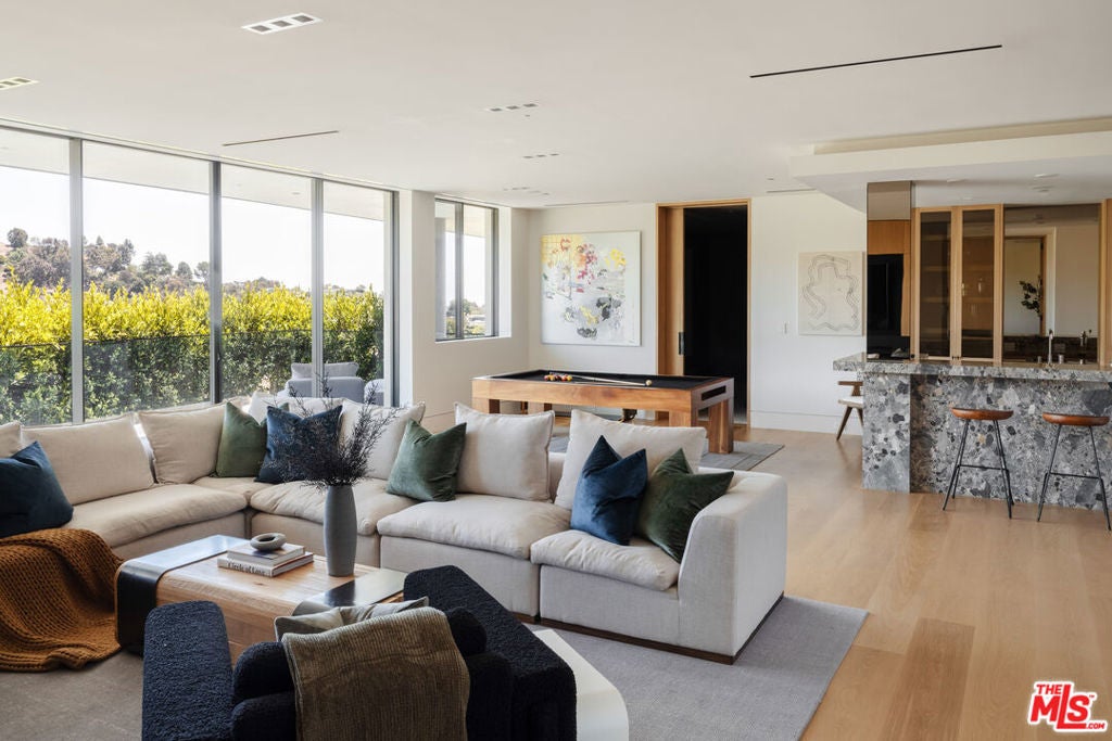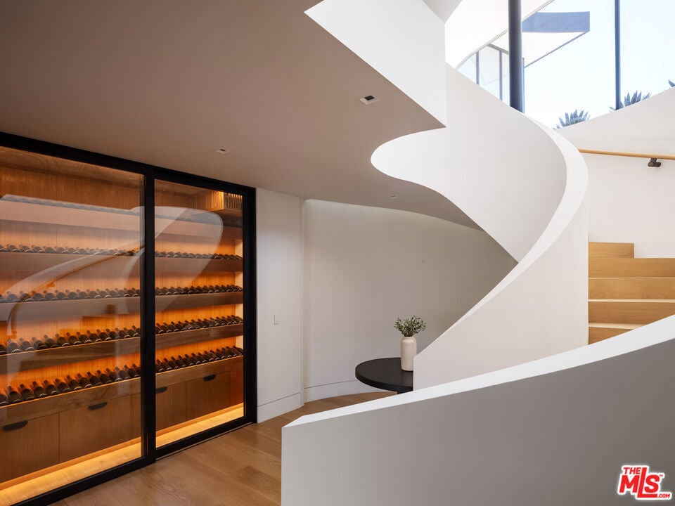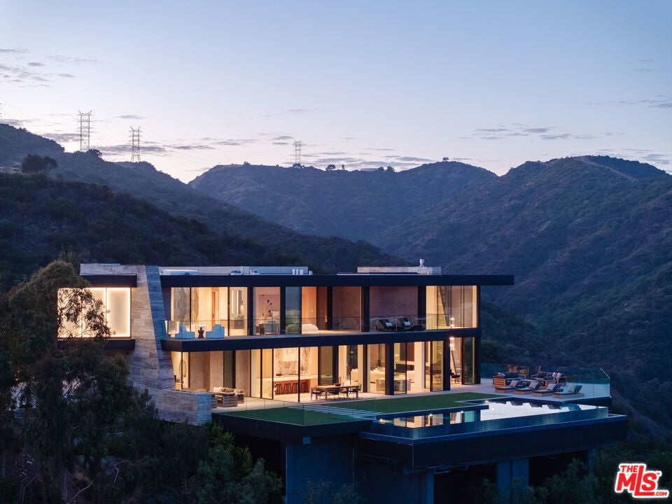 Positioned atop a private knoll in Brentwood, this custom contemporary estate by Landry Design Group merges sleek modern design with sweeping southern vistas, from the city basin to the Pacific Ocean. Set on nearly an acre behind a gated driveway, the property delivers privacy and serenity, anchored by stone sourced from the finest quarries in Pietrasanta and Carrara. Floor-to-ceiling glass walls showcase a custom, exhibition-quality spiral staircase and flood the foyer with natural light. The design unfolds into a great room with 360-degree views and a gallery-style kitchen centered around a marble waterfall island. Integrated appliances enhance both form and function. Expansive Otiima doors open to a backyard oasis: a pool and infinity spa sit adjacent to a gourmet outdoor kitchen all set within landscaped grounds. The glass-walled primary suite complete with terrace access, lounge area, fireplaces, dual closets, and a spa-like bath serves as the home's crowning feature. Boasting a private elevator and a suite of high-end amenities, the property balances architectural excellence with functional luxury. Nestled near Kenter's hiking paths and Southern California's coast, 1504 Kenter provides an exclusive sanctuary without sacrifice.