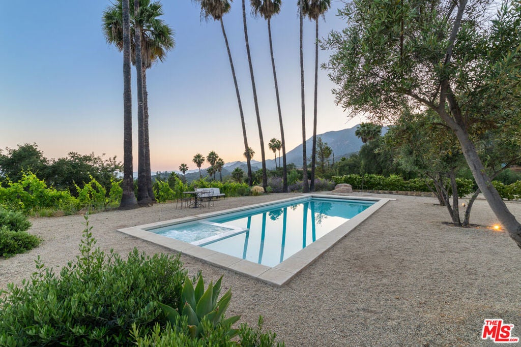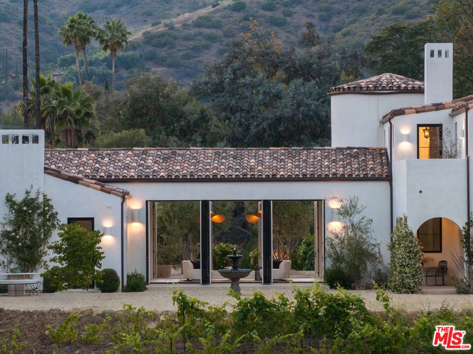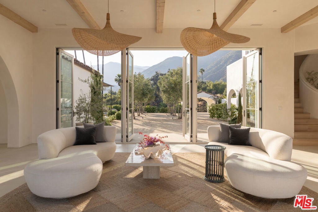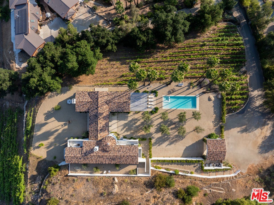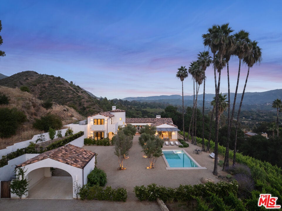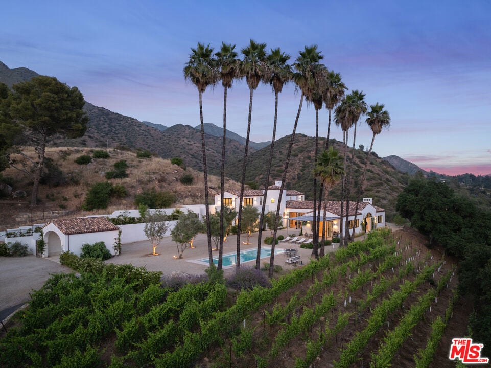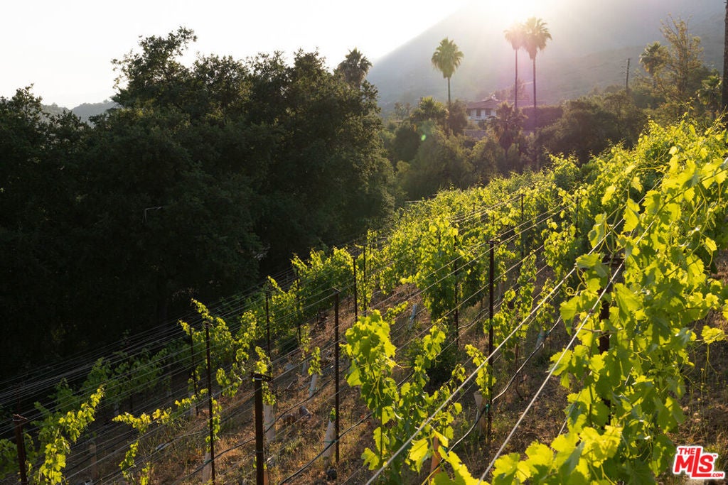 Perched on a private knoll in Ojai's coveted East End, this 2023-built estate blends modern Mediterranean design with refined living. The 5,100 sq ft villa sits on nearly two secluded acres and includes a fully licensed, organically farmed boutique vineyard with over 1,300 mature vines.Thoughtfully crafted with top-tier materials, the home features a dramatic great room with 12-foot ceilings, floor-to-ceiling French doors, groin-vaulted ceilings, and a sculptural circular staircase. White cement floors, hand-plastered walls, and arched passageways add timeless elegance.Designed for both entertaining and everyday luxury, the chef's kitchen boasts Sub-Zero refrigeration, Fisher & Paykel ovens, and Waterworks fixtures, flowing into open dining spaces and a veranda perfect for enjoying Ojai's "Pink Moment" sunsets.Four private bedroom suites, each with spa-style baths and outdoor terraces, provide serene retreats. The grounds offer ancient oaks, an olive allee, drought-tolerant gardens, a heated pool, spa, and multiple outdoor living areas.This estate combines beauty with function. Plans for an ADU, a potential winemaking facility, and safety features like fire-resistant materials, private hydrant, and emergency turnaround ensure long-term peace of mind.A rare blend of design, nature, and opportunitythis East End estate is more than a home; it's a legacy.