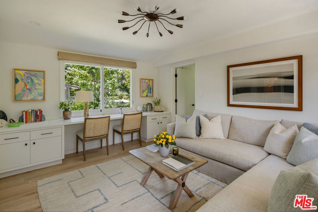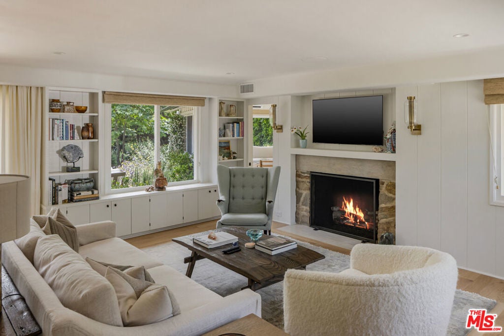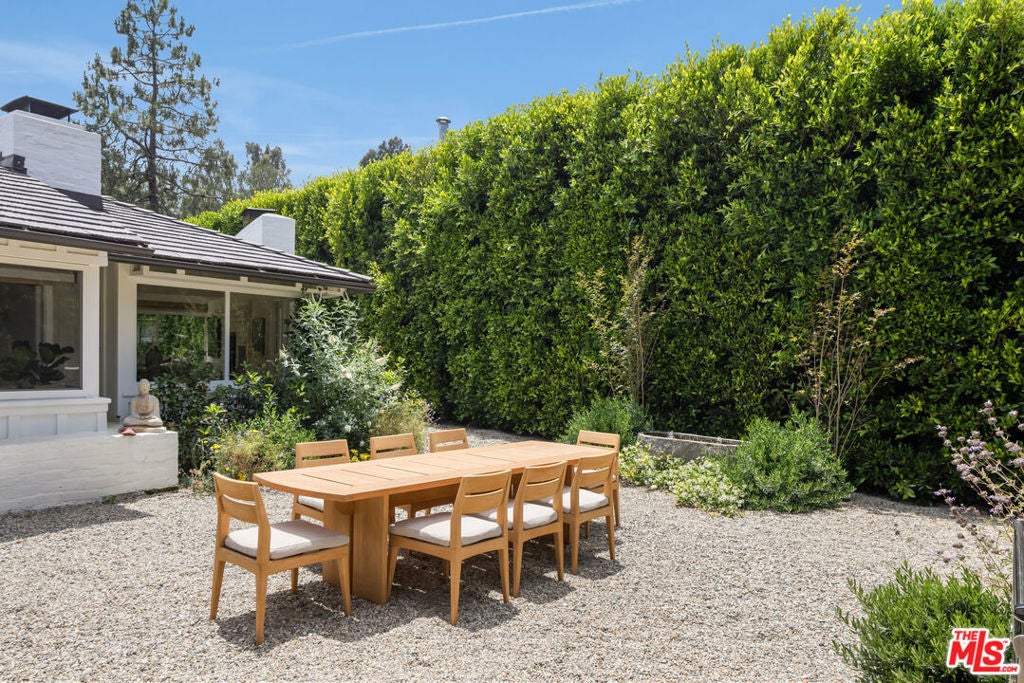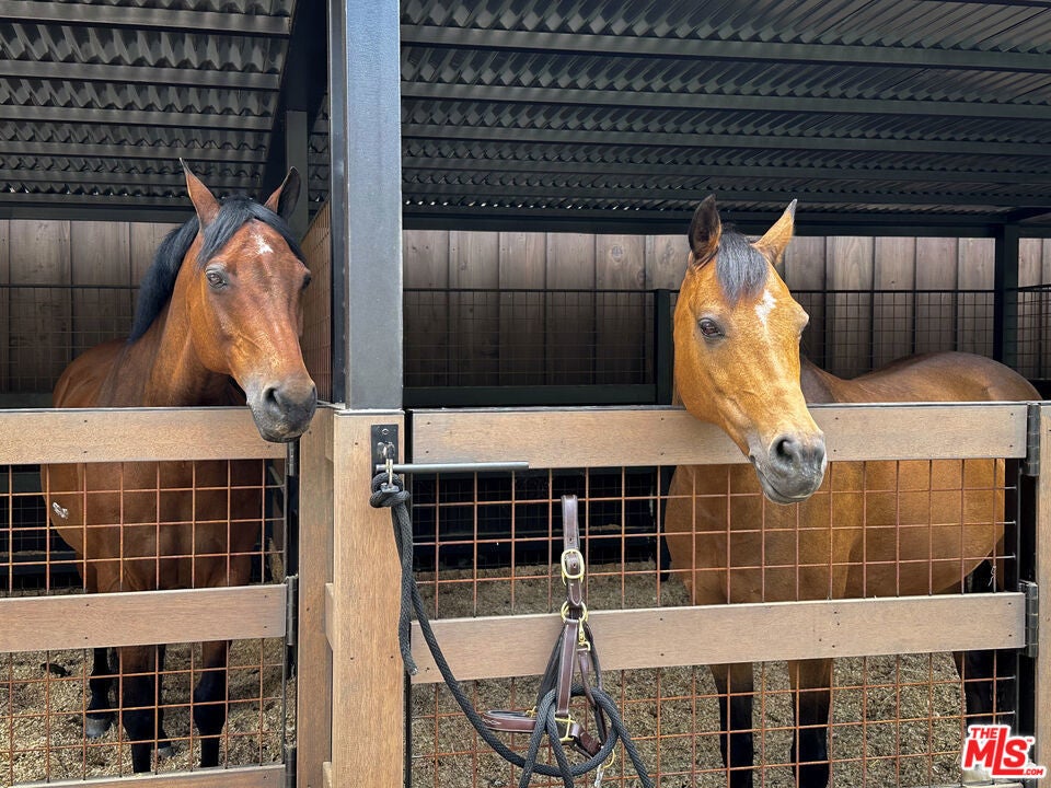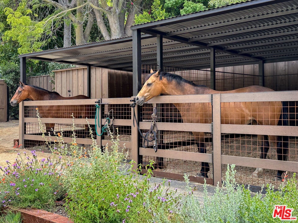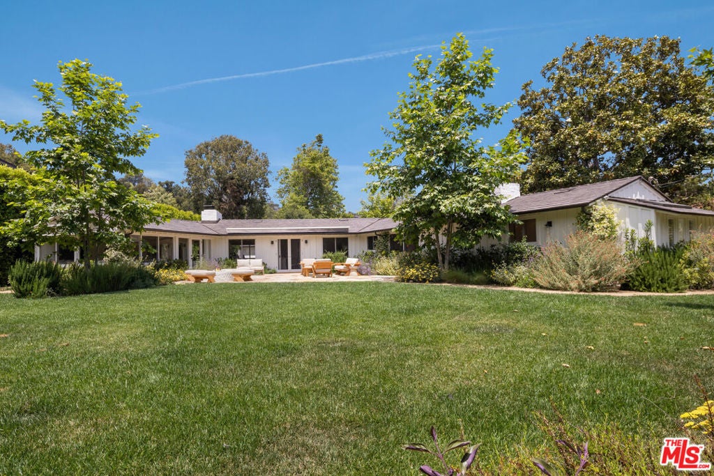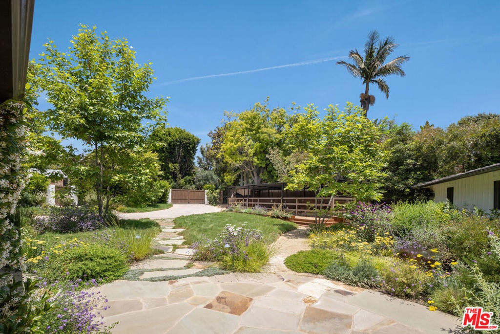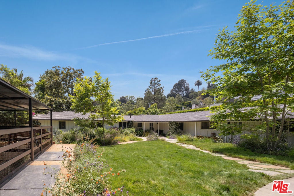 Very special, extensively restored and remodeled sprawling single-story California Ranch on an expansive, sunny 23,331 square foot flat lot on a quiet cul-de-sac in bucolic Sullivan Canyon. Gated and completely private, with huge front and rear yards, gorgeous gardens and tranquil canyon setting, this architectural gem has been redone with great taste, quality and sensitivity to the original Cliff May architecture, infusing the iconic Ranch aesthetic with a fresh, Contemporary feel. All the signature elements of pioneer builder and architect Cliff May's Ranch style can be found here: open floor plan for living and dining, floor to ceiling glass that brings light and nature in, three fireplaces and seamless integration of indoor and outdoor spaces with all rooms opening to patios and garden. Beautiful central living room with built-ins and fireplace, fabulous family room with open-beamed ceiling, wrap-around windows and large brick hearth, formal dining room, large, sunny cook's kitchen and cozy den/children's playroom. 4 bedrooms, 3 1/2 baths including spacious primary bedroom that opens to two separate gardens and has dual fitted closets and spa-like bath. Other features and amenities include all new state of the art kitchen, baths and laundry room, blonde wide-board oak plank floors, extensive built-ins, wet bar, wood-paneled walls, breathtaking grounds, firepit, motorized awning, three horse stables, chicken coop, and two car attached garage/gym. Most of the designer furnishings are also available separately. Situated in close proximity to the riding ring and Santa Monica Mountain trails, this warm, inviting, yet striking home represents a very rare offering in the best location within highly desirable Sullivan Canyon. A true country retreat in the city!
