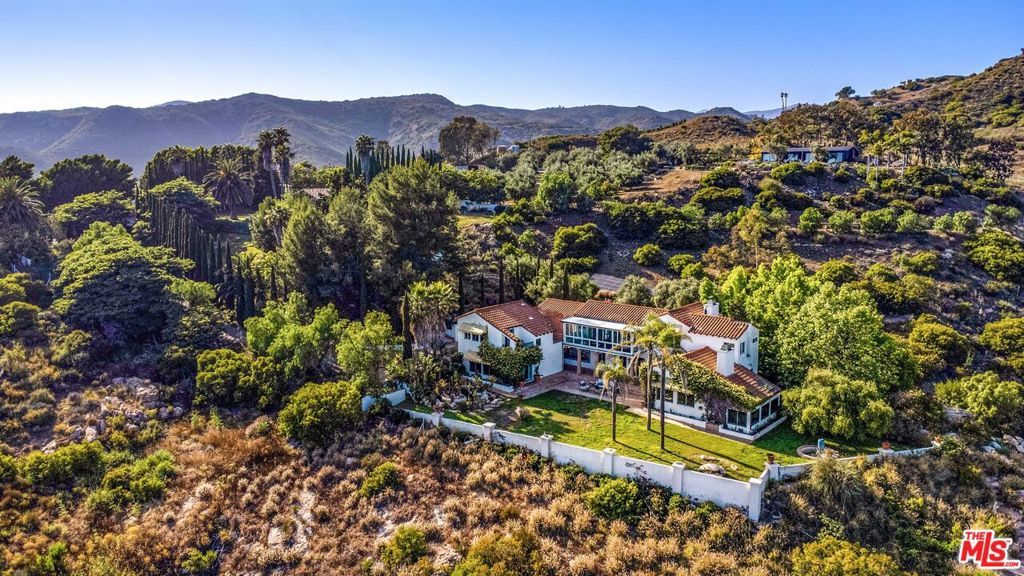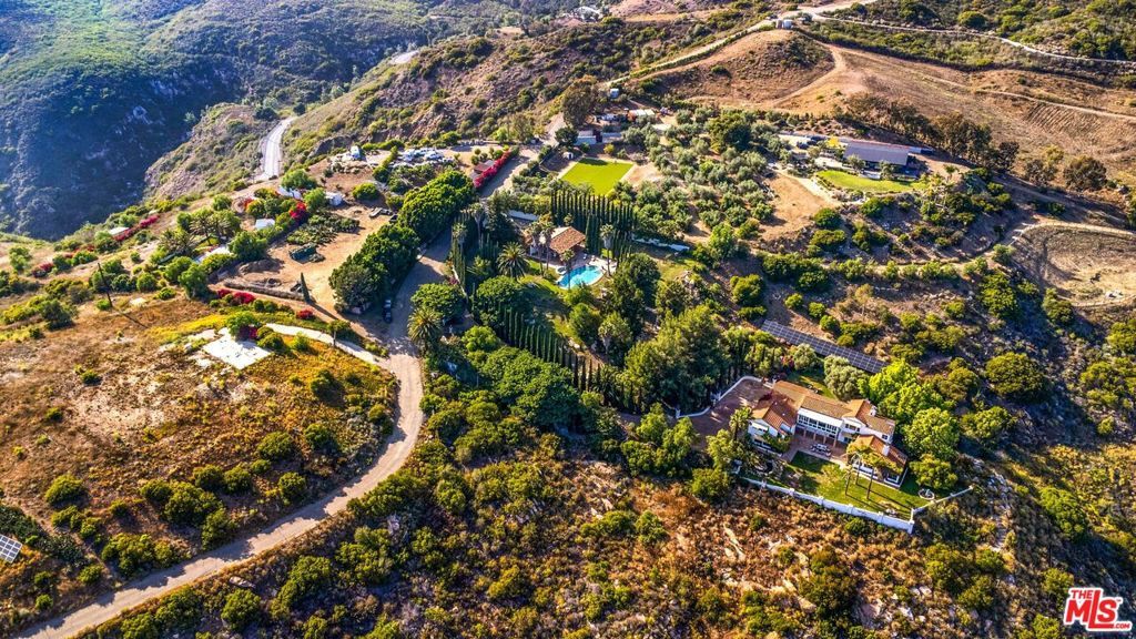Charming Malibu Hills Tuscany Estate with Unparalleled 360 Views! Welcome to a truly enchanting sanctuary nestled in the heart of the Malibu Hills. An extraordinary Tuscany-inspired Villa set on approximately 12 acres of pristine, privately gated land. This one-of-a-kind property offers unobstructed 360-degree panoramic views of the Pacific Ocean and majestic surrounding mountains, creating a breathtaking backdrop from every angle. As you pass through the grand iron gates and wind down a tree-lined driveway, you are immediately transported into a world of serenity and luxury. The estate unfolds like a private resort, with multiple structures thoughtfully placed across the expansive grounds to maximize privacy, comfort, and the natural beauty of the landscape. The main residence, a stately two-story home, exudes timeless elegance with its classic Mediterranean architecture, warm stucco walls, and red-tiled roof. You'll be surprised to see the sprawling spaces inside. Just few steps away, a detached two-story guest house offers three spacious bedrooms and three full bathrooms perfect for hosting guests or extended family in complete comfort and style. At the heart of the estate lies a massive sparkling pool and spa, surrounded by vast sun-drenched decks and lush landscaping. The pool cabana is a showstopper in itself, featuring soaring ceilings, a cozy fireplace, a full bath, and a tranquil massage room, ideal for relaxing after a swim or entertaining under the stars. Equestrian enthusiasts will be delighted by the giant, all-flat, fenced horse arena, which can also be repurposed for events, sports, or creative outdoor uses. The property also includes horse stables, a chicken coop, and a large storage building, offering both functionality and charm. The grounds are a masterpiece of thoughtful design and natural beauty. Manicured grassy lawns roll gently across the property, dotted with fruit trees, soothing fountains, and a koi pond complete with a picturesque round wooden bridge. A romantic gazebo invites quiet moments of reflection, while massive solar panels and a private well ensure sustainable, off-grid living. Additional features include a three-car garage, caretaker's quarters, and multiple outdoor lounging and dining areas that take full advantage of the estate's awe-inspiring views. Whether you're watching the sun rise over the mountains or set into the ocean, every moment here feels magical. This Malibu Hills estate is more than just a home, it's a lifestyle. A rare blend of luxury, privacy, and natural splendor, it offers a once-in-a-lifetime opportunity to own a piece of paradise. Whether you're seeking a peaceful retreat, a family compound, or a venue for unforgettable gatherings, this property delivers it all with grace and grandeur.