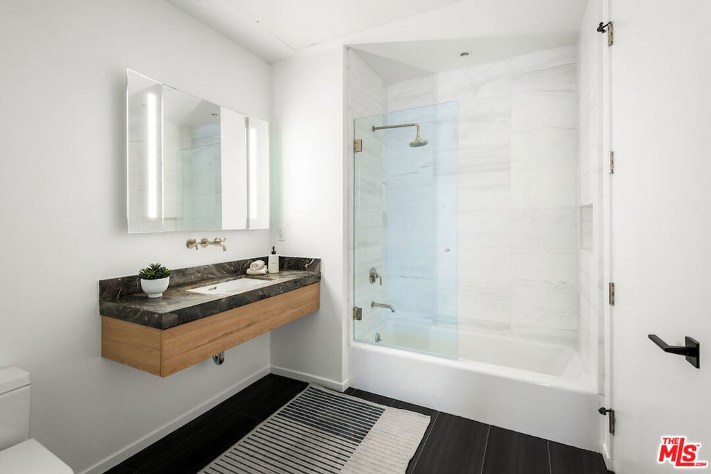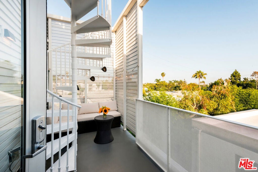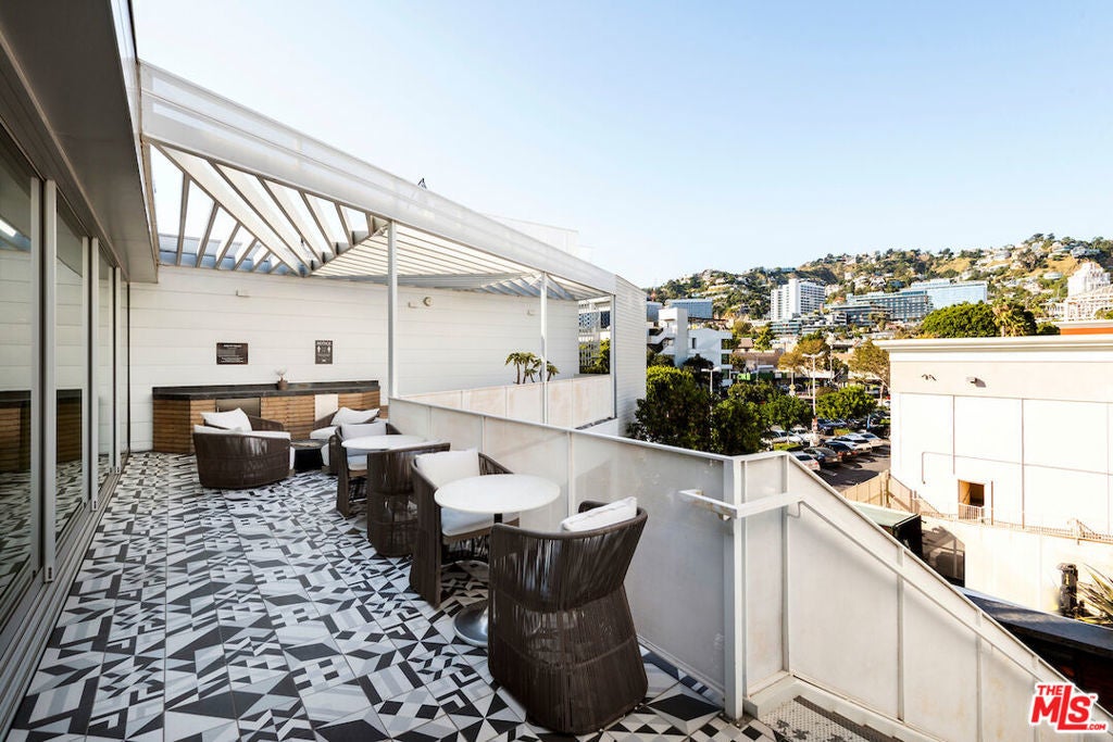 Welcome to 1030 Kings, a refined collection of 25 contemporary condominiums on historic Kings Road. Penthouse Residence 407 is a standout two-bedroom, two-bath home that reflects the building's thoughtful design and elevated finishes. This light-filled residence features ten-foot ceilings, expansive window walls, and an airy open-plan layout that flows effortlessly onto a private terracean ideal setting for morning coffee or evening gatherings. A spiral staircase leads to an expansive private rooftop deck with panoramic views of the Hollywood Hills, perfect for entertaining under the stars. The Bauformat kitchen is designed for both beauty and function, with a mobile waterfall island, raw wood cabinetry, and top-of-the-line Miele appliances. The serene primary suite includes a custom Closet Factory walk-in wardrobe and a spa-inspired bath clad in floor-to-ceiling marble, complemented by a Bauformat oak vanity and TOTO porcelain sink. Smart home features, in-unit laundry, and extra garage storage add convenience, while the building offers controlled access, gated tandem parking, a fully equipped fitness center, and two beautifully designed outdoor lounge areas with sweeping views. Designed by award-winning architect LOHA with interiors by MLH Design Group, Residence 407 blends luxury, style, and modern ease in one of West Hollywood's most desirable neighborhoods.