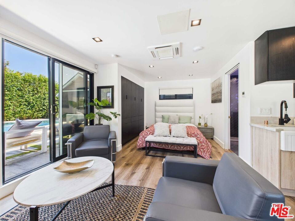 Located in the heart of Hidden Woods, one of Sherman Oaks' most desirable neighborhoods, this four-bedroom residence blends a sophisticated modern aesthetic with warm, everyday livability. Bright and airy, the open floor plan showcases high ceilings, recessed lighting, and a designer kitchen with quartz countertops, premium appliances, and seamless indoor-outdoor flow to the lush backyard. The private, fenced yard creates a resort-style atmosphere with an in-ground pool, spa, and beautifully landscaped grounds.In addition to the main home, the property includes two stylish ADU guest houses, each with its own kitchen, bathroom, and in-unit laundryideal for guests, extended family, or rental income. The pool is heated and replastered, and the house features new plumbing, copper wiring, and a roof that's about a year and a half old. Additional highlights include a luxurious primary suite, spa-like bathrooms, and convenient access to top-rated schools and the 101 freeway, offering space, flexibility, and tranquility in the heart of Los Angeles.