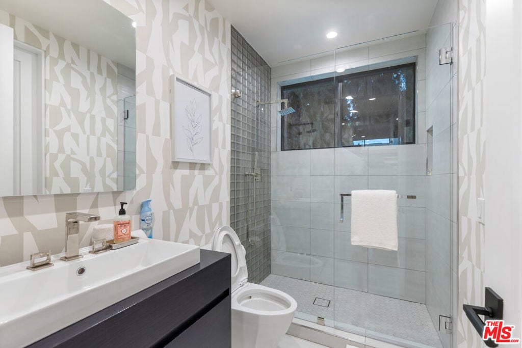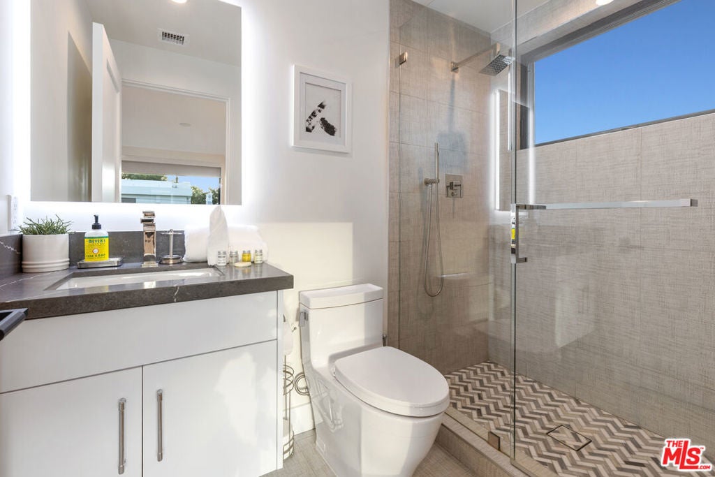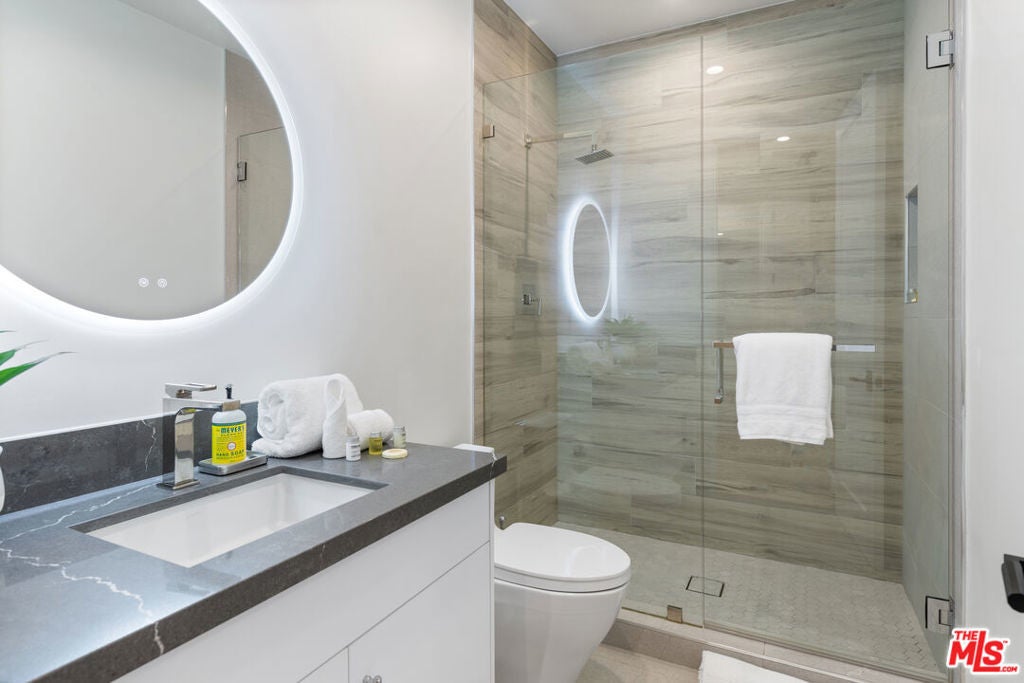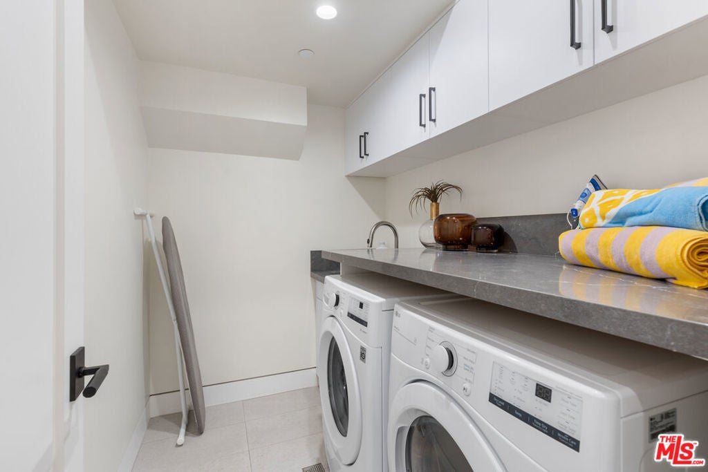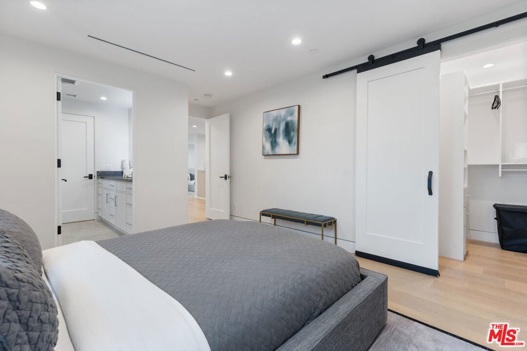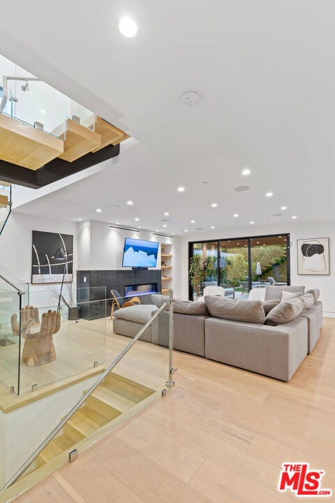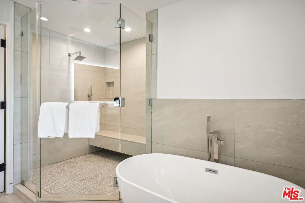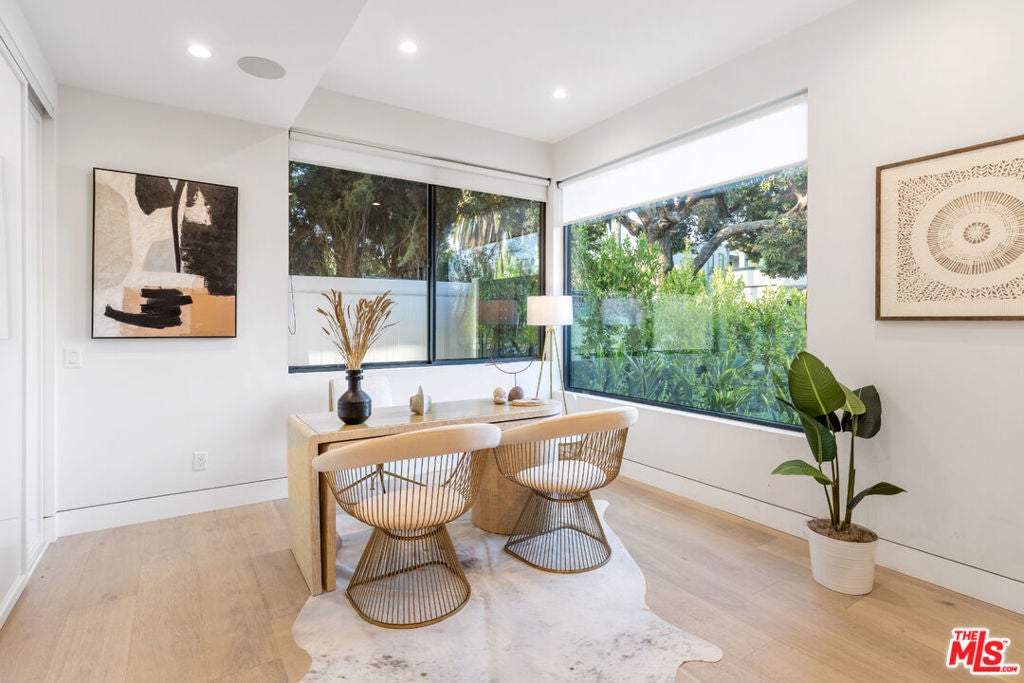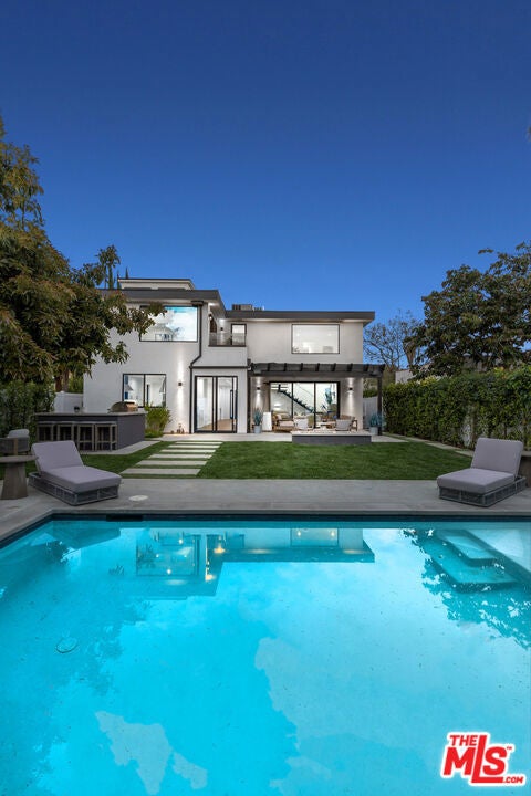 This property comes fully furnished and is all set for you to move in right away. Immerse yourself in the epitome of luxury and tranquility with this stunning, newly constructed home in Beverly Grove. This architectural masterpiece welcomes you with a sweeping open floor plan and elegant oak wood floors. The main level features an executive office, a cozy fireplace-accented living room, and a chef's kitchen equipped with Thermador appliances, a stone-topped center island, and expansive sliding glass doors leading to the meticulously manicured backyard. Step outside to discover an outdoor oasis boasting a fully equipped kitchen, a comfortable lounge area, and a magnificent pool and spa surrounded by lush Ficus plants for ultimate privacy and serenity. Ascend the floating stairs to the opulent master bedroom with a deluxe en-suite bathroom, his-and-hers closets, and a terrace overlooking the peaceful backyard. Three spacious bedrooms, one with a terrace offering street views, complete this level. The lower level is an entertainer's dream with a generous great room, state-of-the-art theater, two additional en-suite bedrooms, a storage room, a laundry room, and a captivating glass wine cellar. This privately gated home is just steps away from Los Angeles' finest dining and shopping, making it the perfect residence for those seeking elegance and convenience.