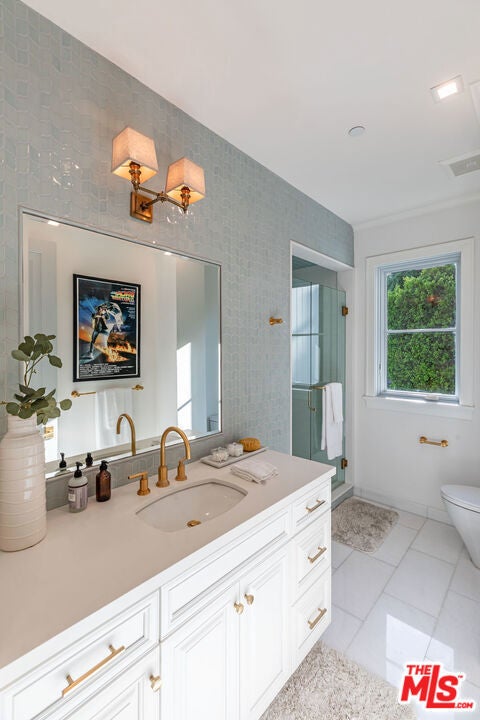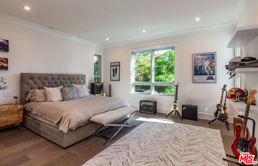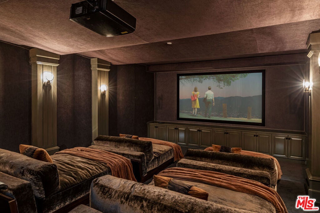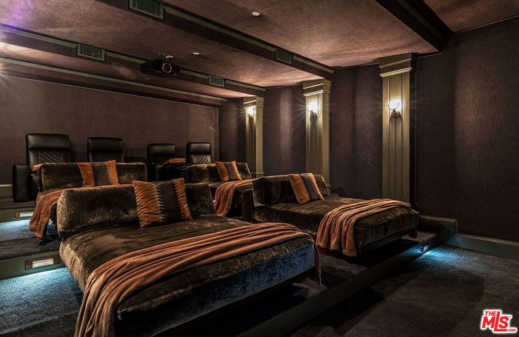This is an incredible opportunity to own a private and secure Brentwood estate tucked within the prestigious Grove Estates enclave. This expansive 14,000-square-foot residence sits behind gates and offers sweeping canyon vistas and striking views of the Getty Center. A dramatic entrance welcomes you with soaring ceilings, a statement skylight, and a dazzling chandelier centerpiece. The kitchen is a truly exceptional space for hosting and gathering, featuring a distinctive U-shaped island and double sets of top-tier Viking and Sub-Zero appliancesdesigned with the entertainer in mind. Set on a just-over-half-acre lot, the outdoor space is a private retreat complete with resort-style pool and spa, built-in BBQ, open-air kitchen, outdoor media lounge, and a grassy yard framed by majestic mature Oak trees. The main floor includes an elegant formal dining room, a family lounge featuring handmade artful wall coverings by de Gournay, kitchen, and mini-suite guest accommodations all thoughtfully laid out to enhance everyday living and entertaining. The lower level is an entertainer's dream. It currently features a well-sized indoor basketball courtoriginally built as a lap pool and easily converted back at the new owner's discretion. This level also includes a spacious gym, dry sauna, fully equipped bar, 500-bottle wine cellar, private movie theater, putting green for golf enthusiasts, and collector's garage with capacity for 10 vehicles. Upstairs, the primary suite is a luxurious escape featuring a double-sided fireplace, spa-like bath with soaking tub, large dual closets, a large walk-in shower with steam, and a private oversized balcony with backyard views. Four additional generously sized en-suite bedrooms with high ceilings and a versatile playroom or office with a private balcony center around the upper landing. A separate mid-level suite is ideal for staff, guests. Experience the height of refined Los Angeles living in this one-of-a-kind estate.