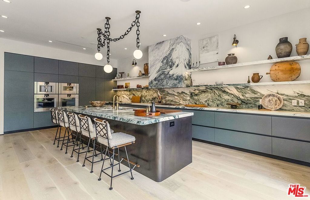 After purchasing this newly constructed home in 2021, the owners engaged renowned designer Jeremiah Brent to transform and re-imagine property. The result of their multi-million-dollar, year-long collaboration is an extraordinary marriage of exceptional craftsmanship and distinctive finishes and was recently featured in Architectural Digest. Every element of this property is a work of art, yet the home's overall ambiance is warm, livable, and inviting. Stunning light fixtures from Apparatus and Trueing grace the entry, dining room and kitchen. Gorgeous stonework can be found throughout the house, including a show-stopping Macchia Vechia marble bar, hand-carved Bardiglio Nuvolato fireplace, and Calacatta marble counters and backsplash in the kitchen. The redesign of the backyard was done with as much care as the home's interiors, including the addition of limestone paths and patios, gorgeous outdoor kitchen with hardwood trellis cover, charming outdoor fireplace with antique plinth, and lounging areas around the pool and spa. All systems have been upgraded to the absolute top-of-the-line, from a state-of-the-art security system to the home theatre and audio systems (indoor and out). With five ensuite bedrooms, gourmet chef's kitchen, theatre, private resort-style backyard, and detached pool house/home gym, this property has something for everyone. Jeremiah Brent's furnishings and decor (including many curated vintage and antique pieces) are available for purchase for an additional price, making this a truly one-of-a-kind offering for the most discerning buyer.