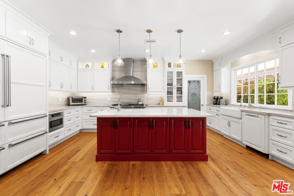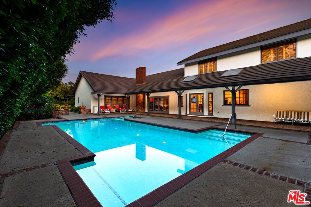 Welcome to this beautiful home, located on a quaint cul-de-sac in the coveted Amestoy Estates neighborhood of Encino. This residence sits on a massive 17,500+ square feet lot that features 6 bedrooms, 5.5 bathrooms, and an expansive floor plan of over 5,500 square feet, blending traditional charm with modern functionality. As you enter, you will be welcomed by stunning wood floors that extend throughout most of the first level. The large family room is adorned with exposed beams and soaring vaulted ceilings, making it the perfect centerpiece for hosting gatherings or enjoying a relaxing evening. The kitchen is ideally situated and showcases beautiful French doors, high-end appliances, a spacious island, and a sizable walk-in pantry. Also found on the first level is a the massive primary suite, which boasts vaulted ceilings, an elegant primary bathroom, and two walk-in closets. Three additional bedrooms, including a custom-built home office/library, complete the first level. The second level features a massive bonus room and houses two additional bedrooms. The backyard is an ideal space for entertaining or rejuvenating, entirely surrounded by mature hedges that provide privacy and ample shade around the sparkling pool and spa. A spacious grassy area can also found in the backyard, perfect a myriad of outdoor activities.
