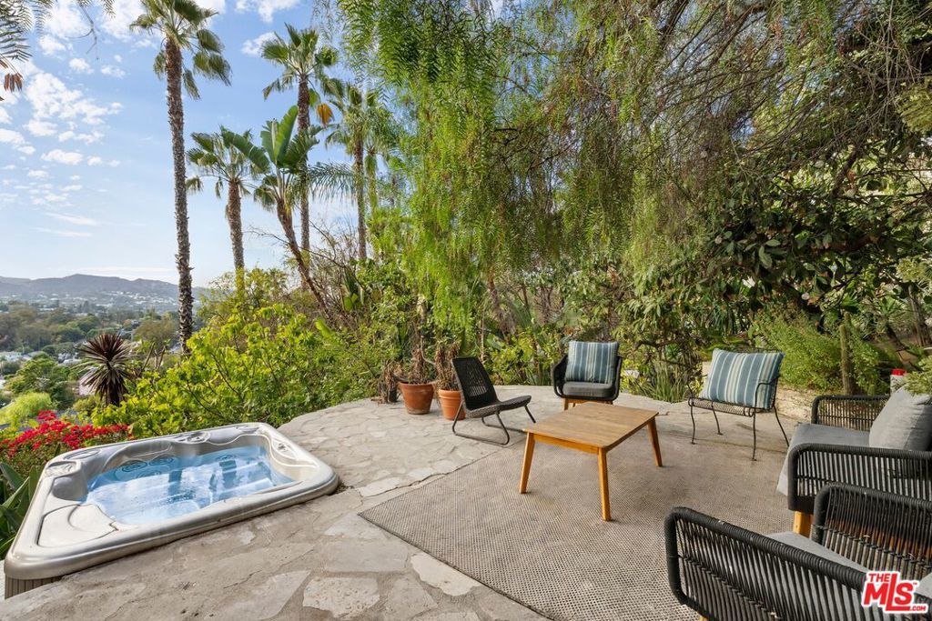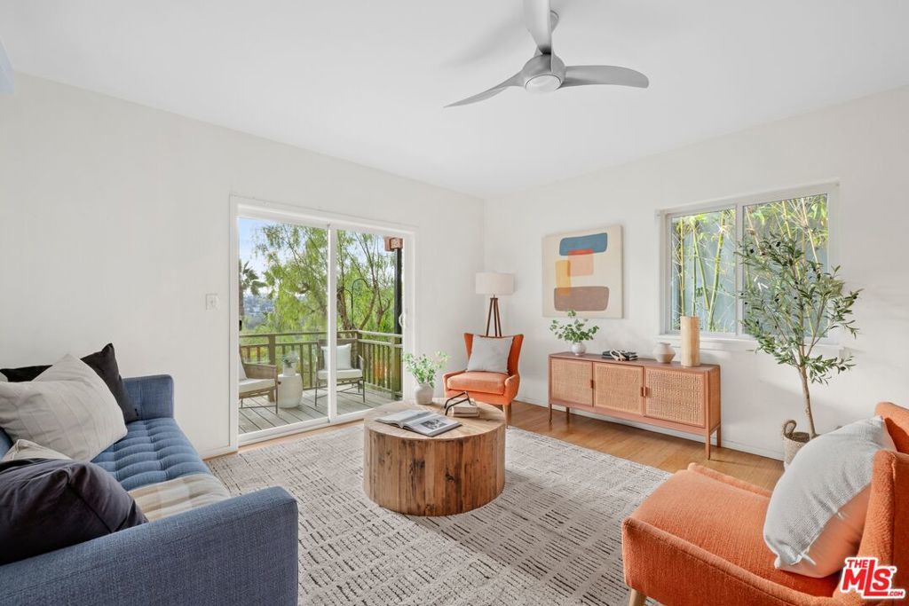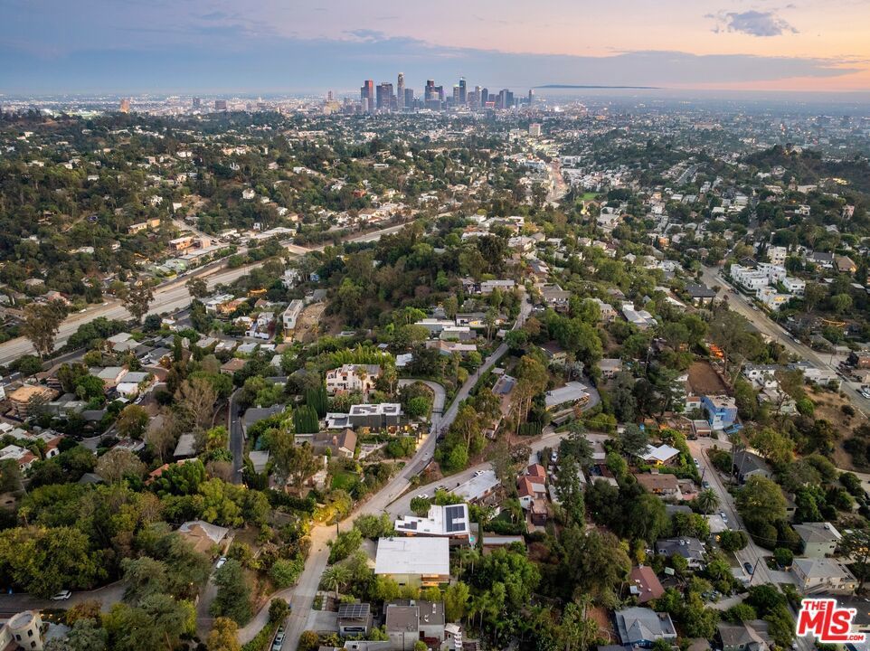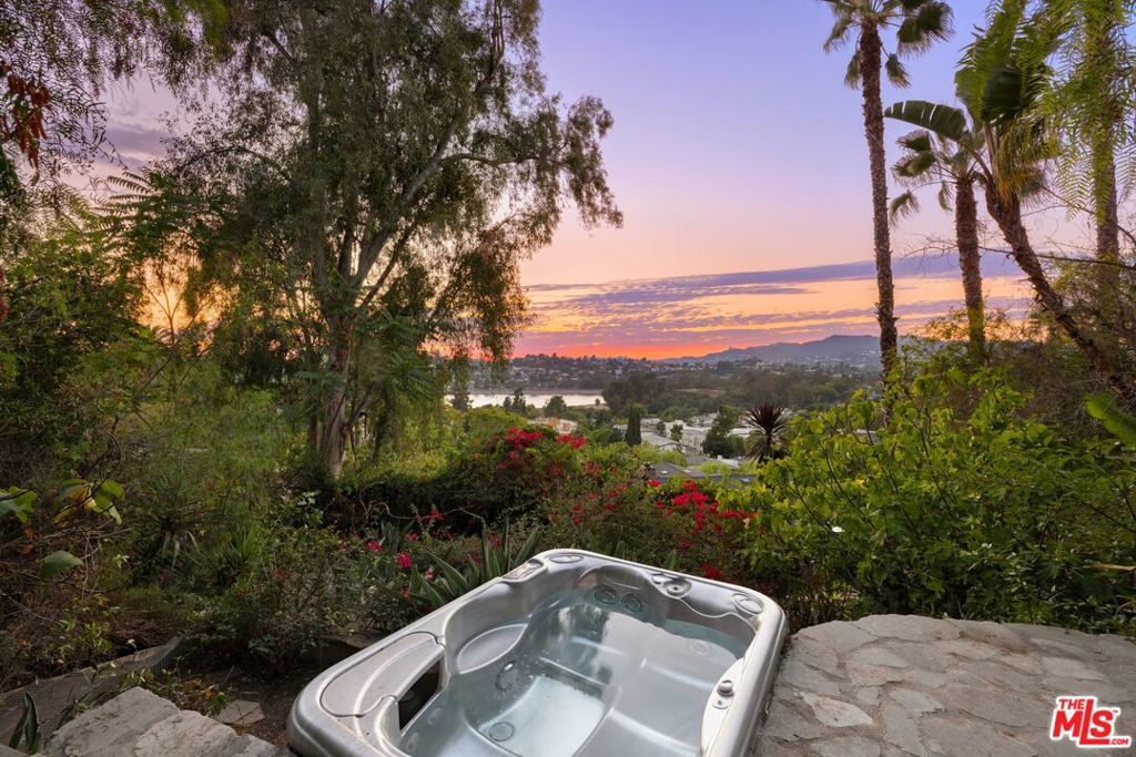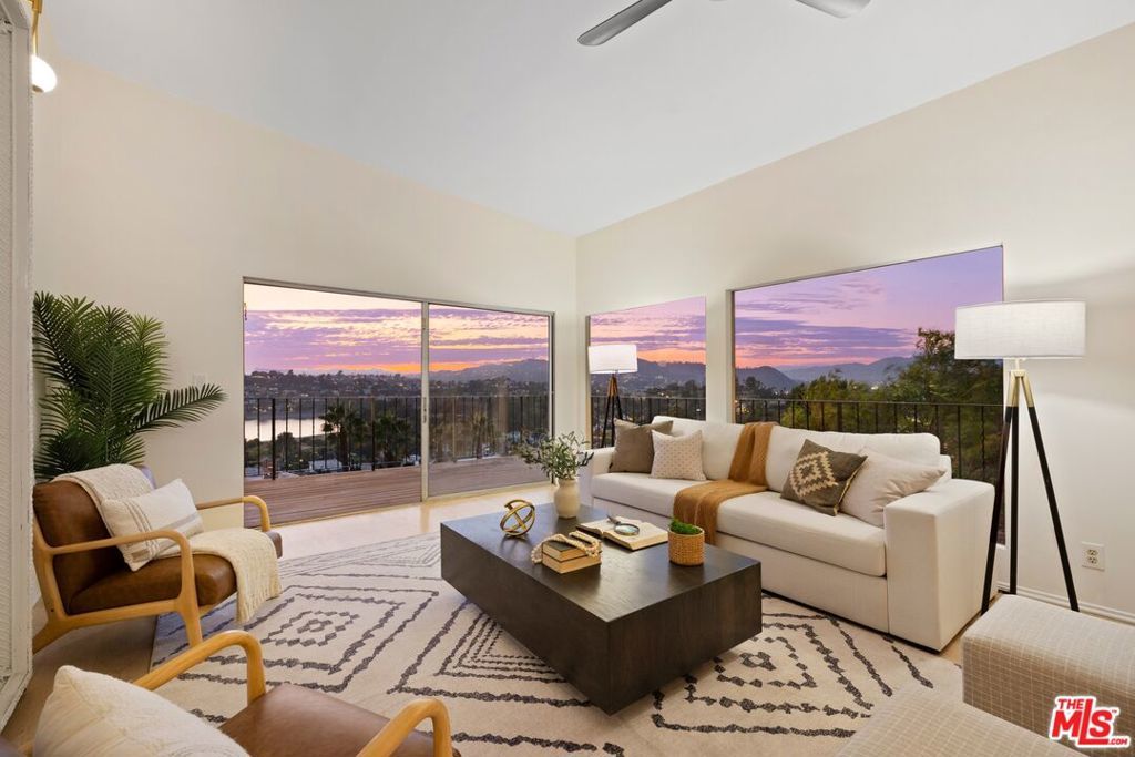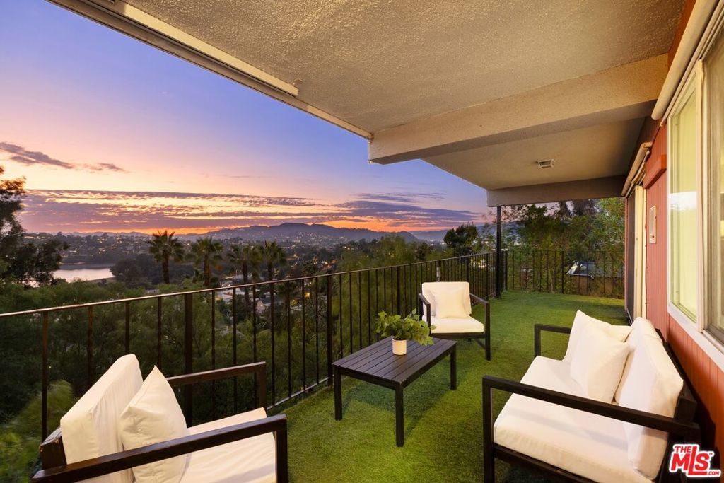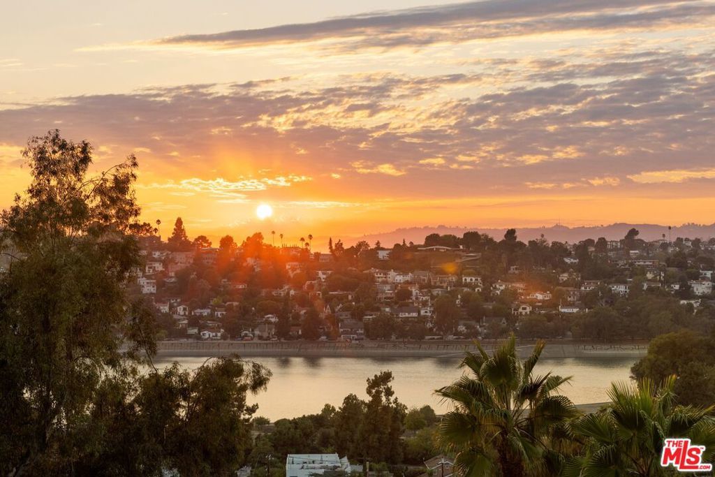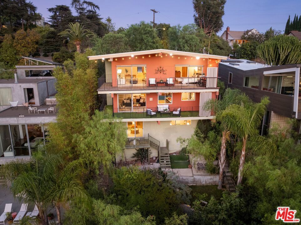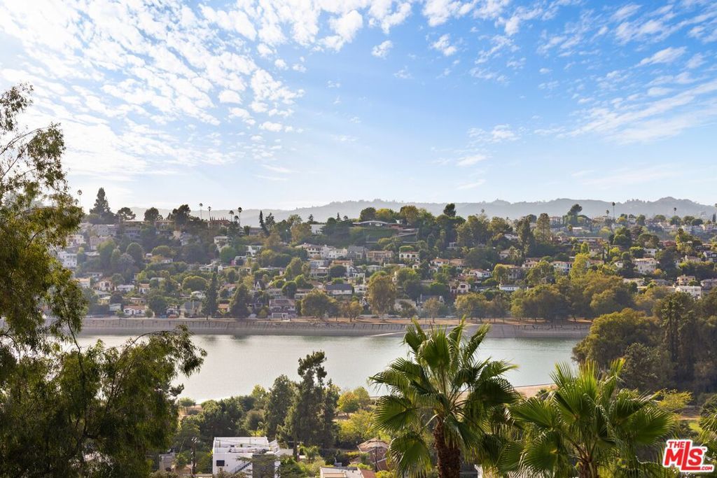 Resting on top of one of the highest points of Silver Lake with sweeping views of the reservoir, this classic midcentury retreat offers sweeping panoramas of the Hollywood Hills, the shimmering Silver Lake Reservoir below, and iconic LA landmarks including the Griffith Observatory and the Hollywood Sign. With such close proximity to downtown, cultural attractions like the Los Angeles Music Center and city hall are just ten minutes by car or twenty minutes by public transit, making this the perfect location for commuting professionals and lovers of the arts. The main level comprises a formal living room and primary suite, each accessing a large wraparound deck for quiet relaxation amidst striking vistas of lush treetops and rich architectural fabric. The main bath is dressed in smart designer tiling and fitted with a floating dual-sink vanity, rainwater shower, and soaking tub. Downstairs, the sleek kitchen features glossy cabinetry, stainless-steel appliances, and large peninsula with breakfast bar ledge and cooktop with hood. Wide-plank floors flow into the adjacent open-concept formal dining area and family room which opens via sliding glass to a second viewing balcony, perfect for al-fresco bites and drinks. Nearby, a media or gaming lounge has picture windows inviting natural light within. Secondary bedrooms and bathrooms are well appointed and maximize use of space. On the lower level, discover a guest apartment equipped with its own kitchen area with full-size refrigerator, washer, farm sink, and island. There is also a living room which opens to the outside as well as a spacious bedroom and delightful en-suite bath, allowing the option for additional passive income. Enjoy a slice of paradise enveloped by mature trees and verdant plantings from the patio, hot tub, and terraced gardens with vivid sunsets as an ideal backdrop. For modern convenience, there is also an EV charger. Celebrated for its creative vibe and diverse culture, Silver Lake draws artists, musicians, writers, and celebrities alike. Experience the beauty of Los Angeles at nearby Elysian Park Trail and Angels Point, known for scenic cycling and hiking paths plus fantastic views of the DTLA skyline. A variety of trendy boutiques, shops, cafes, and buzzing nightlife are also just moments away. Welcome!