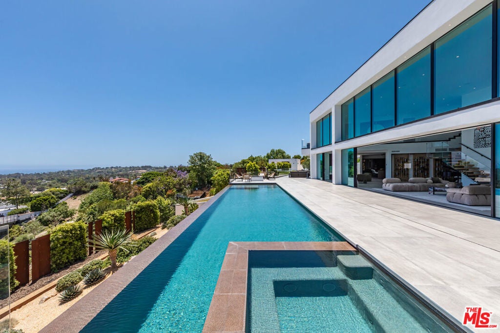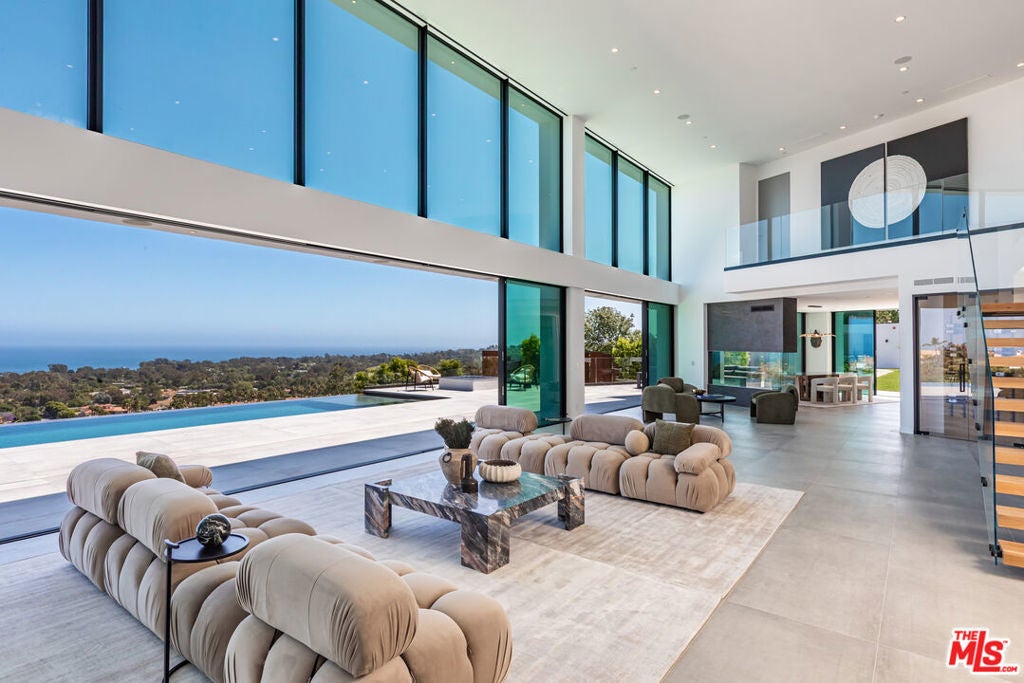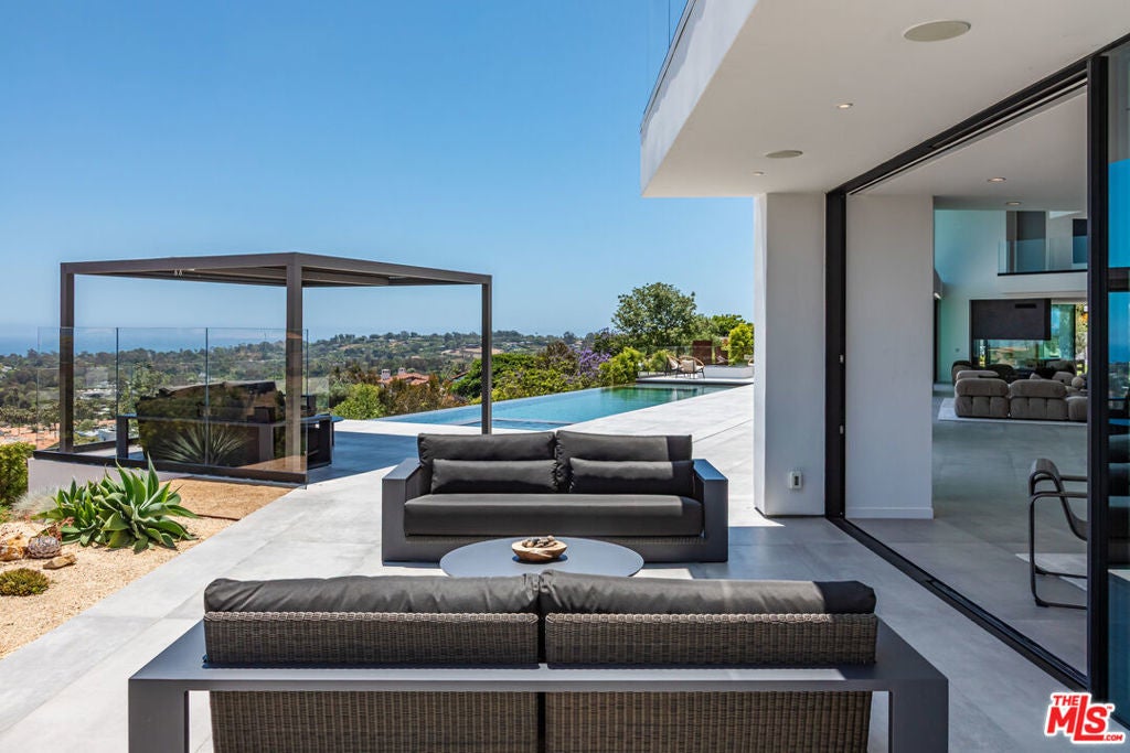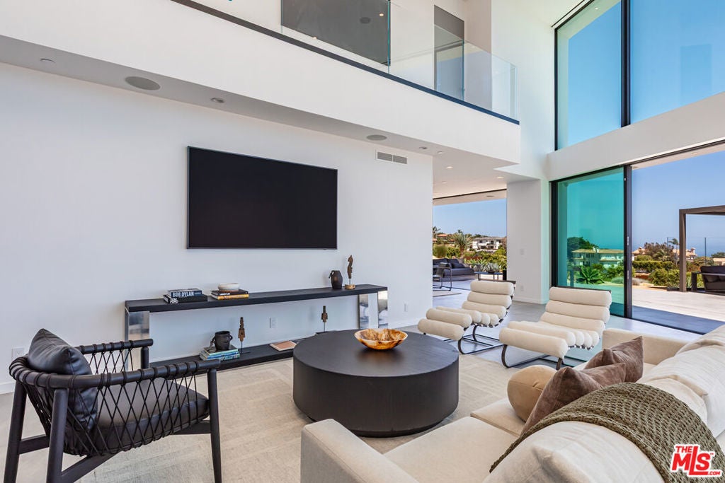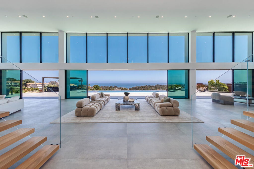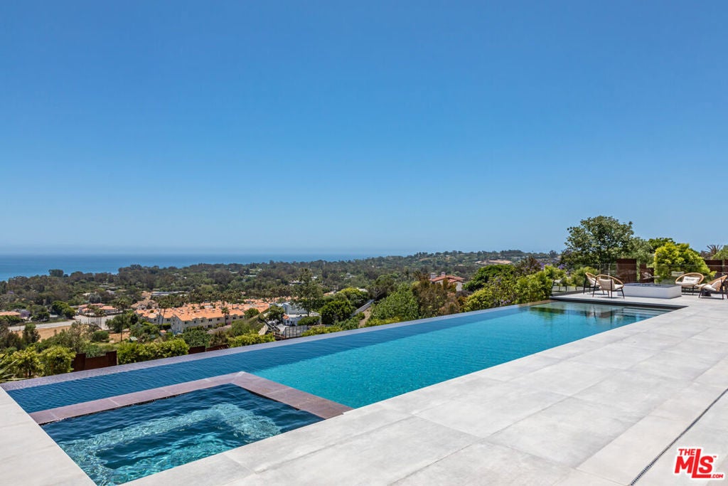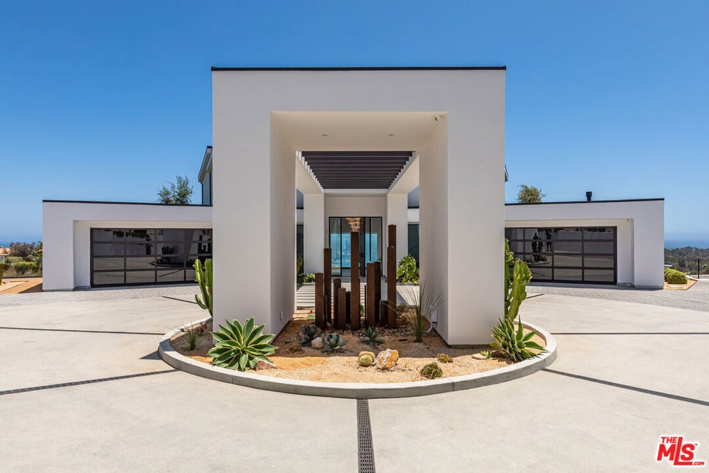 Perched on two pristine acres in Malibu, this brand-new, gated contemporary estate, spans 7,200 square feet and showcases dramatic ocean views through floor-to-ceiling glass walls. The main house features airy living spaces, including a great room with 21' ceilings that opens to a 54' long infinity pool blending into the Pacific Ocean, a seamless flow into a Leicht European kitchen and dining area, a wine cellar, study, and state-of-the-art theater. The entire top-floor primary suite offers a wraparound deck, luxurious bathroom with freestanding tub, and expansive walk-in closet, complemented by four additional ensuite ocean-view bedrooms. Manicured grounds with fire pits, fountains, and a grassy lawn lead to a BBQ pavilion with a full outdoor kitchen, fireplace, and TV, while a detached 815-square-foot guest house mirrors the estate's stunning views. Complete with an elevator, Control4 automation, camera security, a 4-car garage, and a gated motor court, this architectural masterpiece redefines coastal luxury.
