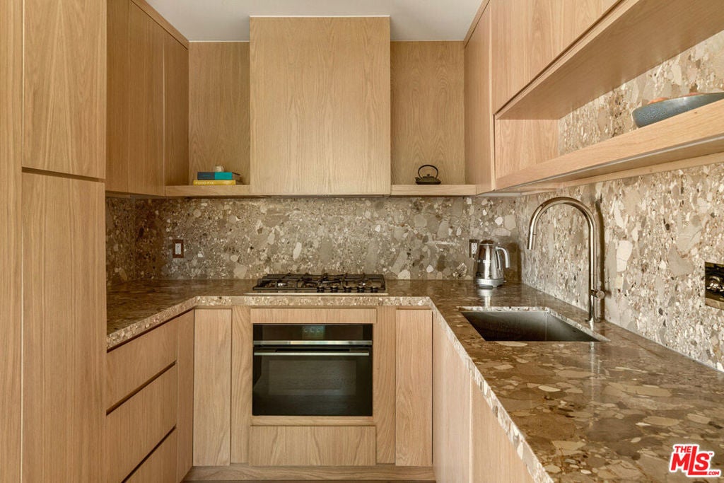 In West Hollywood's coveted Norma Triangle, this top-floor corner residence is a luxurious urban retreat, a sanctuary you've been seeking, with exquisite finishes and verdant views. Set within a gated courtyard building, the light-filled home presents a spacious great room with seamless indoor-outdoor flow; a folding glass wall expands the living space to a wraparound balcony overlooking treetop vistas and city lights. Italian white oak flooring and cabinetry, Italian marble countertops, and Forbes & Lomax switchware are just some of the refined details. The kitchen is outfitted with Fisher & Paykel appliances and a Bosch dishwasher, plus a built-in desk with matching oak surface. The bedroom enjoys balcony access and a custom white oak walk-in closet; the spa-like bath is finished in marble with double sinks, oak cabinetry, and a soft-lit mirror framing your best looks. With no shared walls,updated windows, and discreet mini-splits, this sophisticated haven puts you just moments from Melrose boutiques, Soho House, the Troubadour, and all the energy of Sunset Boulevard. Convenient parking options include a dedicated garage space plus street parking permits for your guests.