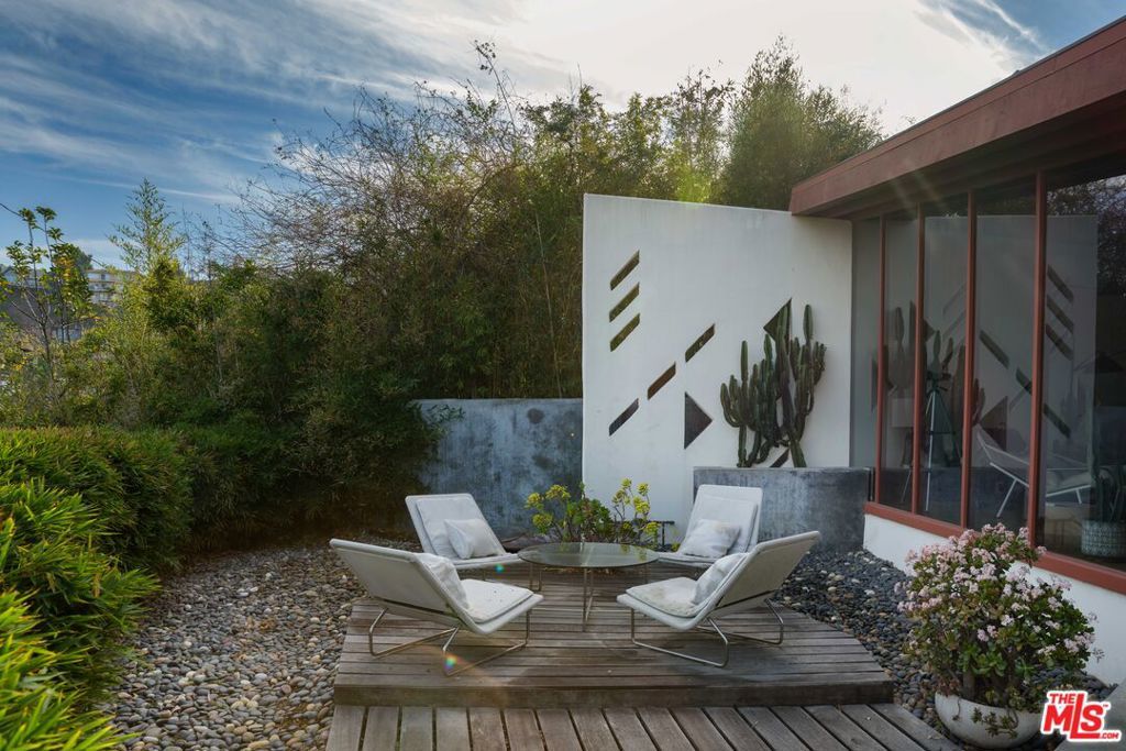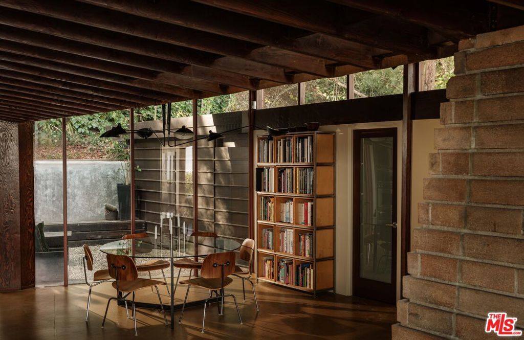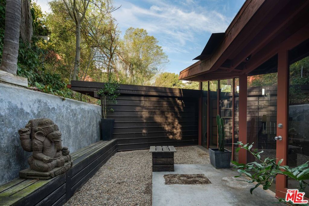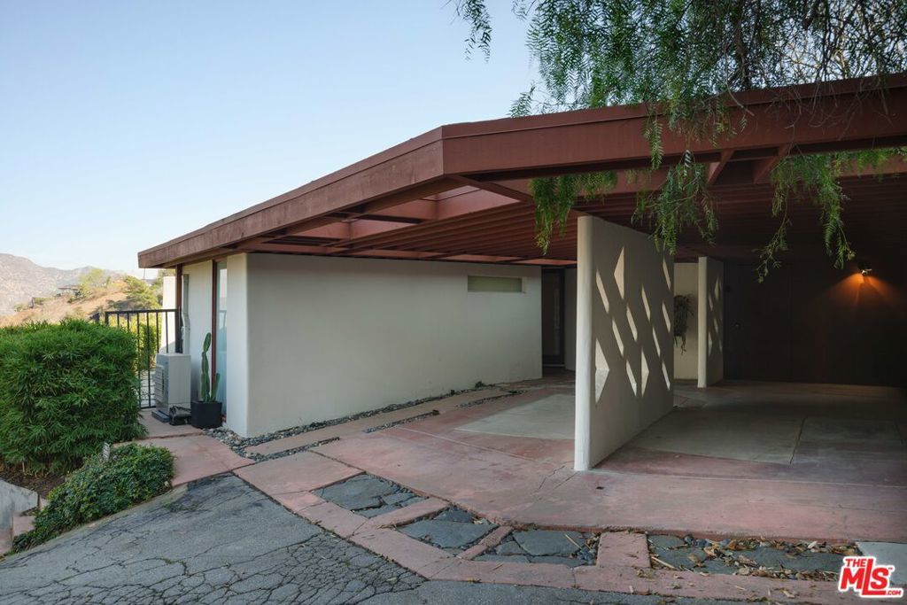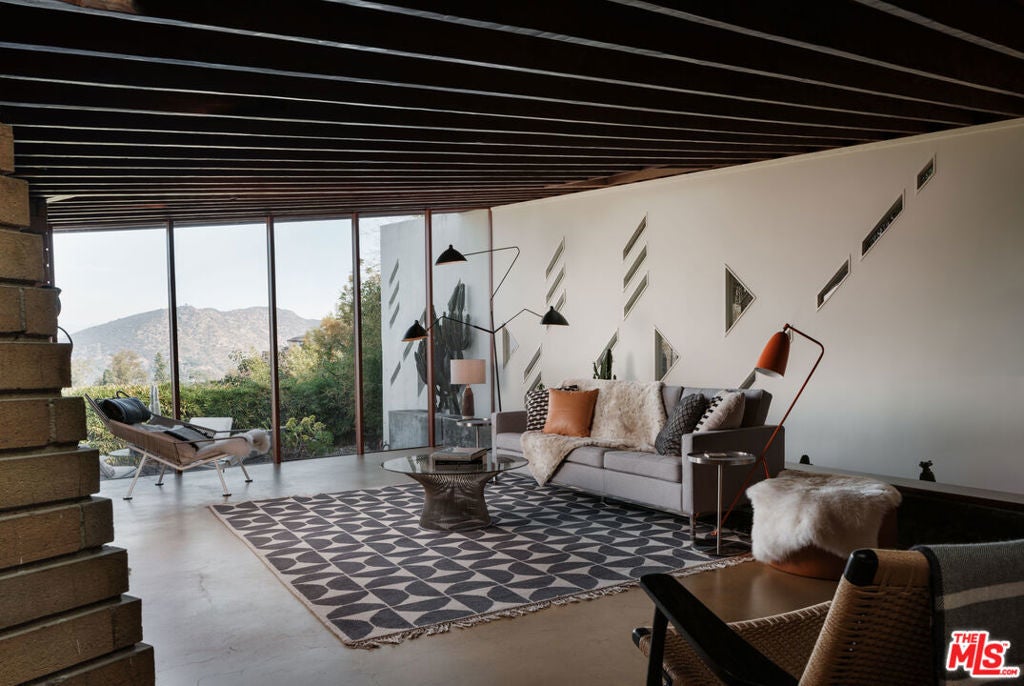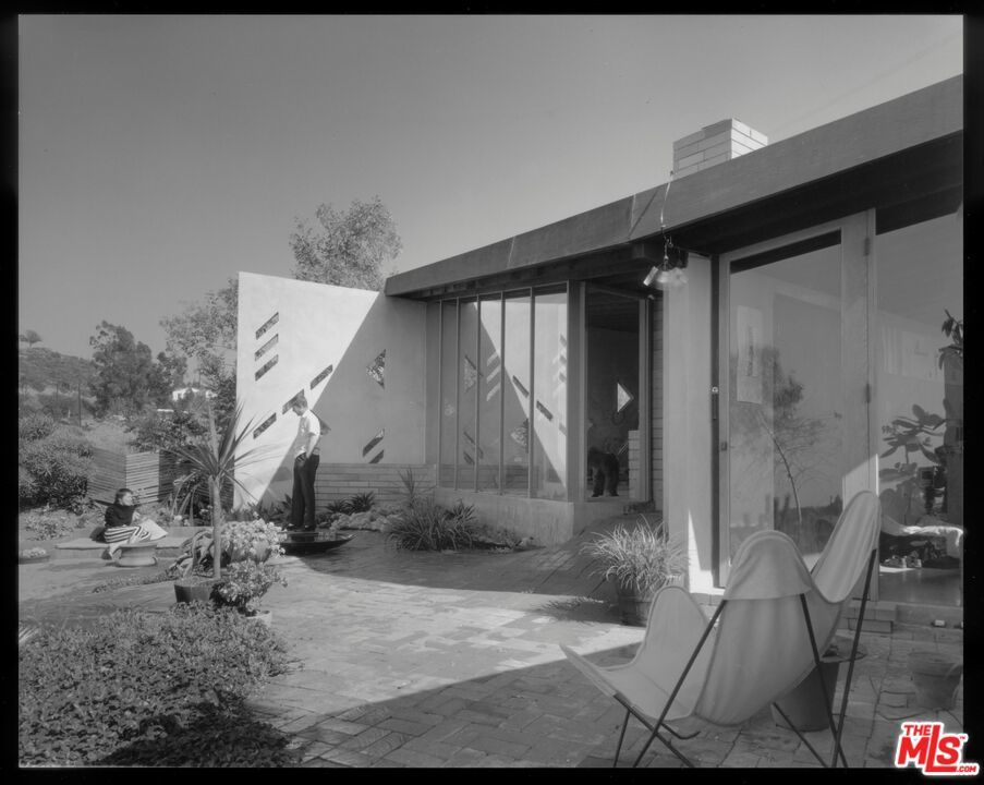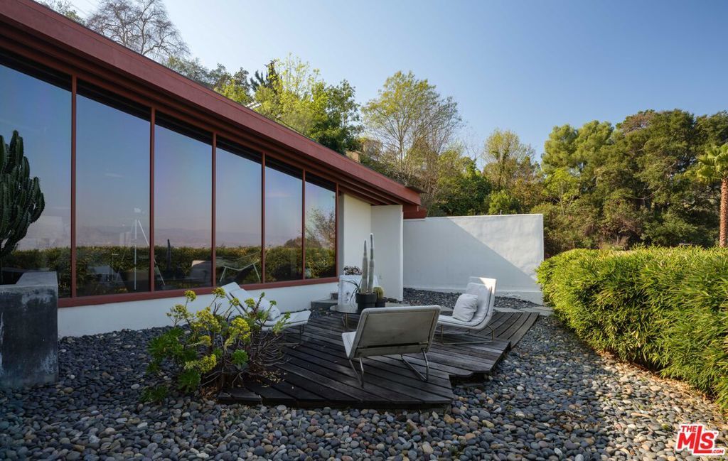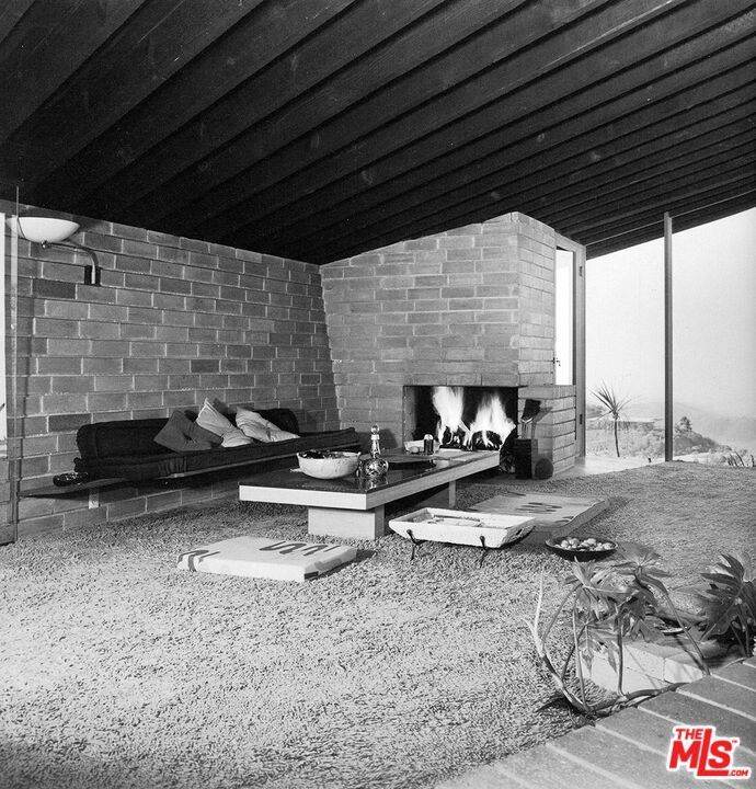 The Bergren Residence, 1953. John Lautner, Architect. Nestled in the Hollywood Hills, the residence underwent a meticulous restoration under the guidance of Escher GuneWardena and stands as a dreamy testament to Los Angeles's age of modernism. Step into an open space defined by redwood, concrete, glass, and a sculptural butterfly roof, framing sweeping mountain views. A brick fireplace acts as the focal point in the living, while a minimalist Poliform kitchen furnished with Gaggenau appliances and updated details throughout further enhances the experience. The original bedroom shares an expansive wall with the living room, maintaining an effortless flow. While Lautner's later addition, a secluded and generously scaled primary, enjoys complete privacy, enveloped by lush landscaping. This is a rare opportunity to acquire a significant piece of architecture by one of the most influential architects of the 20th century.