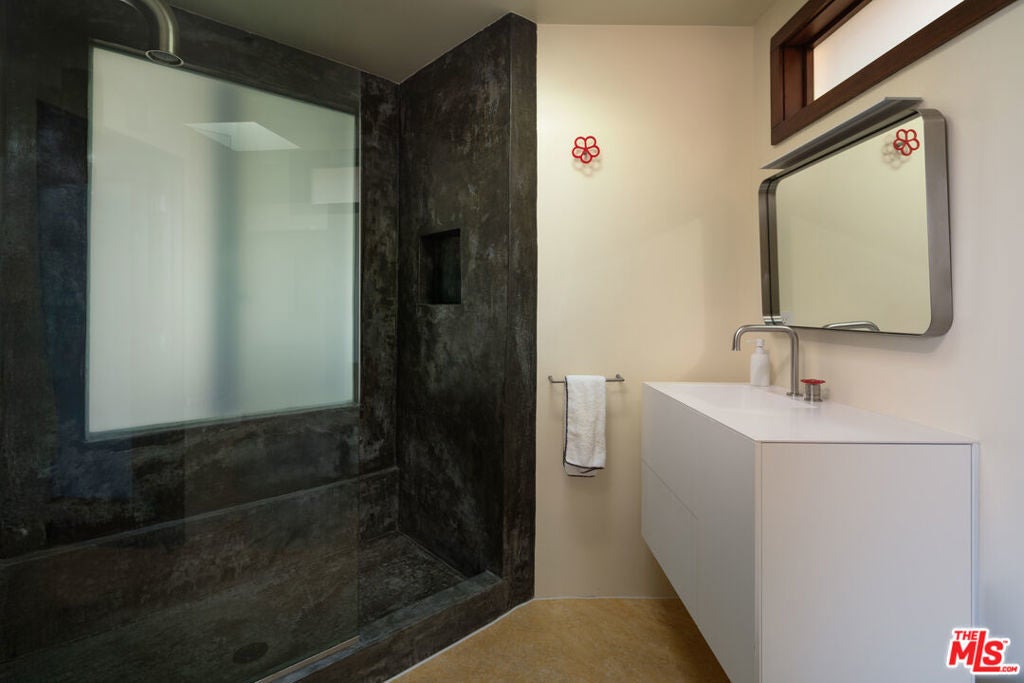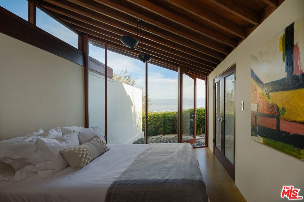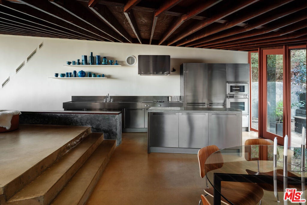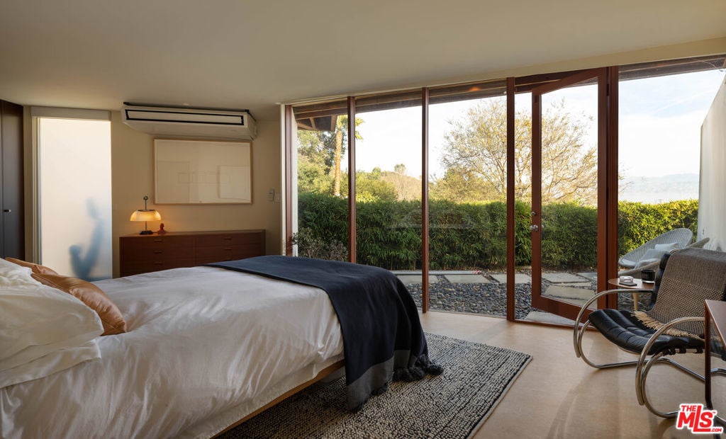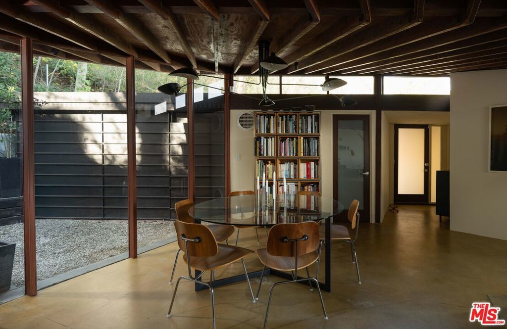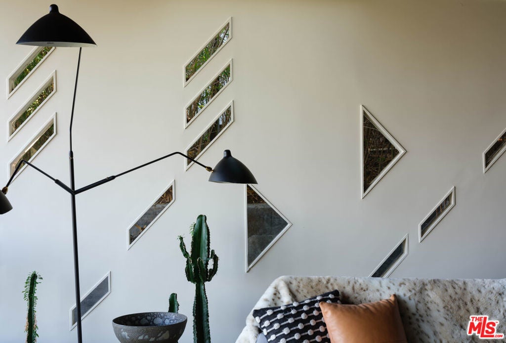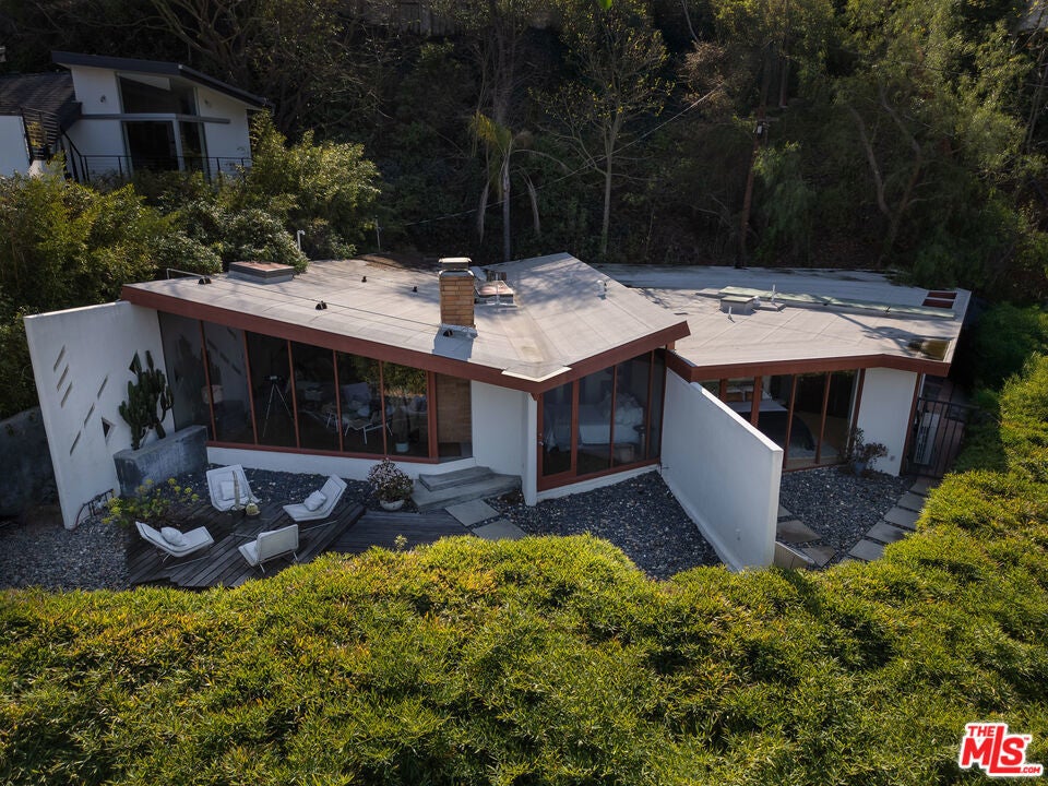 The Bergren Residence, 1953. John Lautner, Architect. Nestled in the Hollywood Hills, the residence underwent a meticulous restoration under the guidance of Escher GuneWardena and stands as a dreamy testament to Los Angeles's age of modernism. Step into an open space defined by redwood, concrete, glass, and a sculptural butterfly roof, framing sweeping mountain views. A brick fireplace acts as the focal point in the living, while a minimalist Poliform kitchen furnished with Gaggenau appliances and updated details throughout further enhances the experience. The original bedroom shares an expansive wall with the living room, maintaining an effortless flow. While Lautner's later addition, a secluded and generously scaled primary, enjoys complete privacy, enveloped by lush landscaping. This is a rare opportunity to acquire a significant piece of architecture by one of the most influential architects of the 20th century.