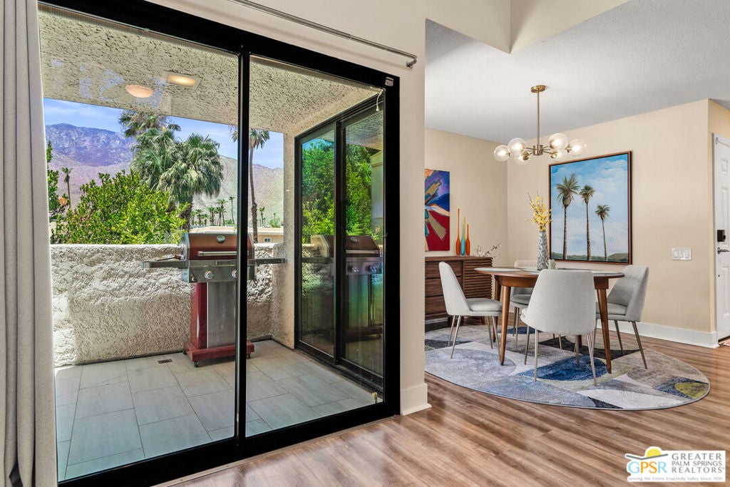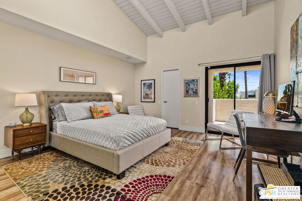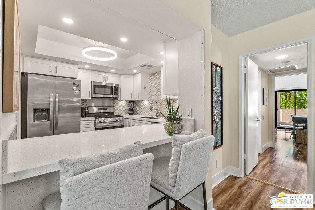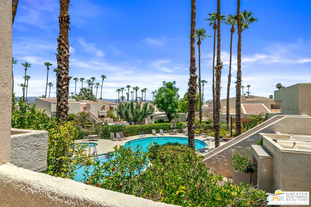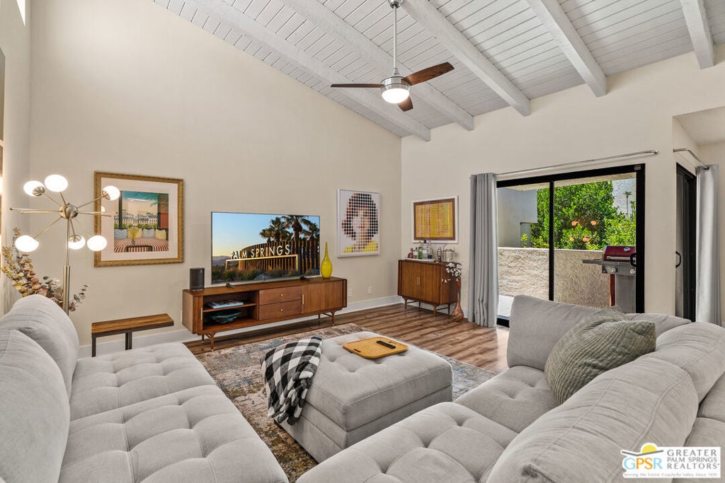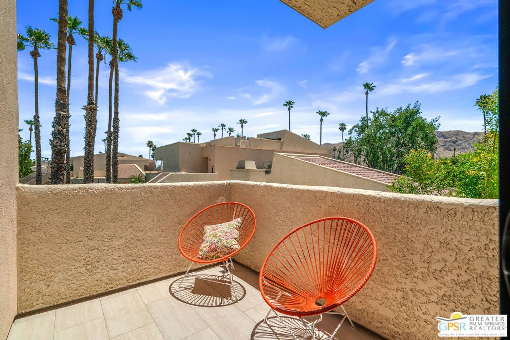 Another $20K price reduction - now priced well below the comps - the best deal in the area for a highly upgraded condo! Top floor 2BR/2BA condo at the sought after Versailles complex * On Fee Land * Extensively renovated in 2021 and further updated in 2025 * Open living/dining/kitchen * Dramatic living area with vaulted ceiling, clerestory windows and direct access to a private deck with western mountain views, perfect for indoor/outdoor entertaining * Dining area easily fits a table for 6 * Remodeled kitchen with quartz countertops, beautiful backsplash and stainless steel appliances including a 5-burner gas range * Primary bedroom with double closets and brand new closet system; remodeled en-suite bath with walk in shower and beautiful vanity; private deck with pool views * Remodeled guest bathroom with shower over tub * Guest bedroom with vaulted ceiling, walk in closet and private deck * In-unit laundry Newer laminate wood floors and Milgard sliders throughout * Newer American Heating and Air system * Brand new tile on all 3 decks * 1 car assigned parking with additional parking available * HOA Dues: $592/mo (includes garbage, water, insurance/EQ Insurance, professional management) * Central Palm Springs location with EZ access to the Smoke Tree shopping center Well run HOA with numerous amenities including 4 pools & spas and 2 tennis courts