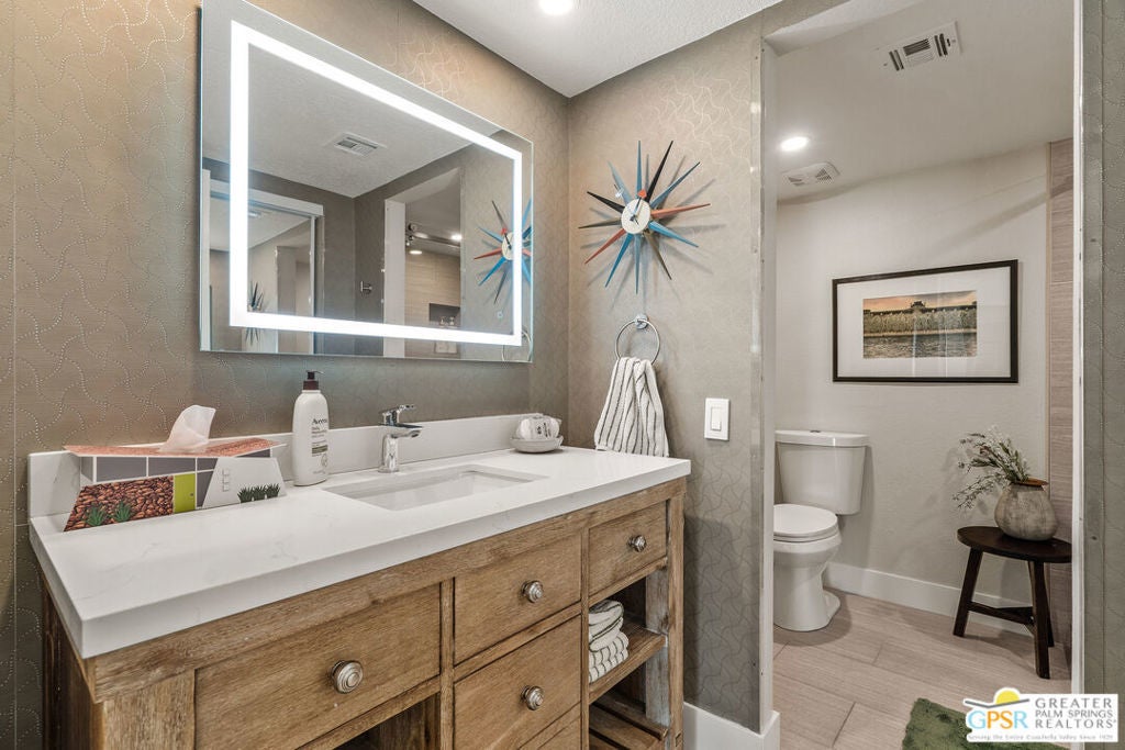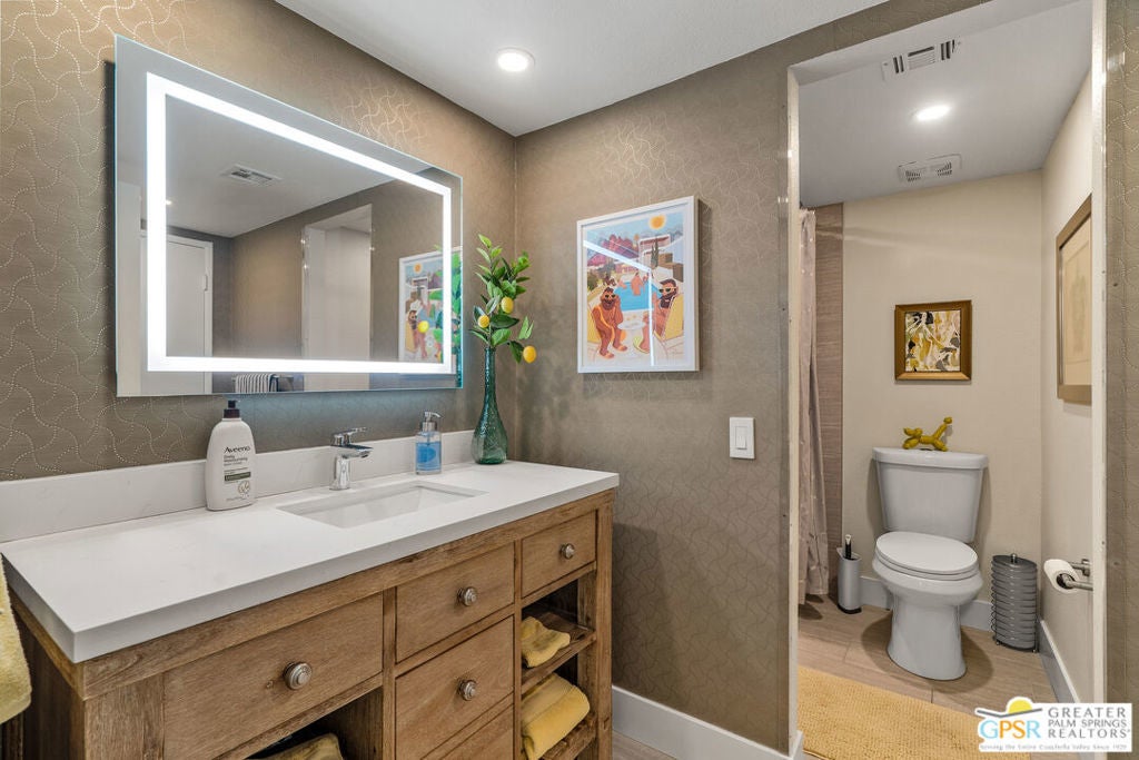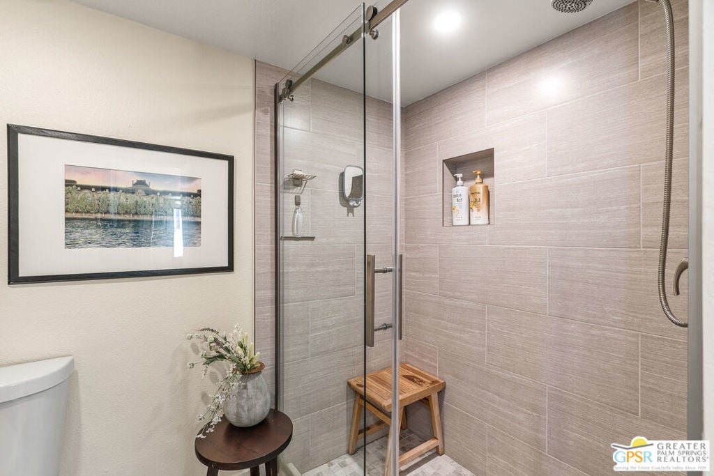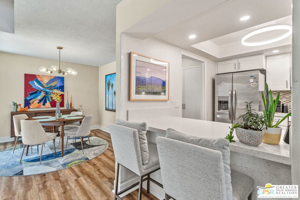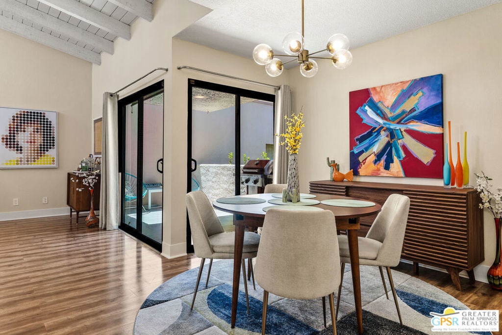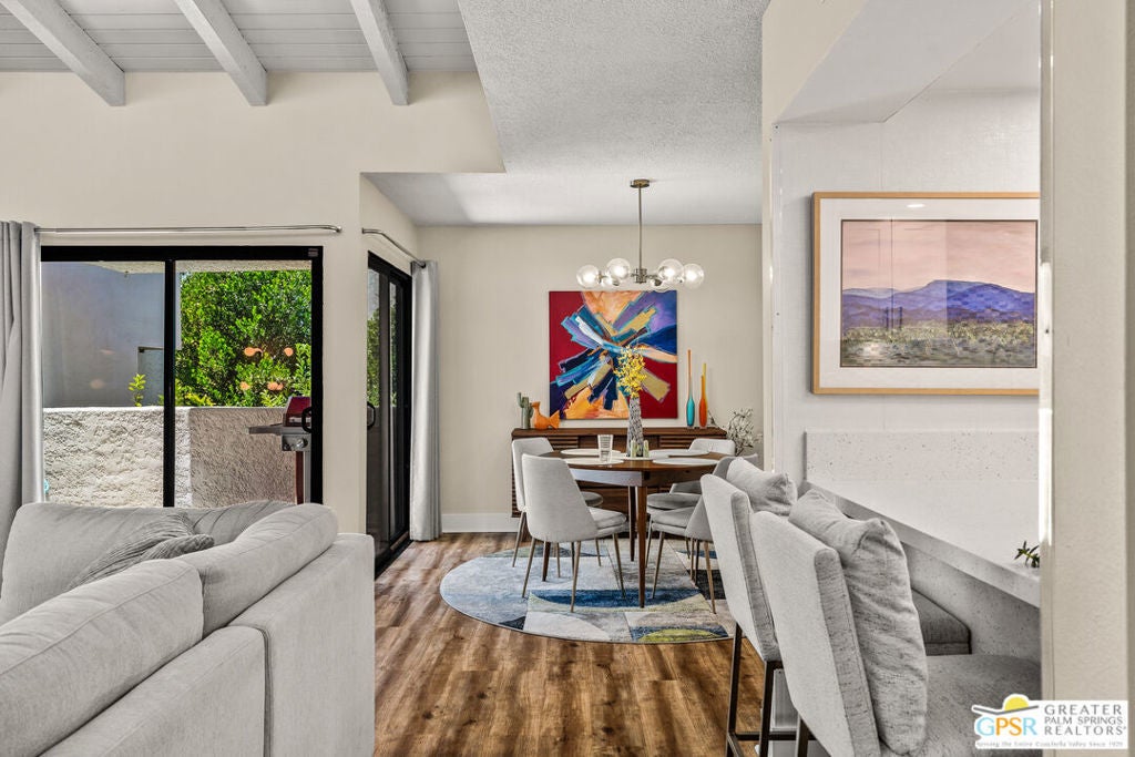 Another $20K price reduction - now priced well below the comps - the best deal in the area for a highly upgraded condo! Top floor 2BR/2BA condo at the sought after Versailles complex * On Fee Land * Extensively renovated in 2021 and further updated in 2025 * Open living/dining/kitchen * Dramatic living area with vaulted ceiling, clerestory windows and direct access to a private deck with western mountain views, perfect for indoor/outdoor entertaining * Dining area easily fits a table for 6 * Remodeled kitchen with quartz countertops, beautiful backsplash and stainless steel appliances including a 5-burner gas range * Primary bedroom with double closets and brand new closet system; remodeled en-suite bath with walk in shower and beautiful vanity; private deck with pool views * Remodeled guest bathroom with shower over tub * Guest bedroom with vaulted ceiling, walk in closet and private deck * In-unit laundry Newer laminate wood floors and Milgard sliders throughout * Newer American Heating and Air system * Brand new tile on all 3 decks * 1 car assigned parking with additional parking available * HOA Dues: $592/mo (includes garbage, water, insurance/EQ Insurance, professional management) * Central Palm Springs location with EZ access to the Smoke Tree shopping center Well run HOA with numerous amenities including 4 pools & spas and 2 tennis courts