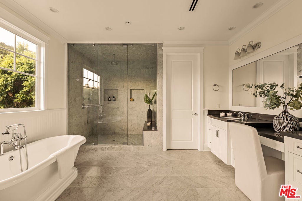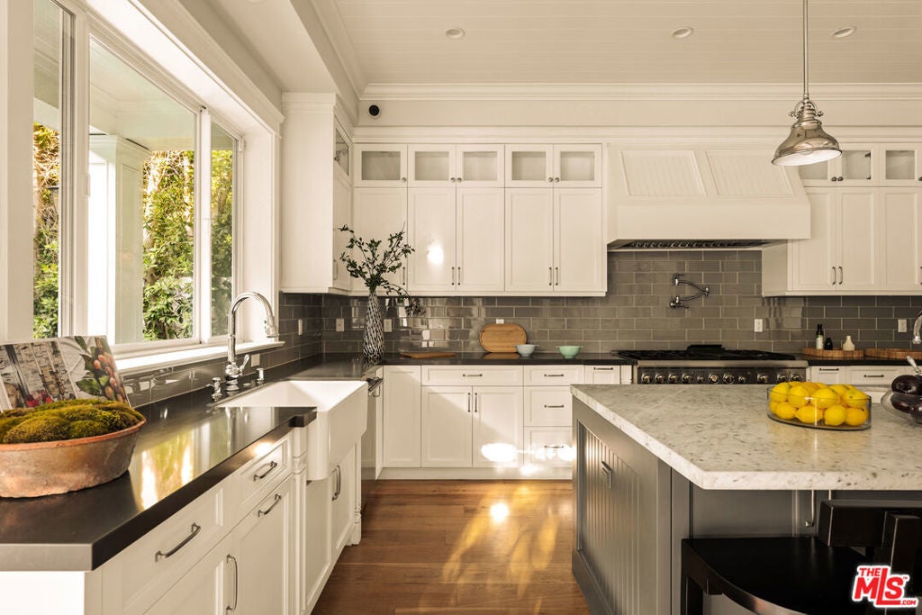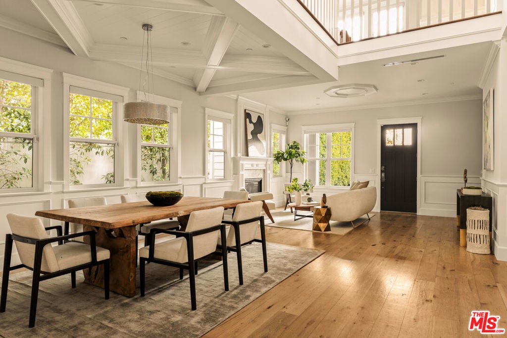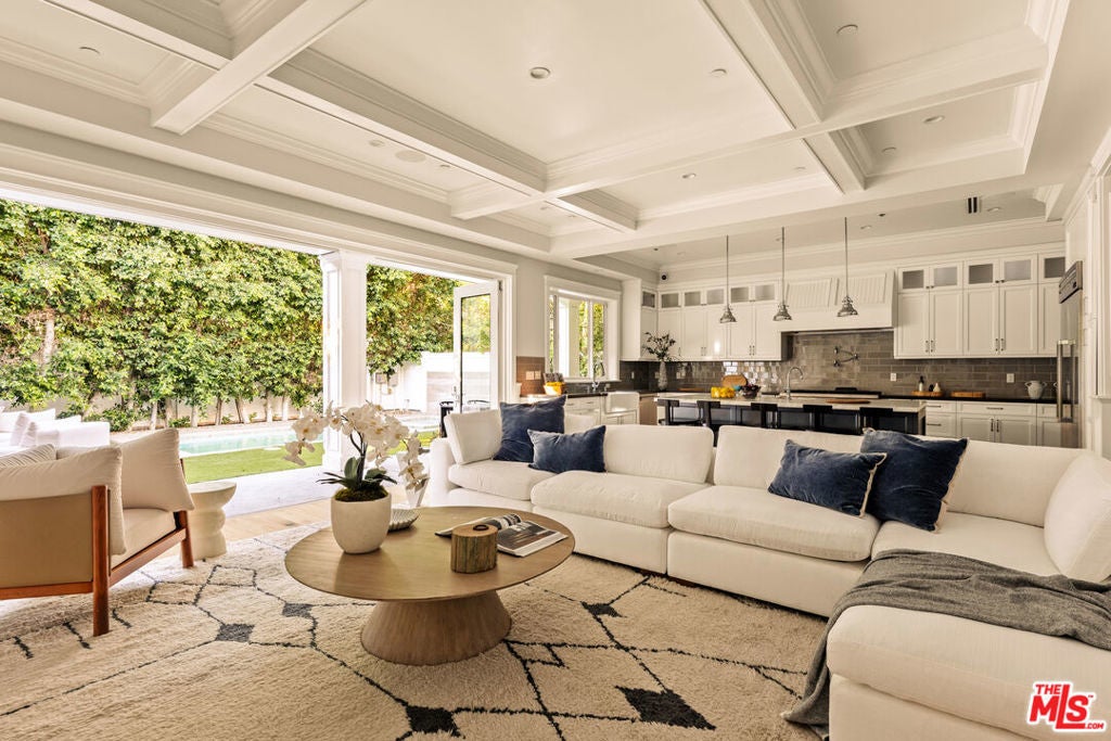 A newly reimagined Cape Cod retreat in the heart of Sherman Oaks, this 4-bedroom, 5-bathroom residence blends timeless design with modern sophistication across 3,815 square feet of living space. Soaring ceilings and expansive windows bathe the home in natural light, while refined details from coffered ceilings and wainscoting to white Carrera marble create an atmosphere of understated elegance.The formal living room, anchored by a stately fireplace, flows effortlessly into a dining room designed for intimate gatherings or grand entertaining. At the center of the home, the gourmet kitchen is a chef's dream, featuring custom cabinetry, a marble-topped island, Thermador appliances, and a walk-in pantry. A spacious family room with custom built-ins and folding glass doors opens to a covered patio, seamlessly merging indoor and outdoor living.Upstairs, the primary suite is a private sanctuary with cathedral ceilings, a fireplace lounge, and a private terrace overlooking lush treetops. The spa-inspired bath boasts dual vanities, a soaking tub, and an oversized shower with a built-in bench. A generous walk-in closet with custom built-ins completes this luxurious retreat. Three additional ensuite bedrooms and a versatile upstairs lounge offer comfort and flexibility for family or guests.Outdoors, the backyard unfolds into a private oasis with manicured lawns, a sparkling heated pool and spa with a soothing waterfall, and a covered terrace ideal for al fresco dining or relaxed evenings under the stars. Modern amenities including solar panels, a smart home system, surround sound, central vacuum, security cameras, and three fireplaces enhance both convenience and peace of mind.Located moments from the Sherman Oaks Galleria and Ventura Boulevard's dining and entertainment, this residence offers effortless luxury for those who seek "the good life."
