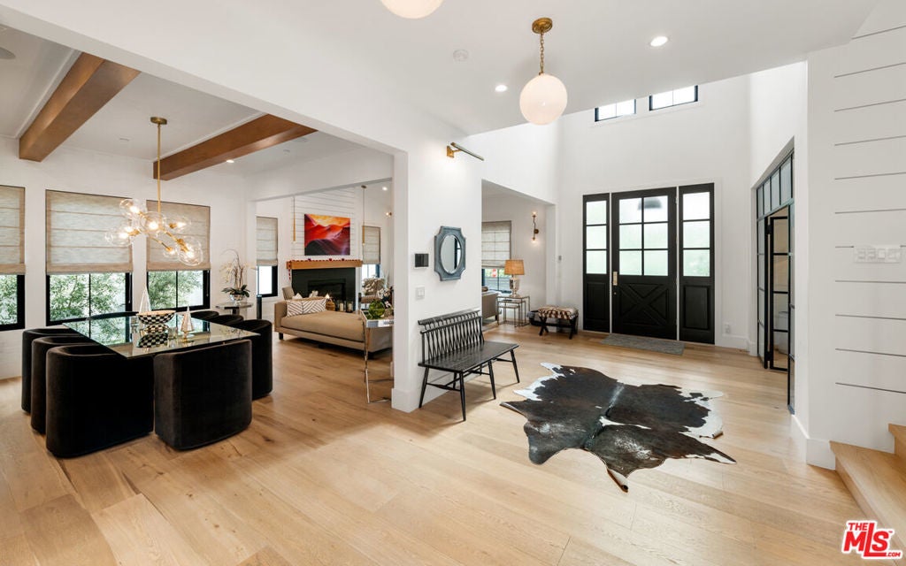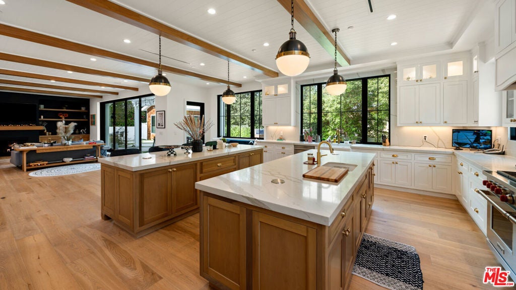 Available fully furnished. Welcome to this stunning modern-traditional home ideally situated on a quiet cul-de-sac in the highly sought-after enclave of Royal Oaks, Encino. Built in 2018, this newer construction (not a remodel) offers a limited builder warranty and is designed for the discerning buyer who values both elegance and modern conveniences. With impeccable curb appeal, the gated property immediately captures attention, inviting guests into a soaring foyer with high ceilings and European oak floors throughout. The elegant living room features a grand fireplace, seamlessly flowing into a formal dining room perfect for hosting. A glass-enclosed private office with custom built-ins provides a refined workspace with exquisite finishes. The heart of the home is the chef's gourmet kitchen, a true masterpiece. It boasts double islands with Calcutta quartz counters, a 60-inch Wolf range, a 72-inch built-in Sub-Zero fridge, a large walk-in pantry, and a butler's pantry. The spacious breakfast area is adjacent to a cozy family room, which showcases beautiful built-ins and a fireplace. Floor-to-ceiling pocket glass doors open to a sprawling entertainer's yard, creating a perfect indoor-outdoor flow. The main floor also offers a state-of-the-art home theater, a stunning powder room, a mudroom, and a wrought-iron, glass-enclosed wine cellar. Upstairs, the romantic master suite is a true retreat, featuring a sitting area and a dual-sided fireplace. The two expansive walk-in closets and a spa-like master bath complete with a soaking tub, glass rain shower, dual sinks, makeup vanity, and two water closets offer ultimate comfort and luxury. The entertainer's yard is a spectacular oasis with a zero-edge sparkling pool and spa, a fire pit, a built-in barbecue, and a pool house with its own bathroom. Thoughtfully designed for modern living, this home includes a full metal roof throughout, all underground utilities, a whole-house water filtration system, and smart home technology with integrated Control4. Additional features include a three-car garage and the option to purchase the home partially furnished. This exceptional residence offers a luxurious lifestyle just moments away from Encino's finest shops, dining, and more.