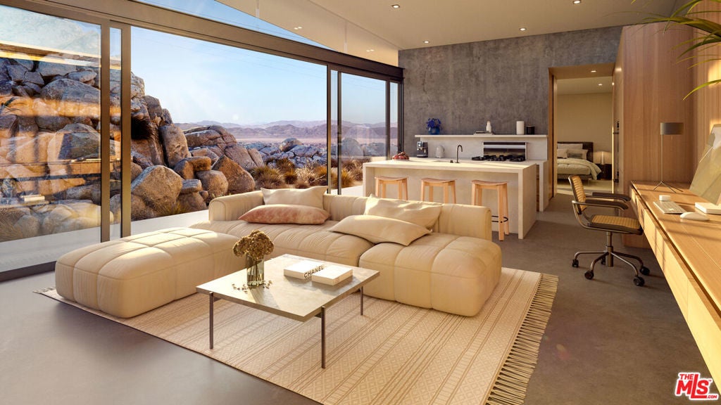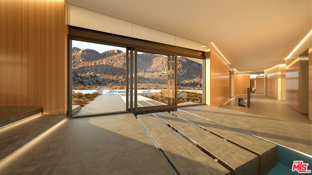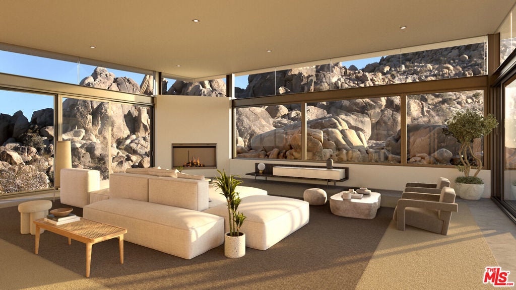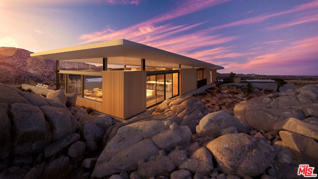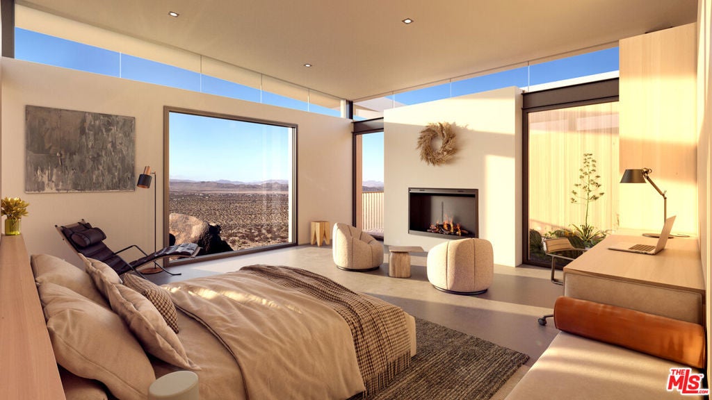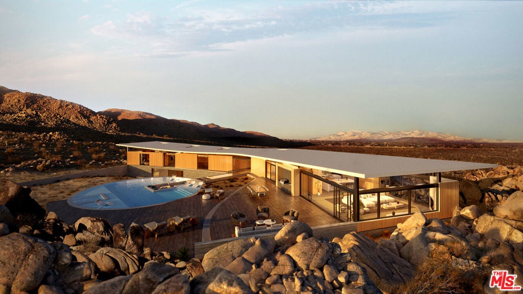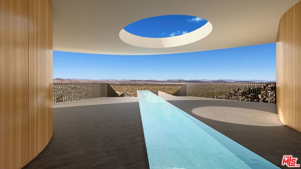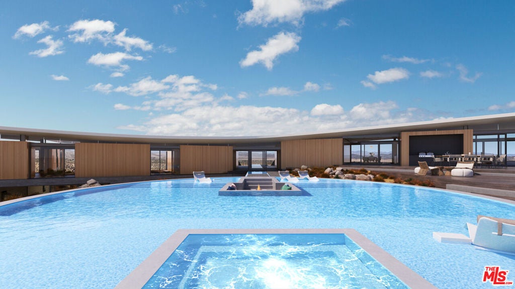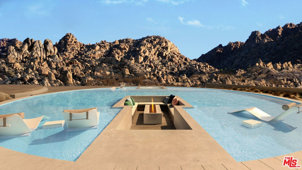 Offered as a pre-construction opportunity, Project Aerie featured in Dwell and Robb Report redefines the modern desert retreat. Set against the majestic stillness of Joshua Tree, this visionary architectural estate is a rare fusion of bold design and natural serenity. Spanning over 6,000 square feet, the 4-bedroom, 5.5-bath main residence is a symphony of light, water, and space. A dramatic circular pool weaves through the structure, joined by a spa, firepit, and baja shelf blurring the lines between indoors and out. The primary suite is a private sanctuary with a fireplace, lounge, dual walk-in closets, and spa-inspired bath. Two additional ensuite bedrooms and a flexible fourth bedroom/home office provide ample space for guests or work. The lower level impresses with a state-of-the-art gym, sauna, cold plunge, and a 12-seat screening room with built-in bar. A detached guest house adds 700 square feet of additional living, complete with a lounge, kitchen, bedroom, bath, and covered parking. With a 3-car garage and 2-car carport, every detail of desert luxury has been considered. All renderings and video are true to the property's natural layout accurately reflecting the land's contours, native boulders, and panoramic vistas.