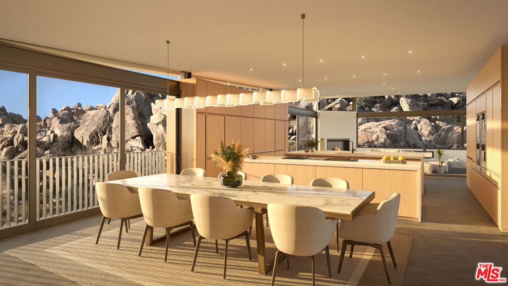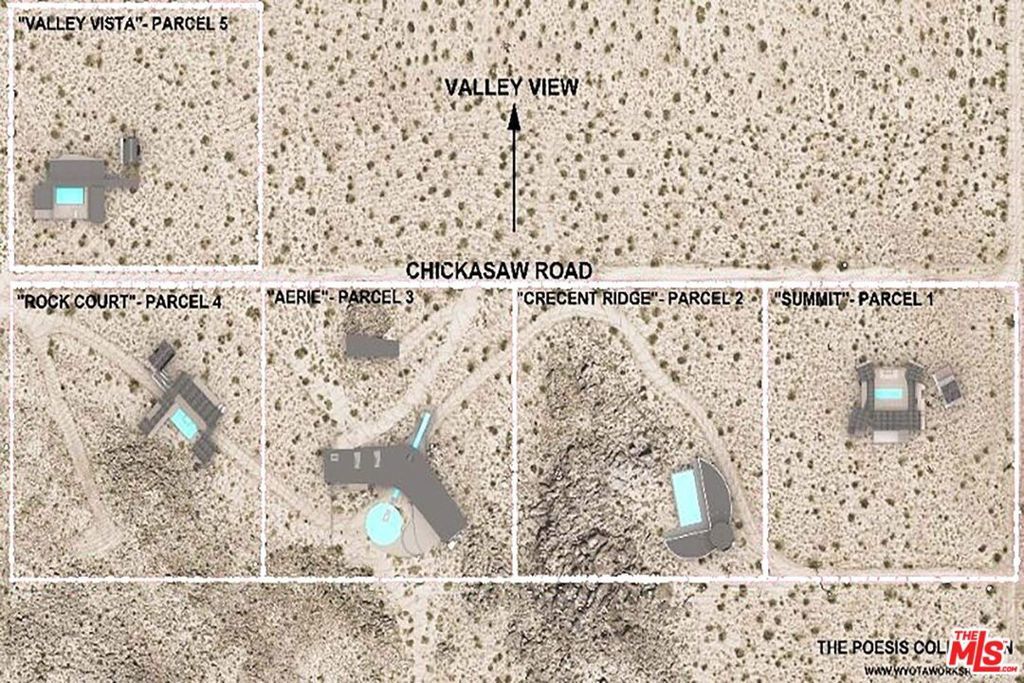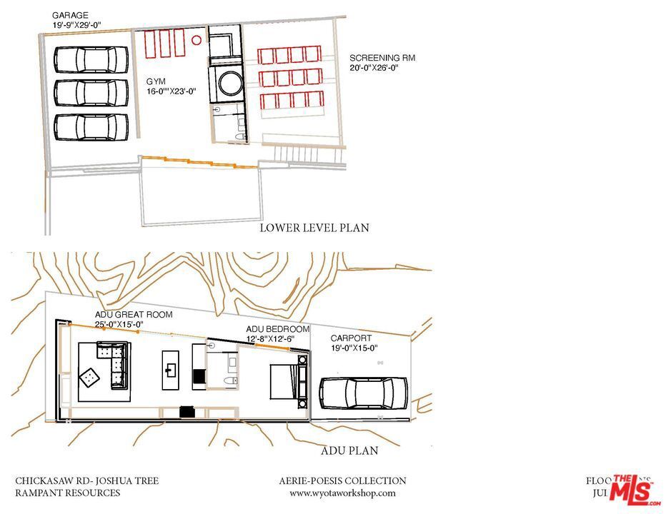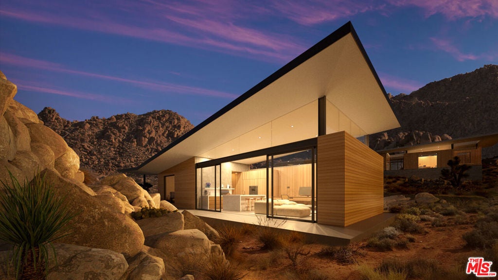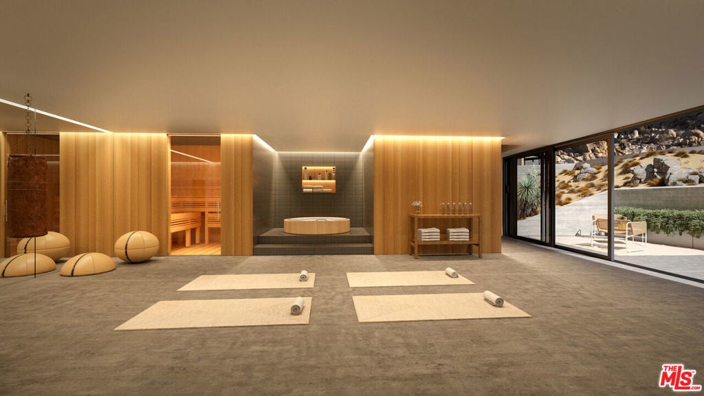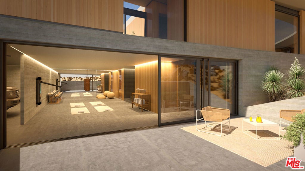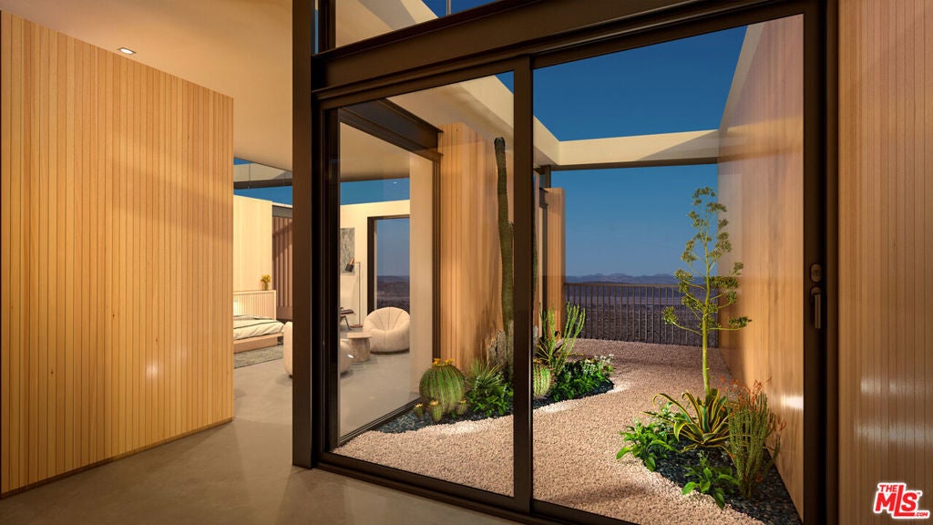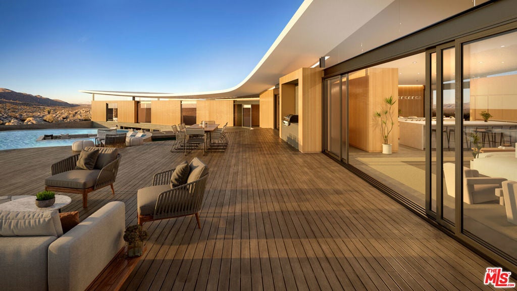 Offered as a pre-construction opportunity, Project Aerie featured in Dwell and Robb Report redefines the modern desert retreat. Set against the majestic stillness of Joshua Tree, this visionary architectural estate is a rare fusion of bold design and natural serenity. Spanning over 6,000 square feet, the 4-bedroom, 5.5-bath main residence is a symphony of light, water, and space. A dramatic circular pool weaves through the structure, joined by a spa, firepit, and baja shelf blurring the lines between indoors and out. The primary suite is a private sanctuary with a fireplace, lounge, dual walk-in closets, and spa-inspired bath. Two additional ensuite bedrooms and a flexible fourth bedroom/home office provide ample space for guests or work. The lower level impresses with a state-of-the-art gym, sauna, cold plunge, and a 12-seat screening room with built-in bar. A detached guest house adds 700 square feet of additional living, complete with a lounge, kitchen, bedroom, bath, and covered parking. With a 3-car garage and 2-car carport, every detail of desert luxury has been considered. All renderings and video are true to the property's natural layout accurately reflecting the land's contours, native boulders, and panoramic vistas.